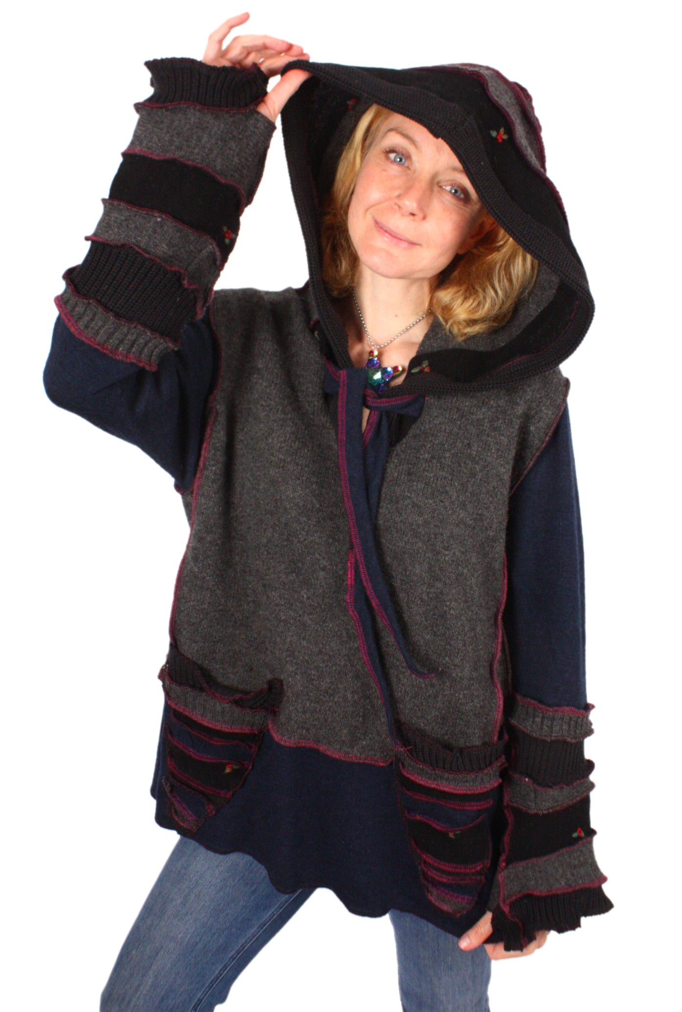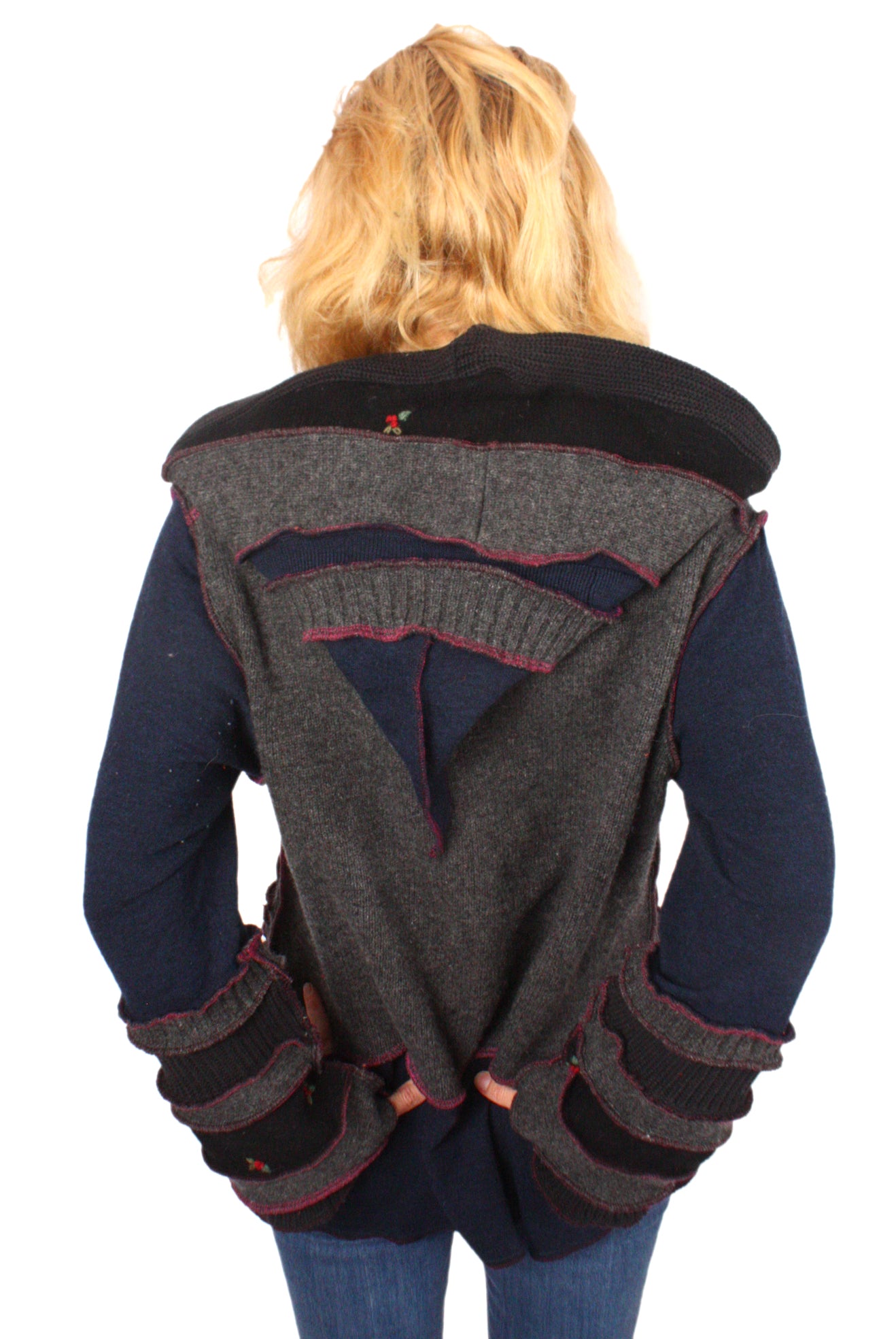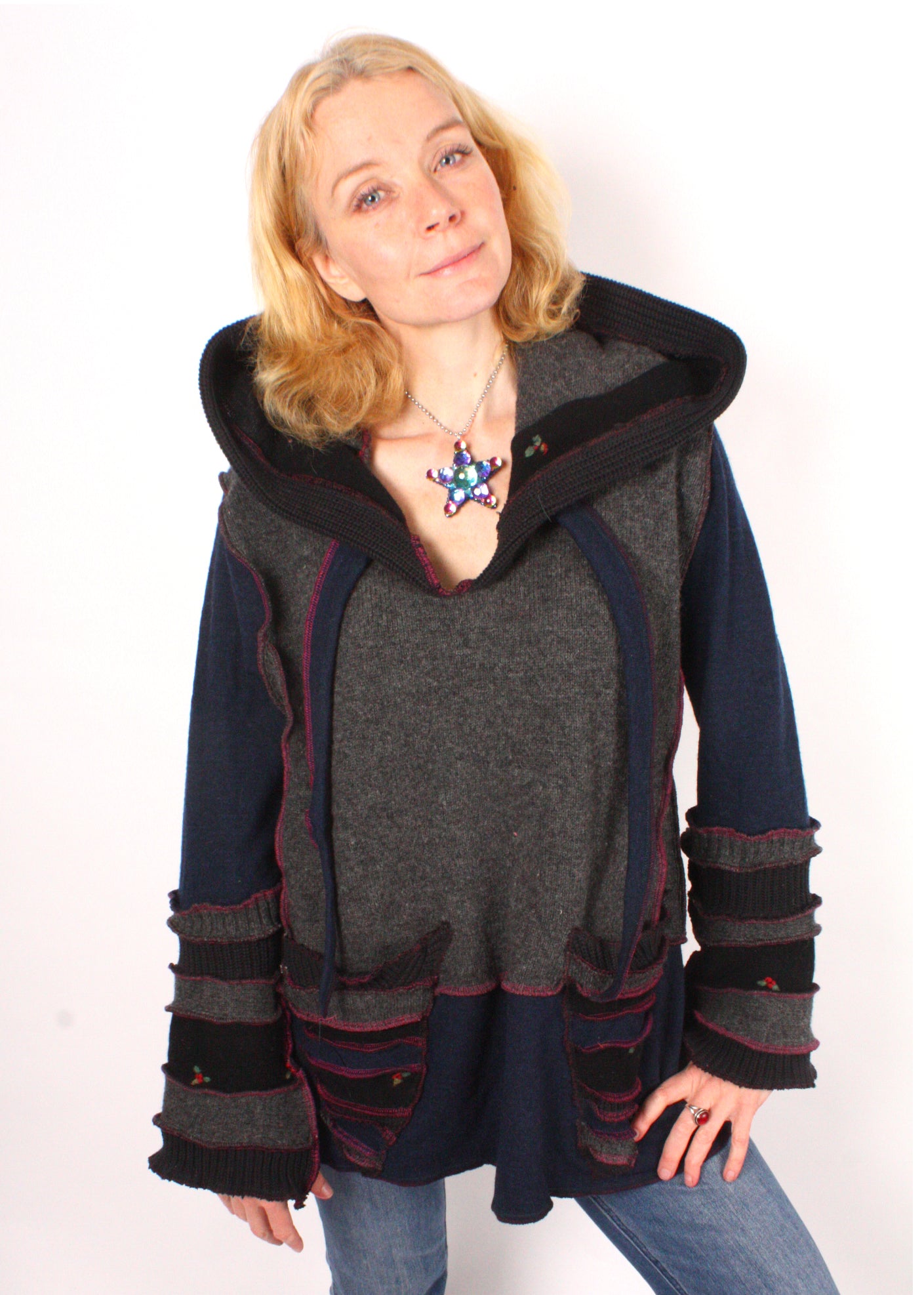 Each Katwise sweater is one-of-a-kind, sewn by me in my attic. They are perfectly imperfect, sometimes borderline wonky. They are all upcycled from sweaters I find in my vast thrift shopping expeditions. There is a huge variety in the texture and stretchiness of these knits, so no two are ever quite alike.