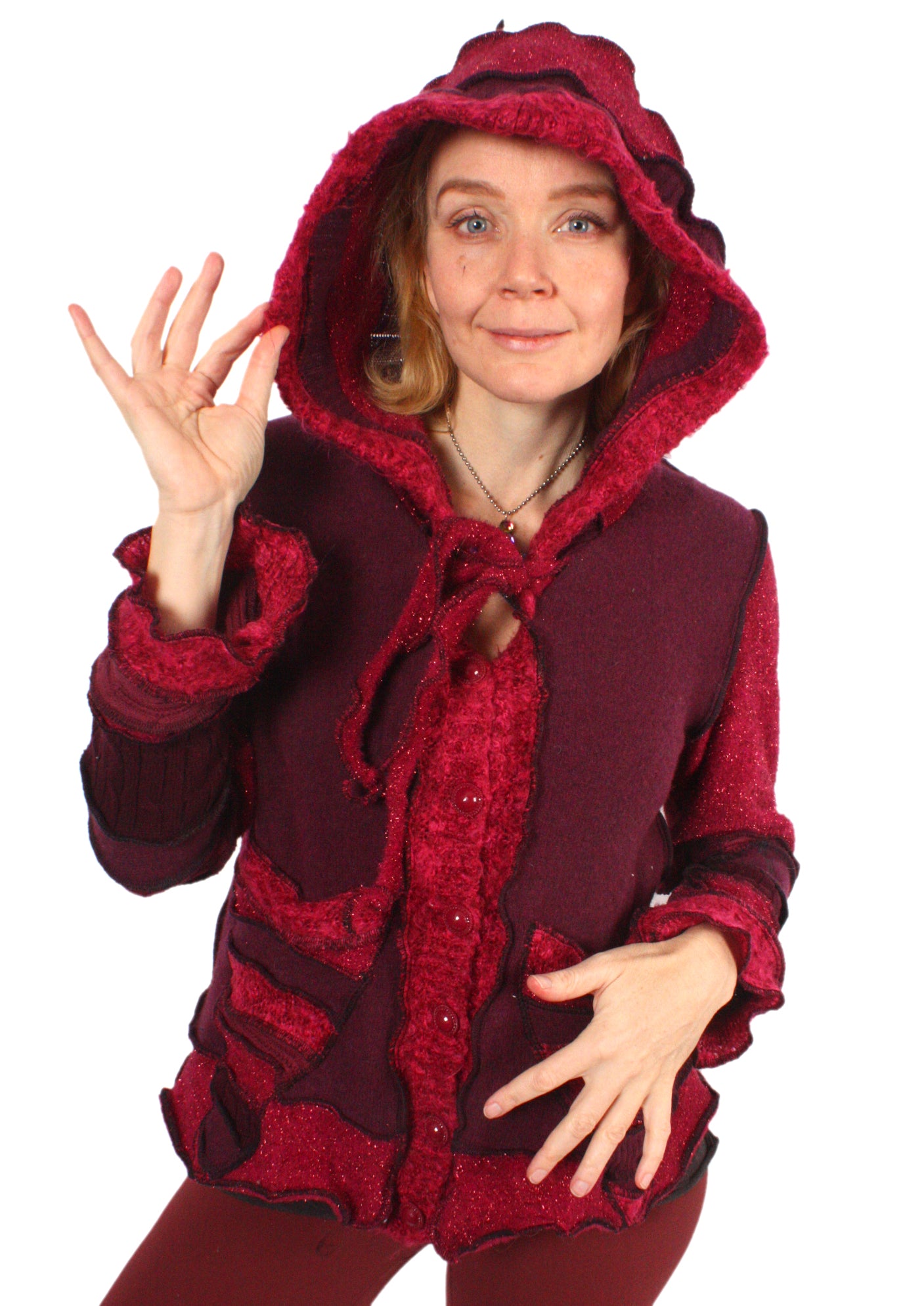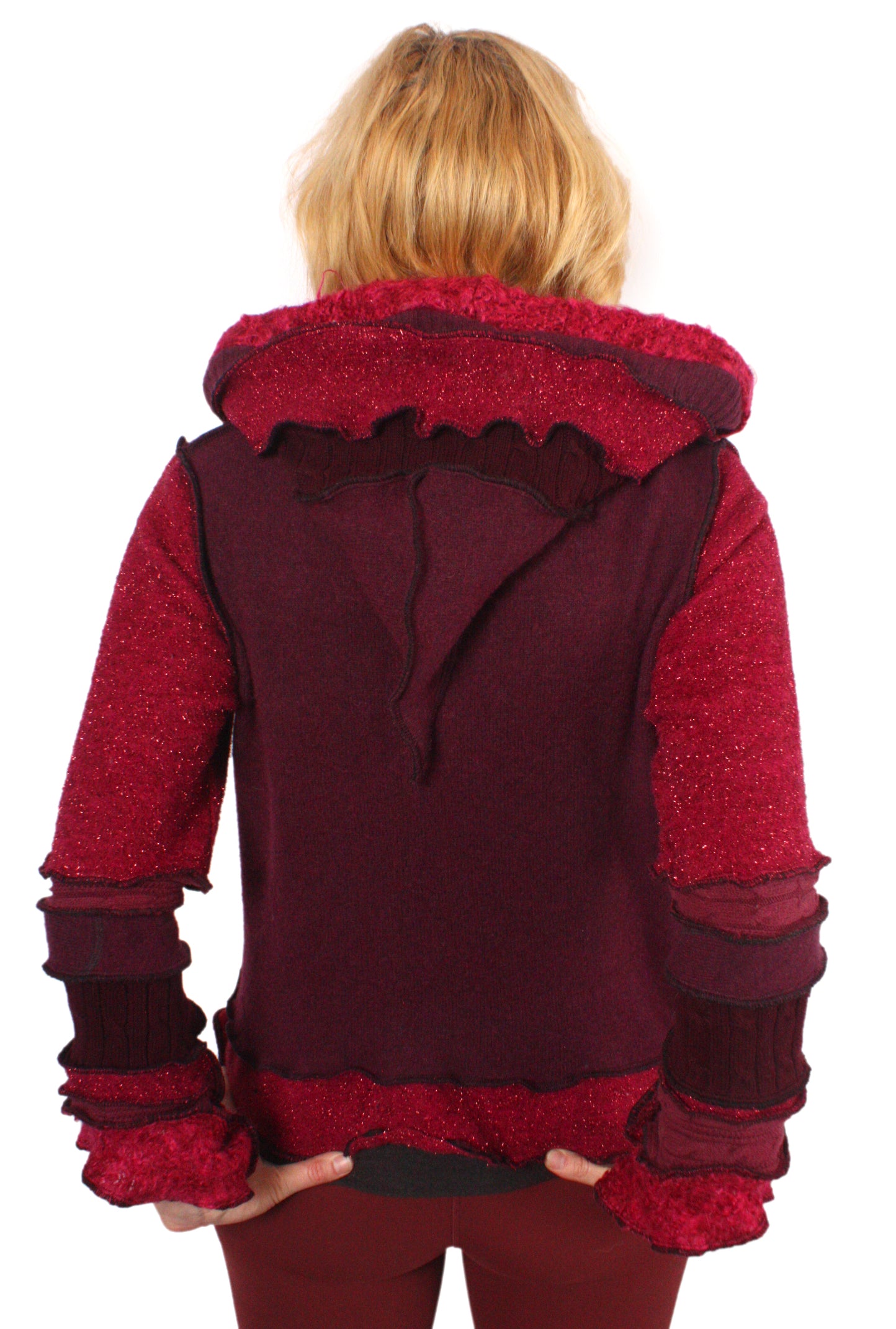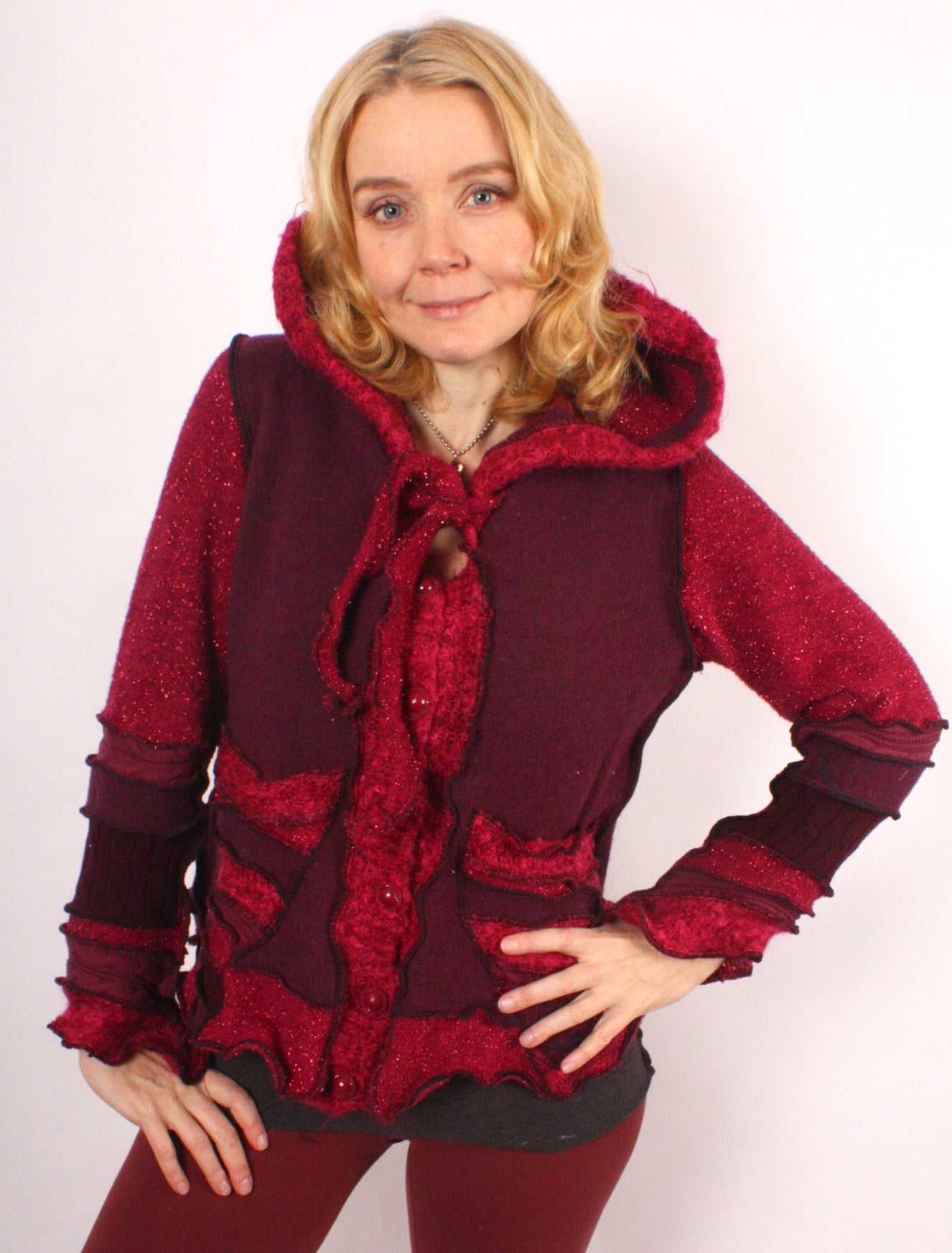 When Harry Met Sally is a sparkly cardigan of rosy burgundy and fuchsia. It features spectacular tinsel fuzz and cool geometric buttons. It's mostly wool, cotton, and nylon sparkle.