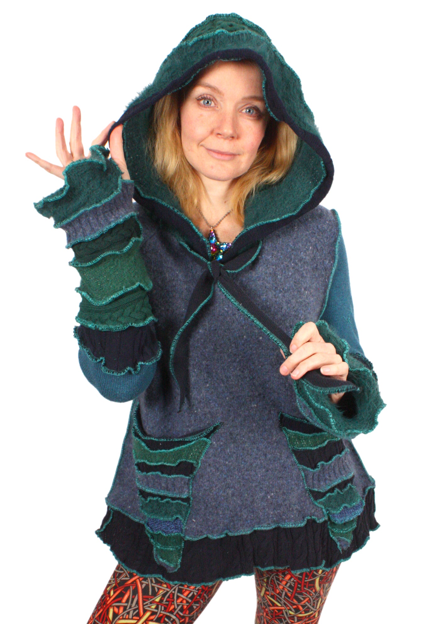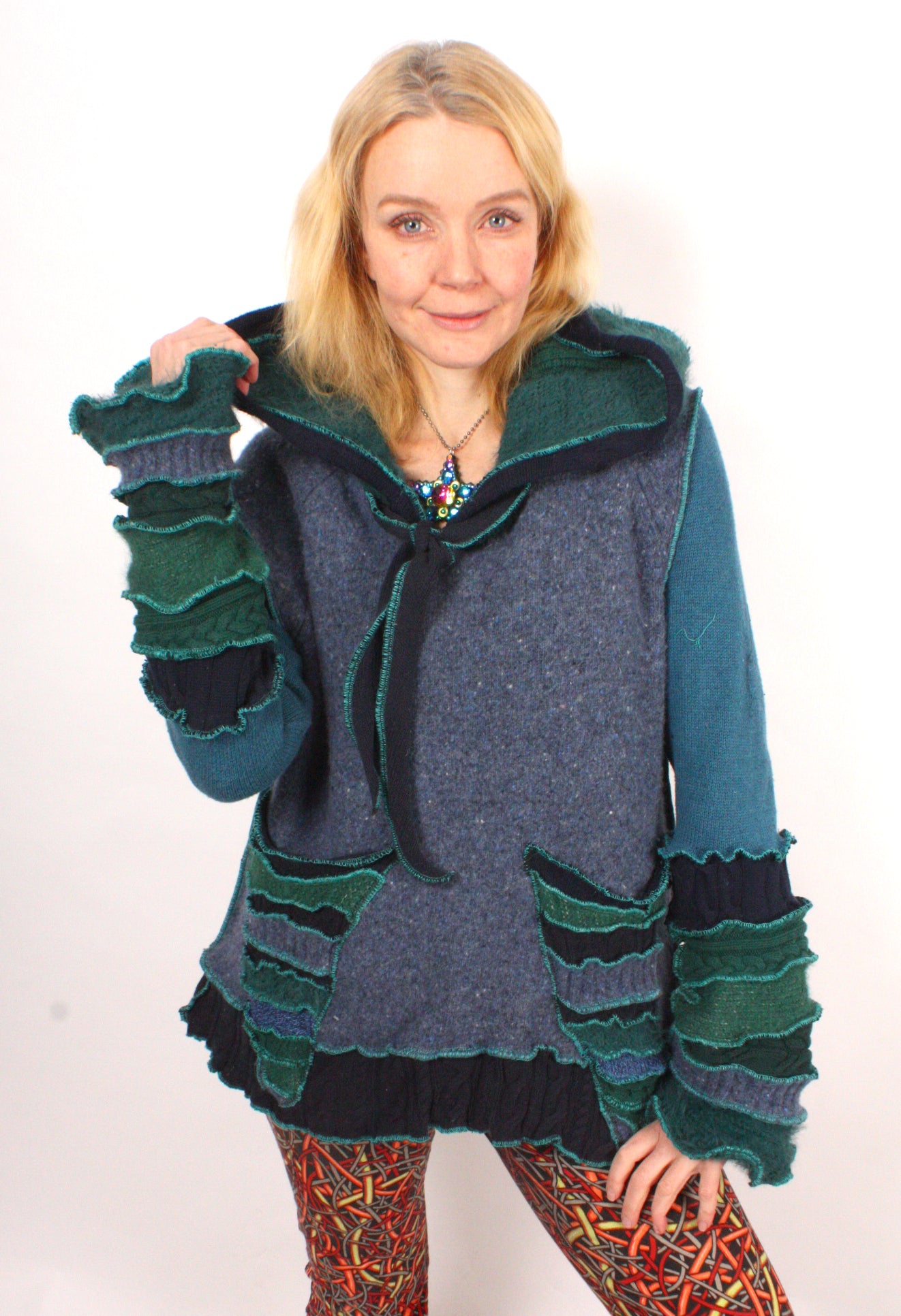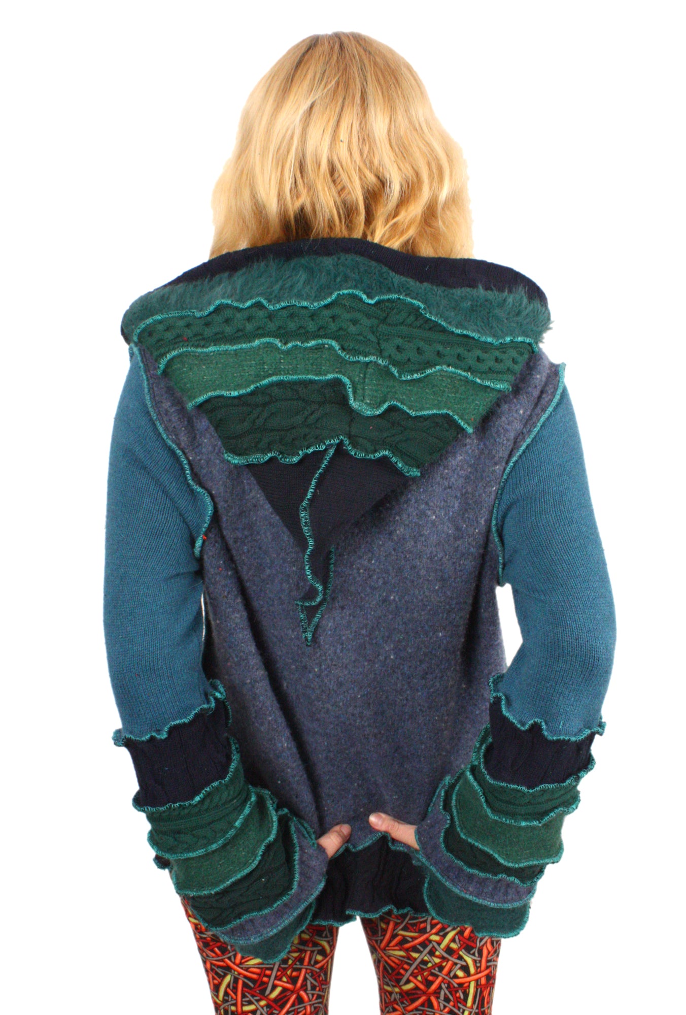 Each Katwise sweater is one-of-a-kind, sewn by me in my attic. They are perfectly imperfect, sometimes borderline wonky. They are all upcycled from sweaters I find in my vast thrift shopping expeditions. There is a huge variety in the texture and stretchiness of these knits, so no two are ever quite alike.