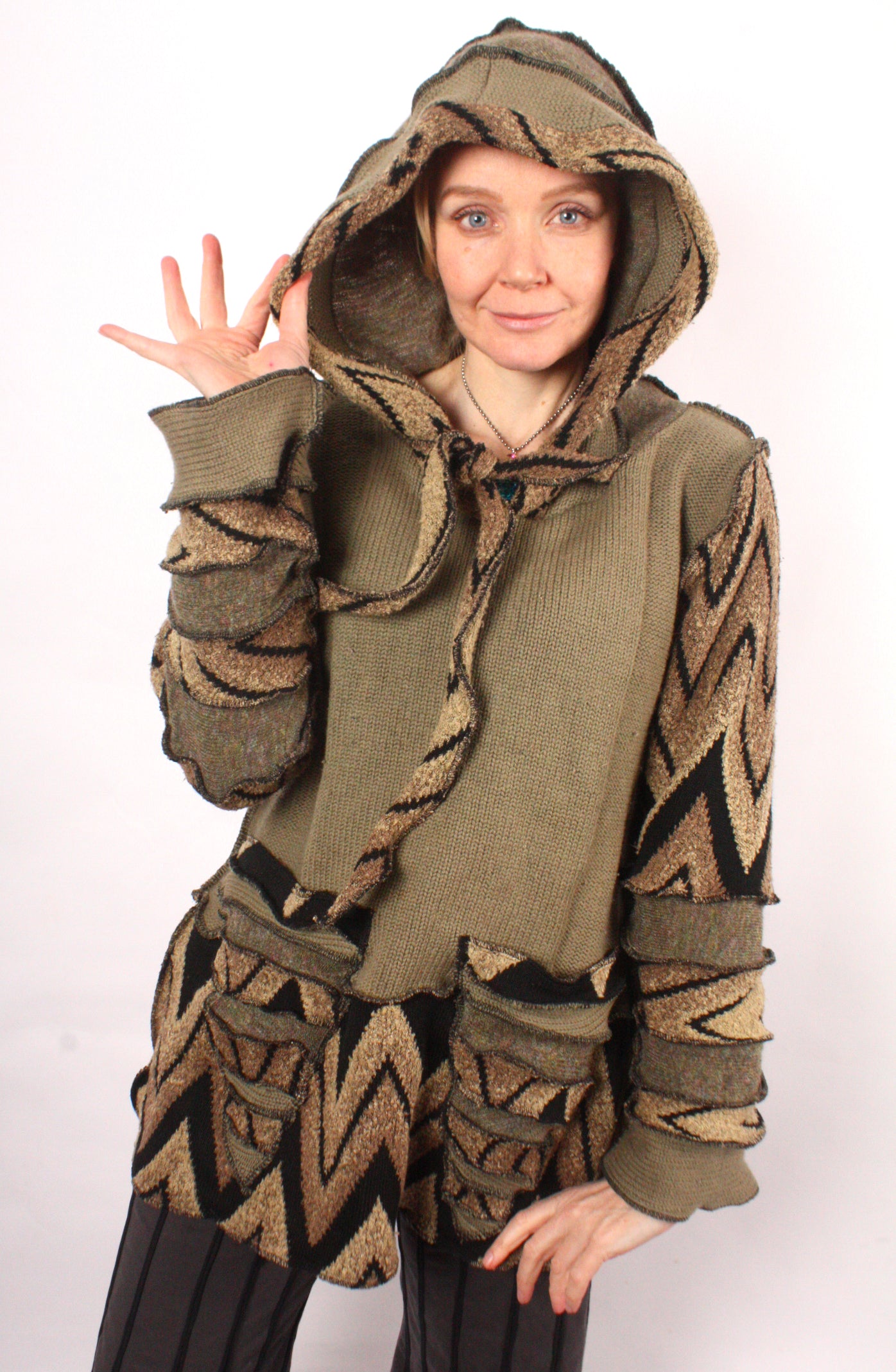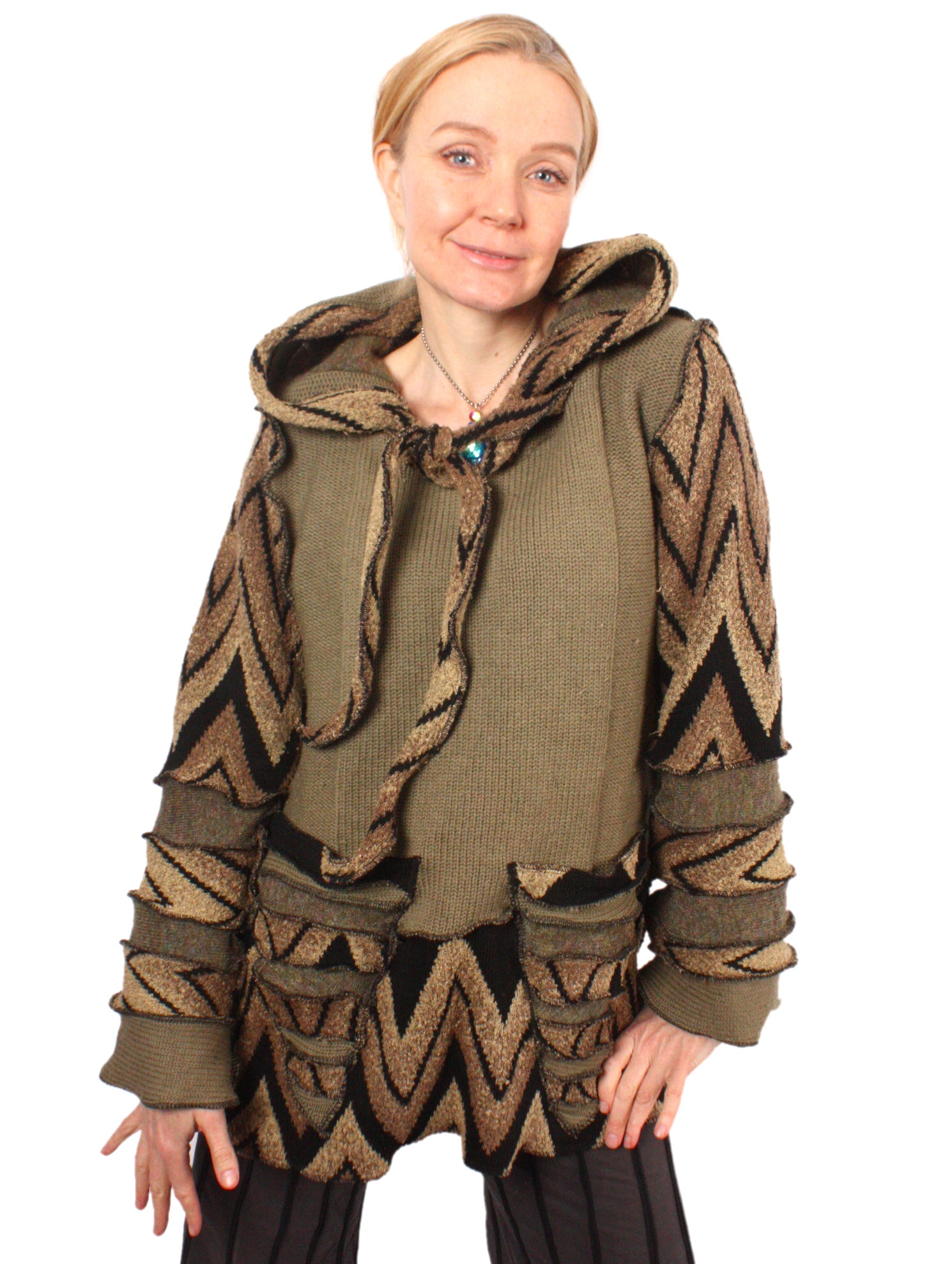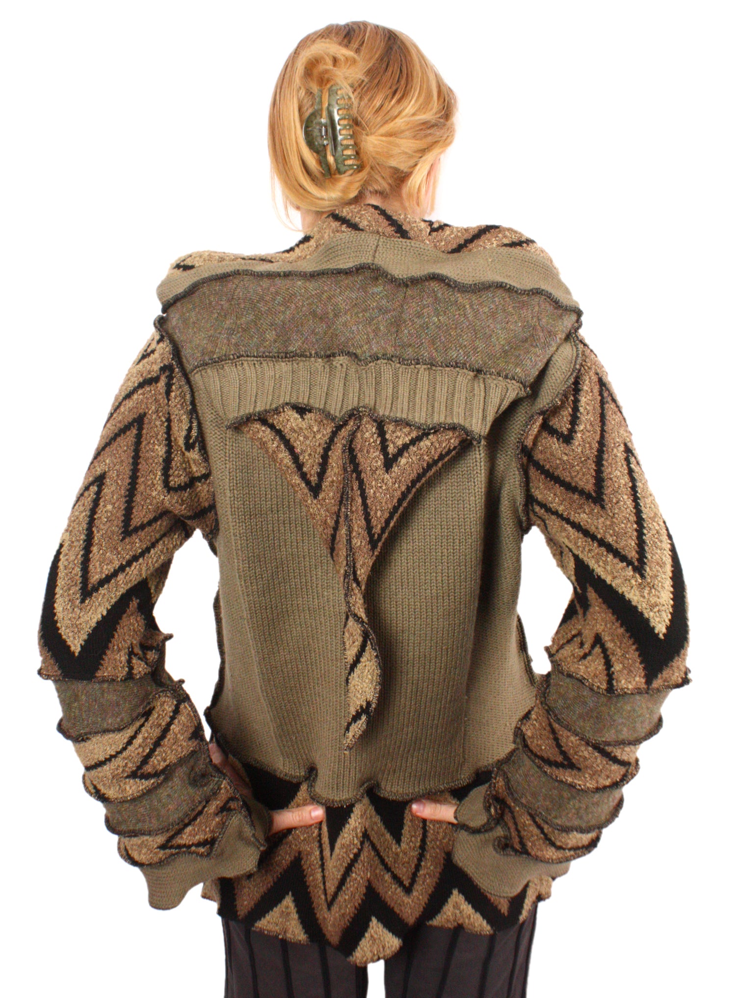 Each Katwise sweater is one-of-a-kind, sewn by me in my attic. They are perfectly imperfect, sometimes borderline wonky. They are all upcycled from sweaters I find in my vast thrift shopping expeditions. There is a huge variety in the texture and stretchiness of these knits, so no two are ever quite alike.