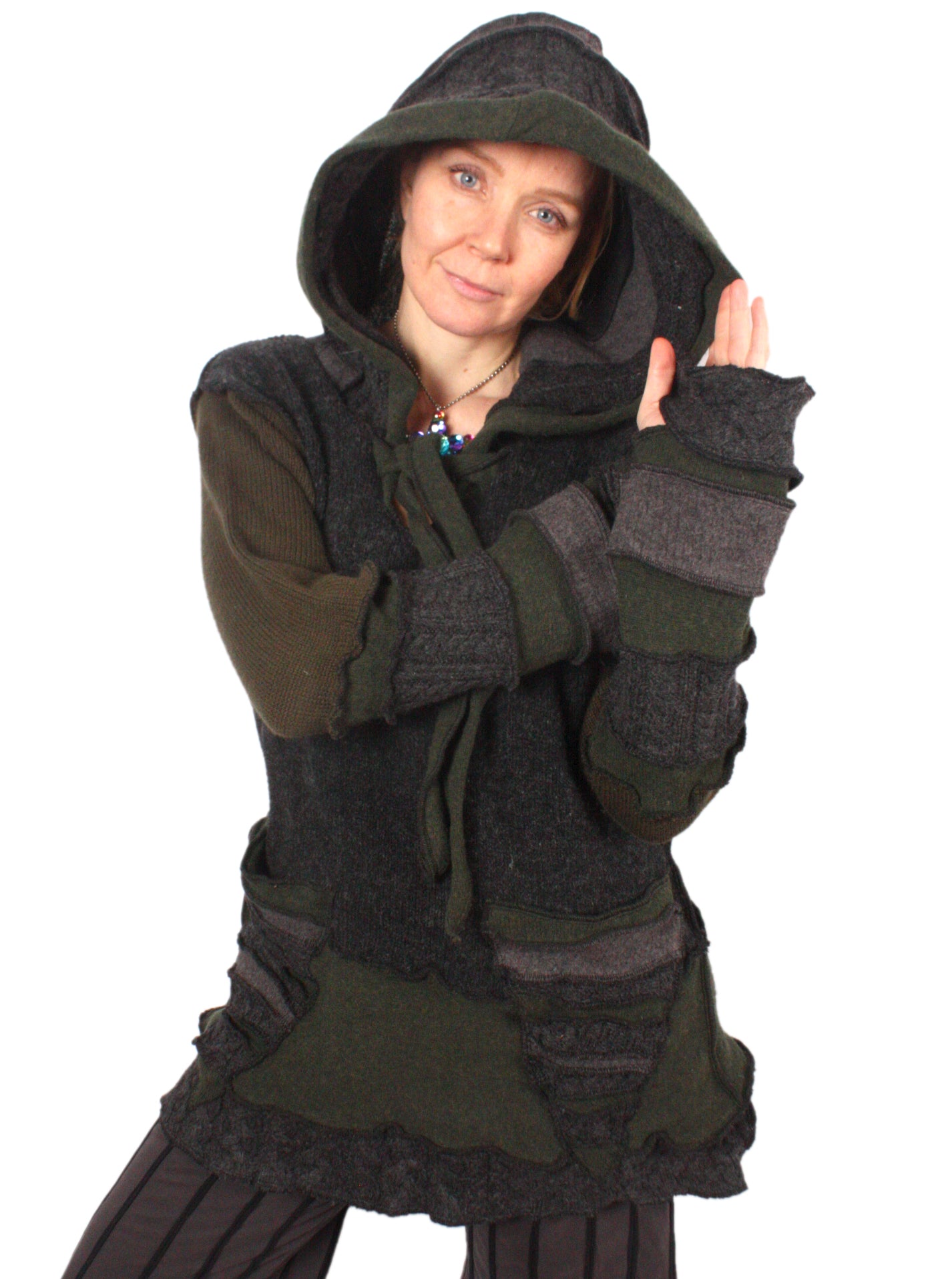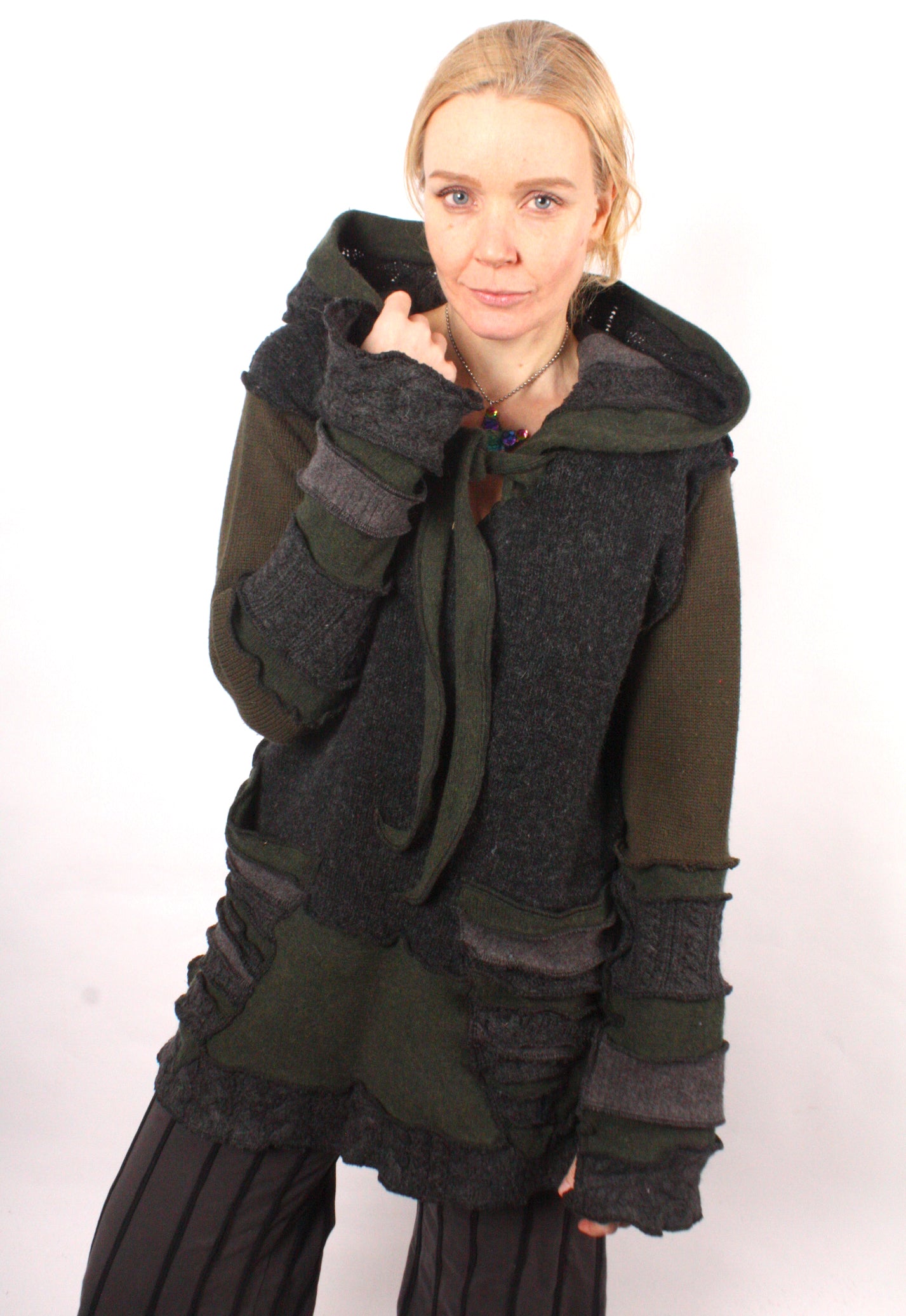 Each Katwise sweater is one-of-a-kind, sewn by me in my attic. They are perfectly imperfect, sometimes borderline wonky. They are all upcycled from sweaters I find in my vast thrift shopping expeditions. There is a huge variety in the texture and stretchiness of these knits, so no two are ever quite alike.