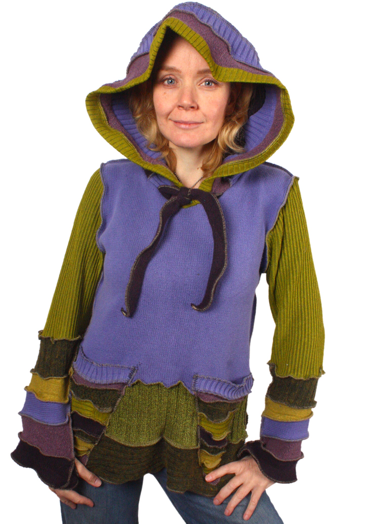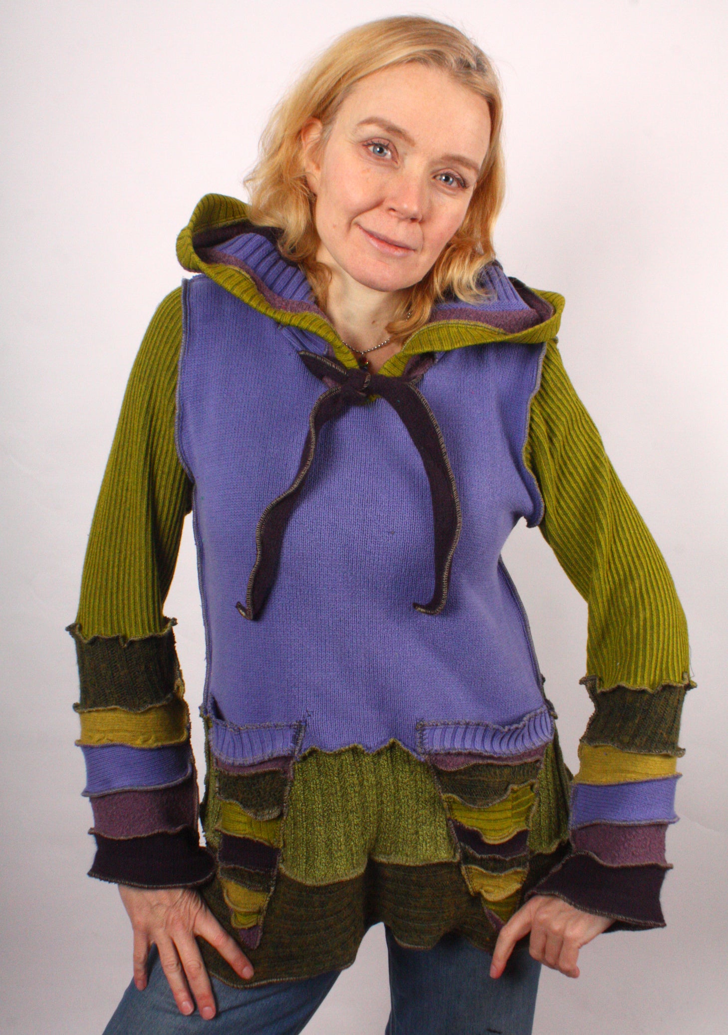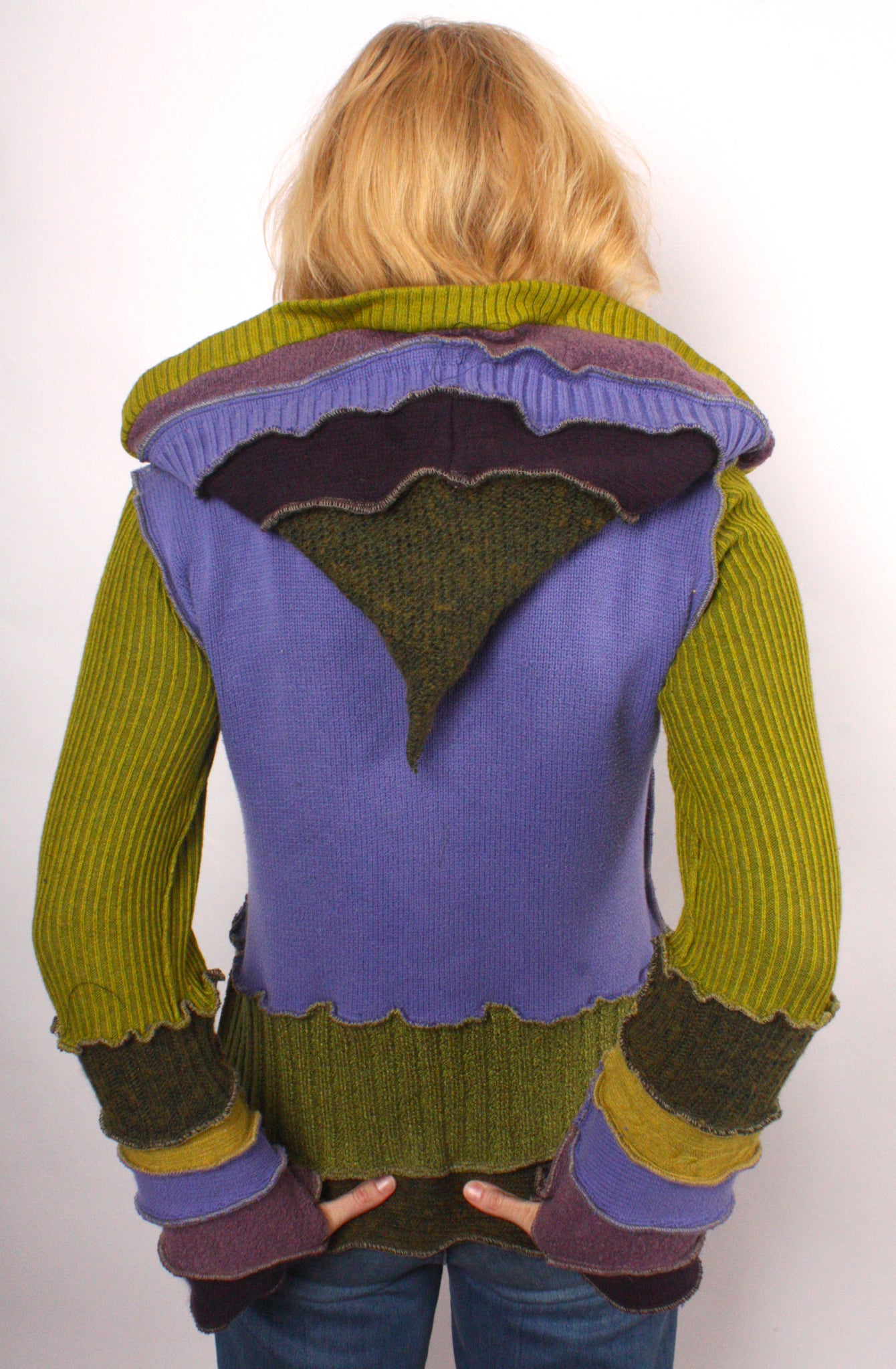 Each Katwise sweater is one-of-a-kind, sewn by me in my attic. They are perfectly imperfect, sometimes borderline wonky. They are all upcycled from sweaters I find in my vast thrift shopping expeditions. There is a huge variety in the texture and stretchiness of these knits, so no two are ever quite alike.