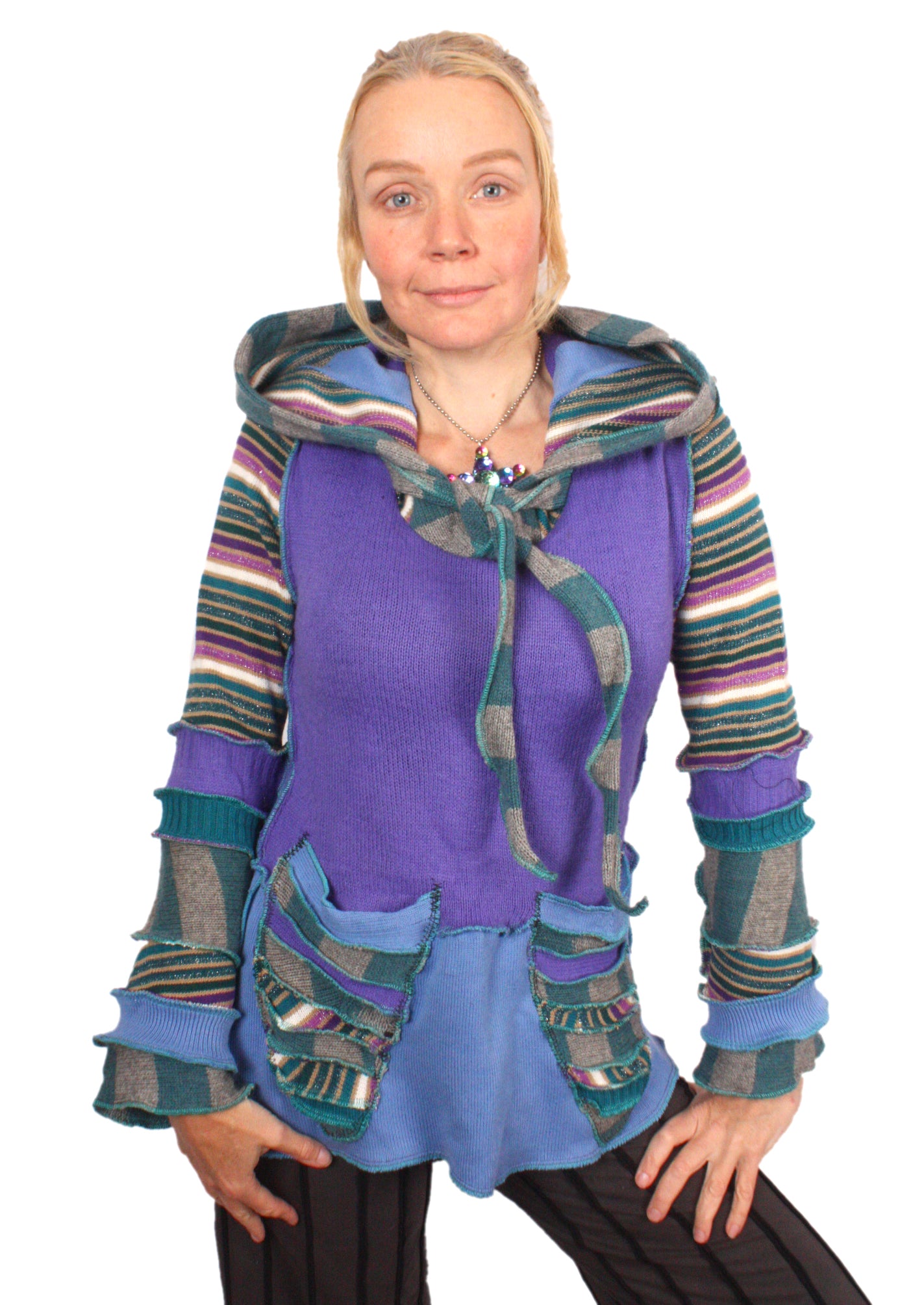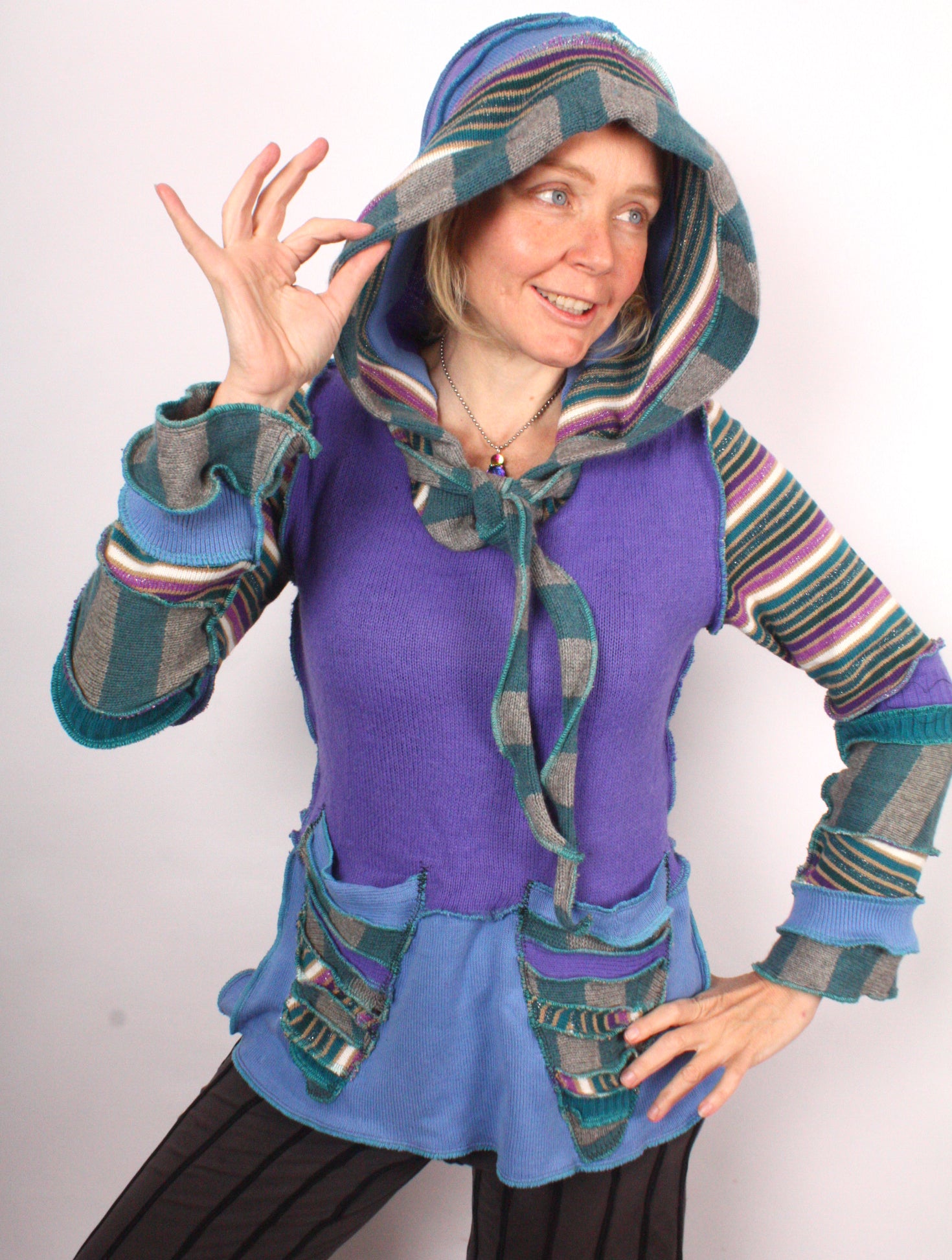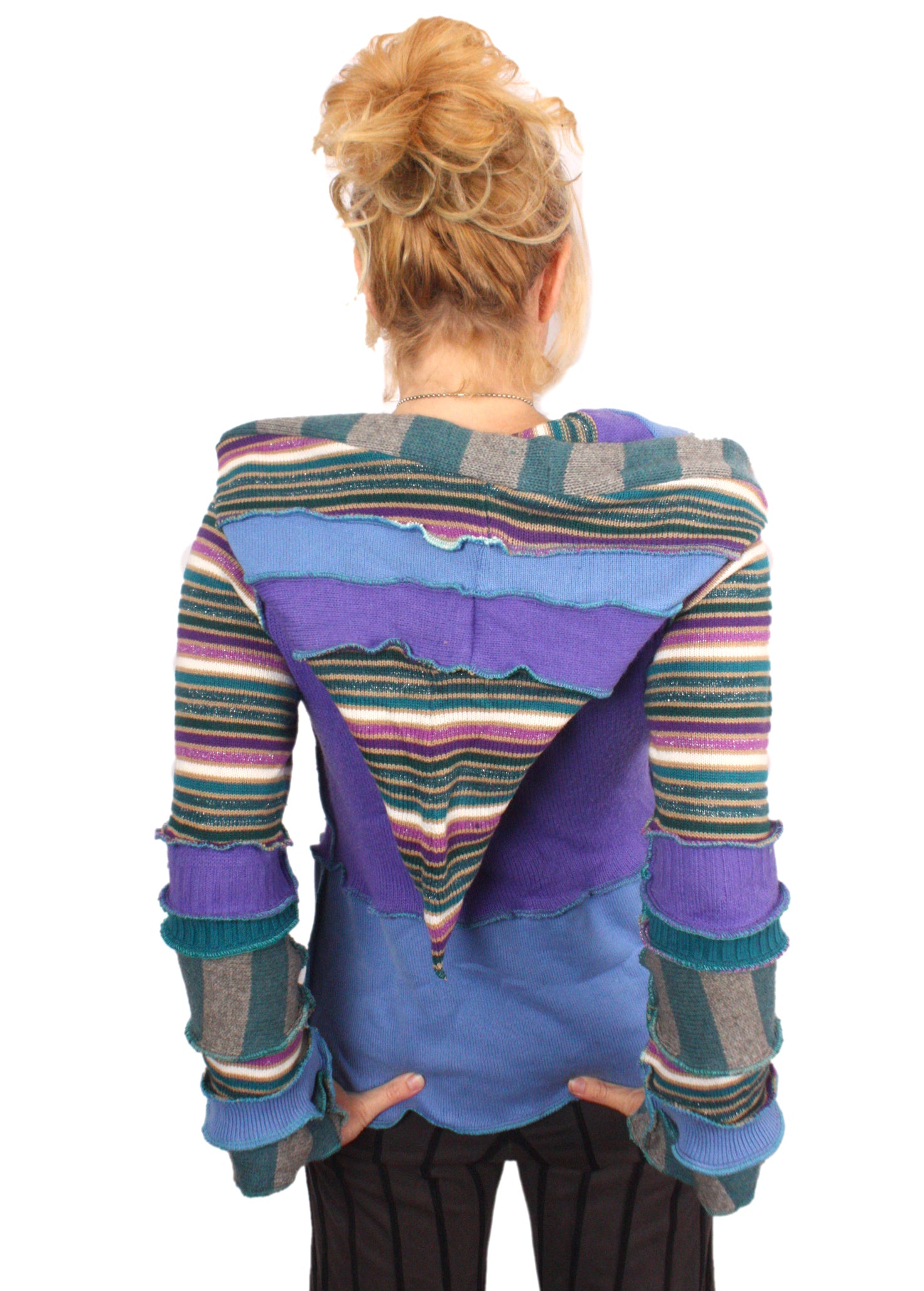 Each Katwise sweater is one-of-a-kind, sewn by me in my attic. They are perfectly imperfect, sometimes borderline wonky. They are all upcycled from sweaters I find in my vast thrift shopping expeditions. There is a huge variety in the texture and stretchiness of these knits, so no two are ever quite alike.