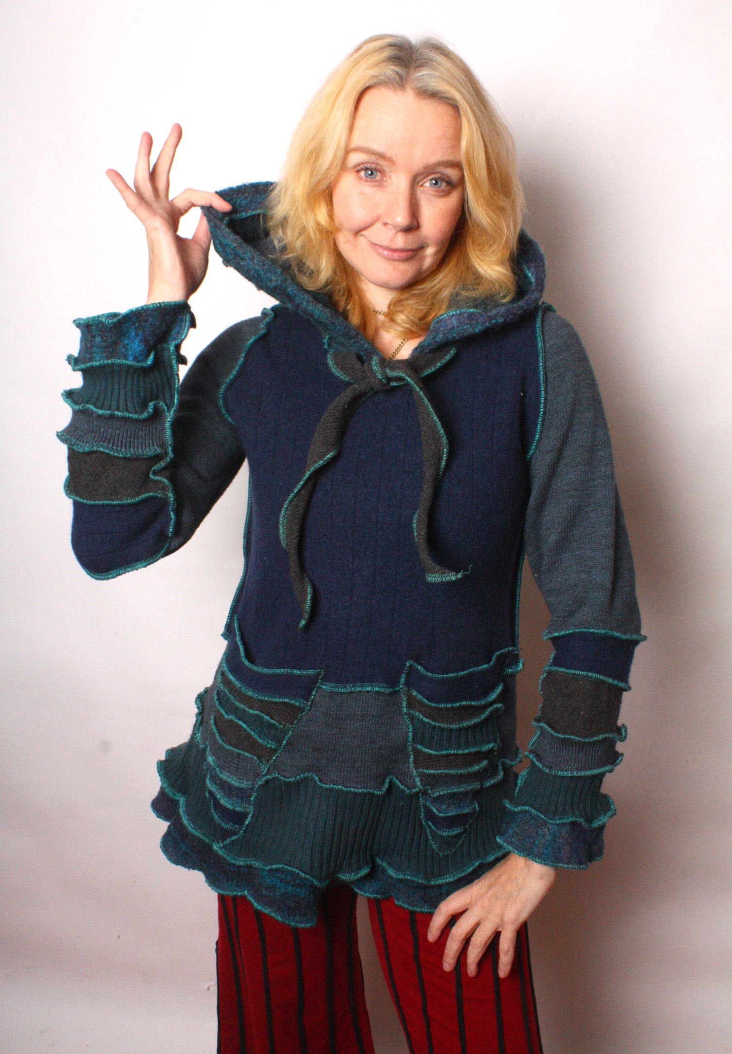 Each Katwise sweater is one-of-a-kind, sewn by me in my attic. They are perfectly imperfect, sometimes borderline wonky. They are all upcycled from sweaters I find in my vast thrift shopping expeditions. There is a huge variety in the texture and stretchiness of these knits, so no two are ever quite alike.