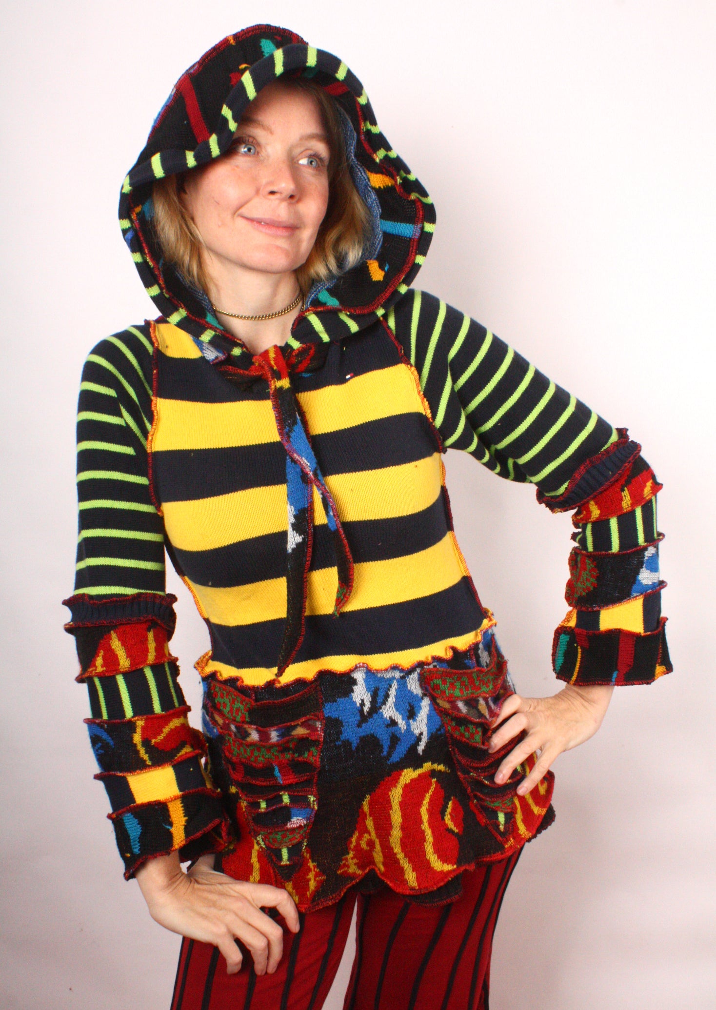 Each Katwise sweater is one-of-a-kind, sewn by me in my attic. They are perfectly imperfect, sometimes borderline wonky. They are all upcycled from sweaters I find in my vast thrift shopping expeditions. There is a huge variety in the texture and stretchiness of these knits, so no two are ever quite alike.