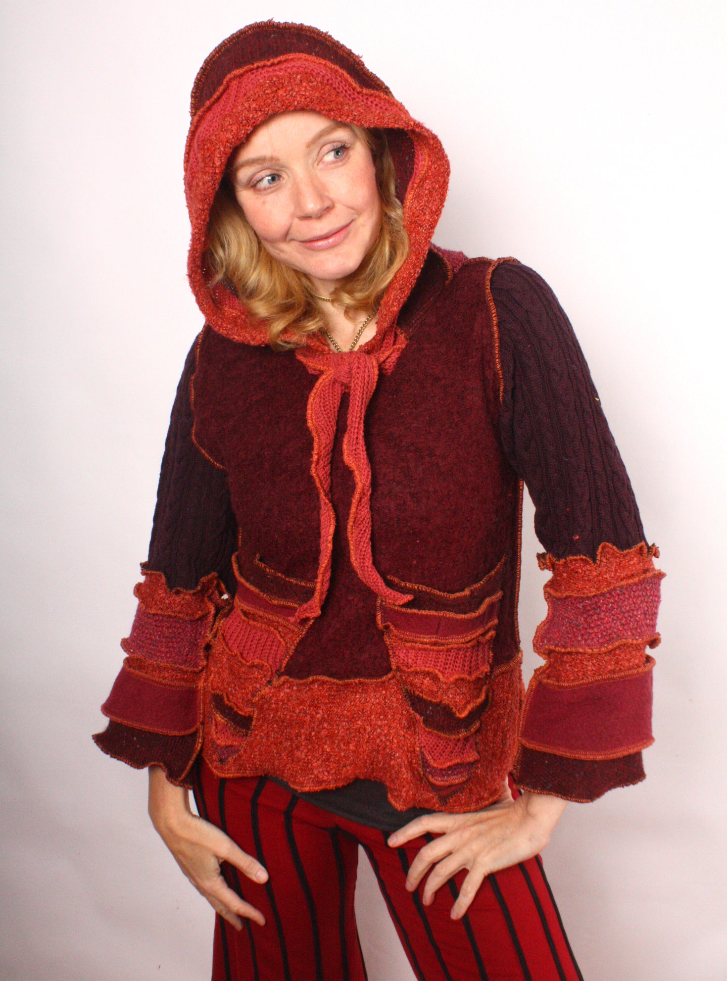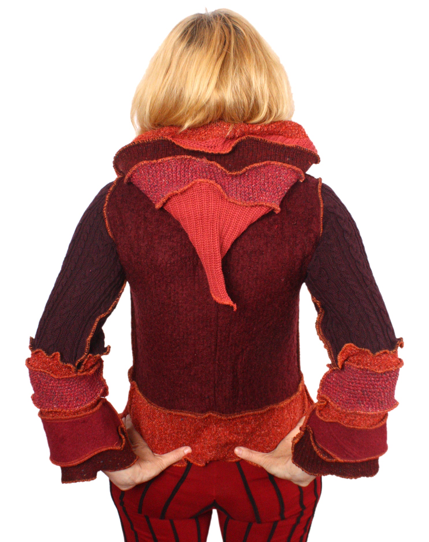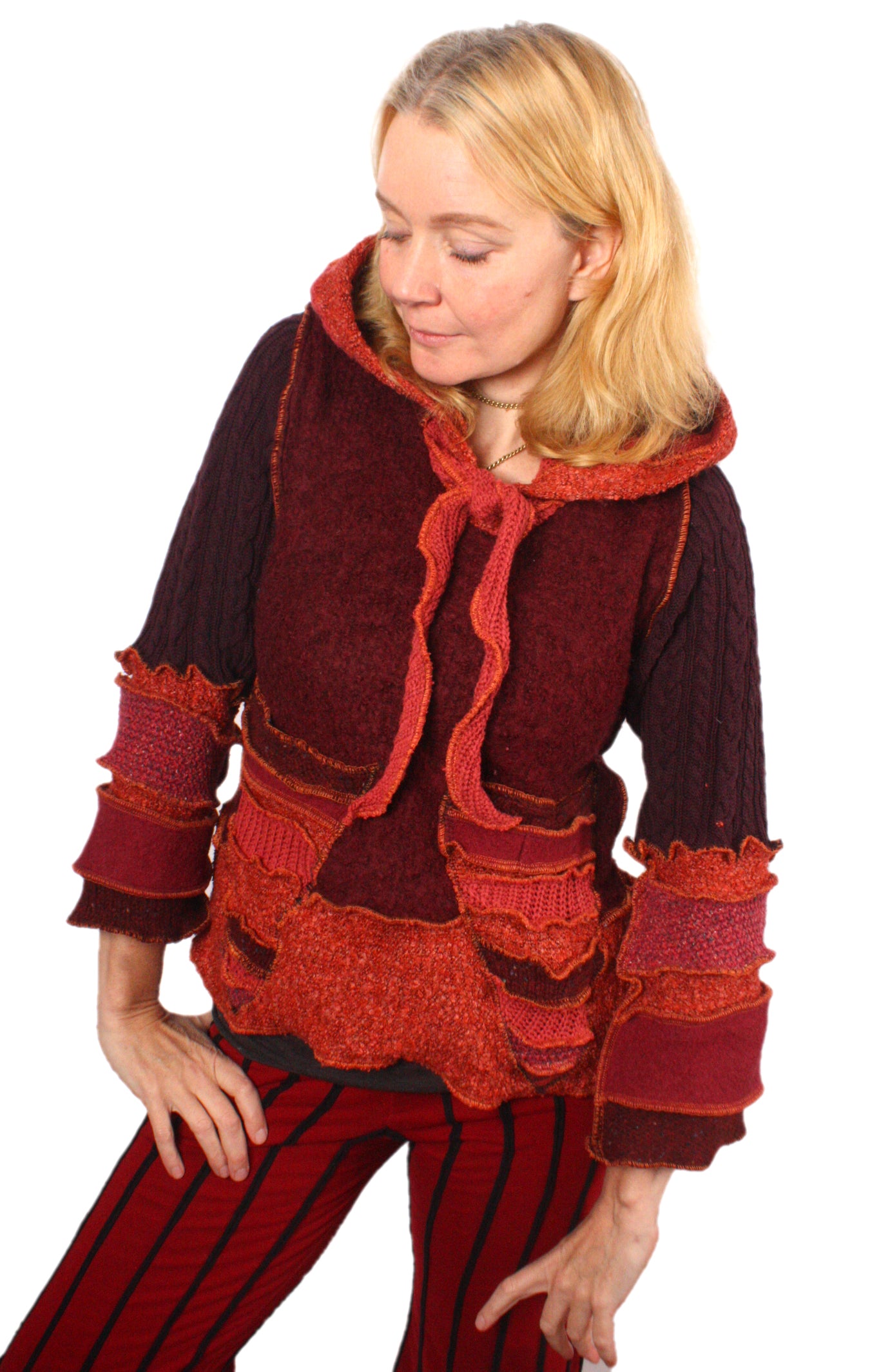 Each Katwise sweater is one-of-a-kind, sewn by me in my attic. They are perfectly imperfect, sometimes borderline wonky. They are all upcycled from sweaters I find in my vast thrift shopping expeditions. There is a huge variety in the texture and stretchiness of these knits, so no two are ever quite alike.