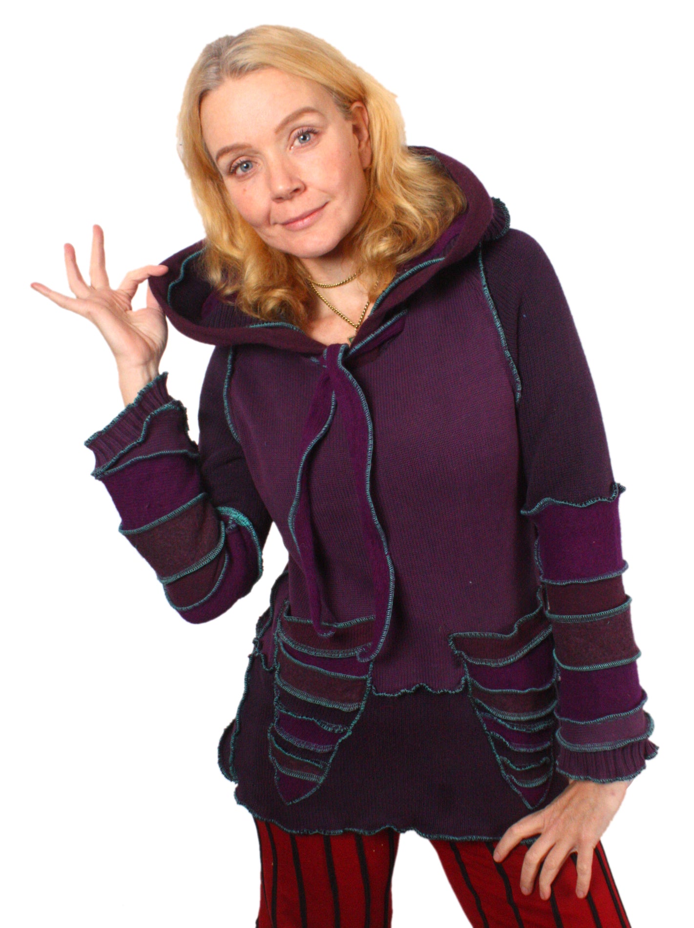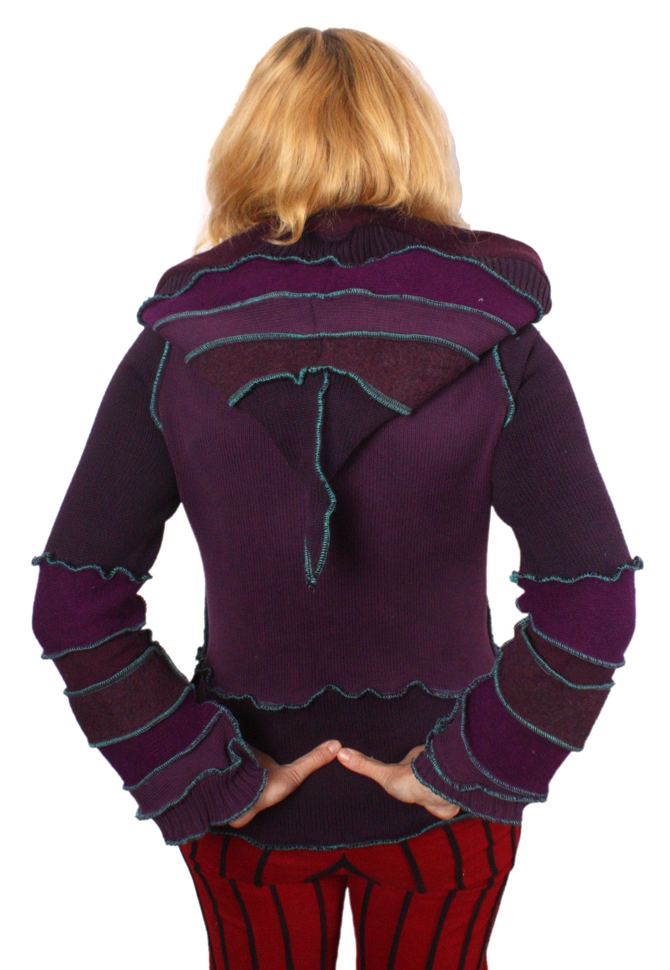 Showy Lady's Slipper is a proud purple pullover made from mostly cotton with a touch of wool. It features vibrant turquoise seams.