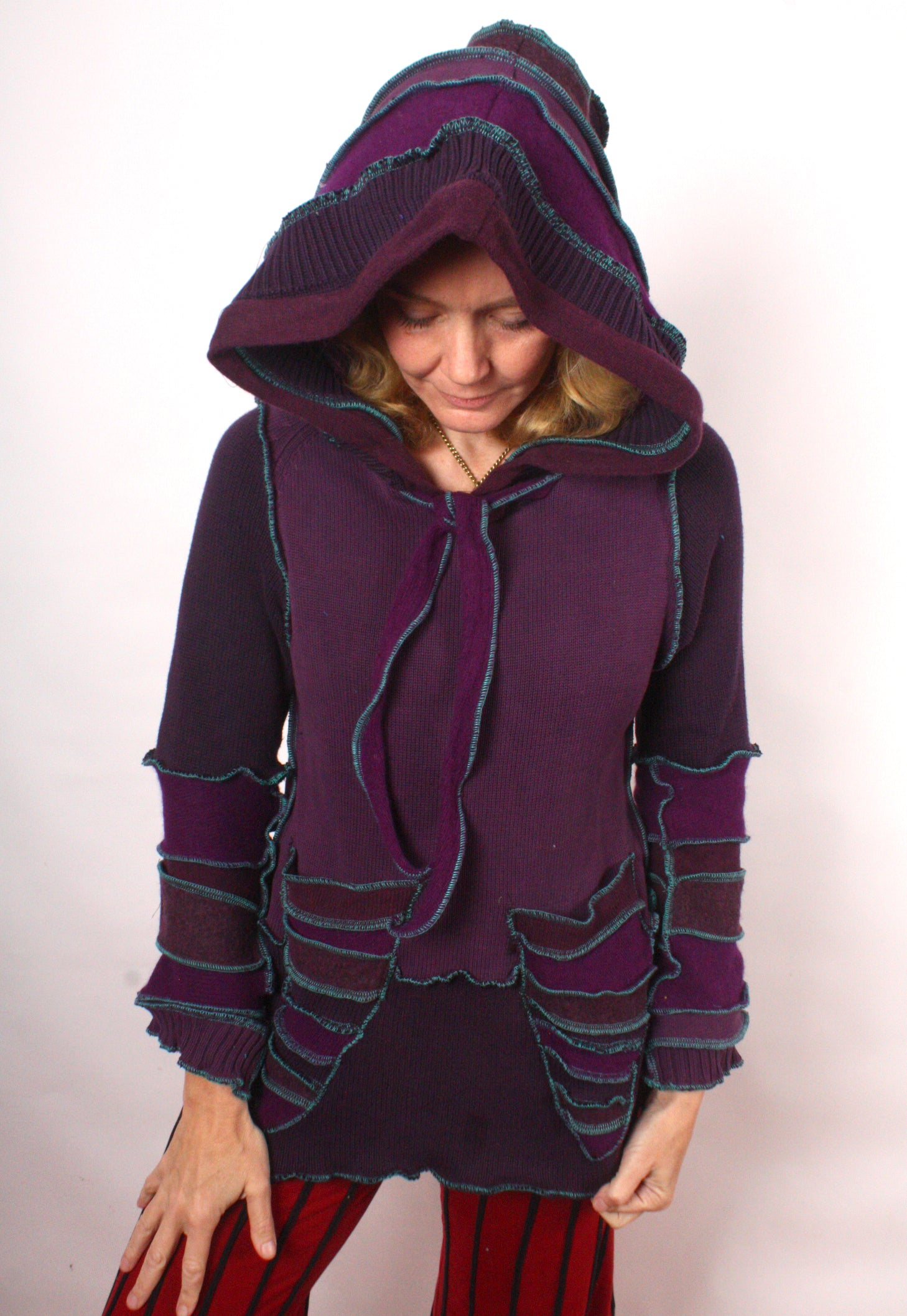 Each Katwise sweater is one-of-a-kind, sewn by me in my attic. They are perfectly imperfect, sometimes borderline wonky. They are all upcycled from sweaters I find in my vast thrift shopping expeditions. There is a huge variety in the texture and stretchiness of these knits, so no two are ever quite alike.