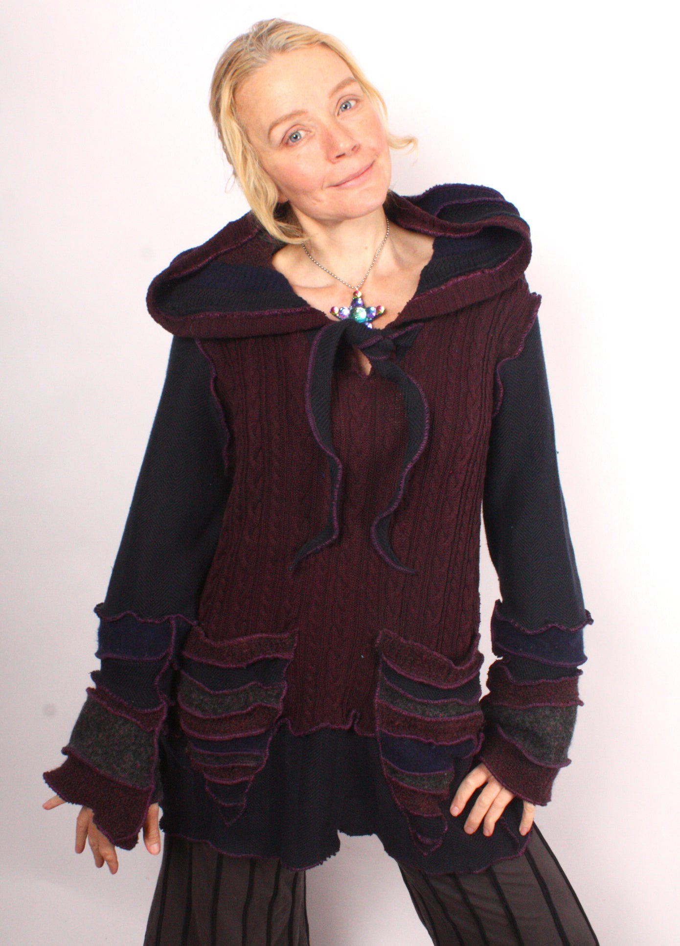 Each Katwise sweater is one-of-a-kind, sewn by me in my attic. They are perfectly imperfect, sometimes borderline wonky. They are all upcycled from sweaters I find in my vast thrift shopping expeditions. There is a huge variety in the texture and stretchiness of these knits, so no two are ever quite alike.