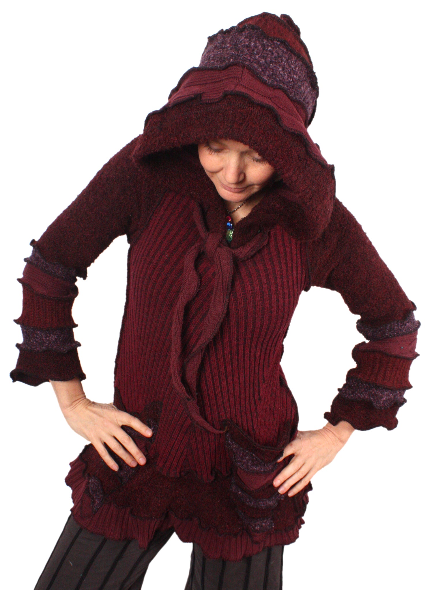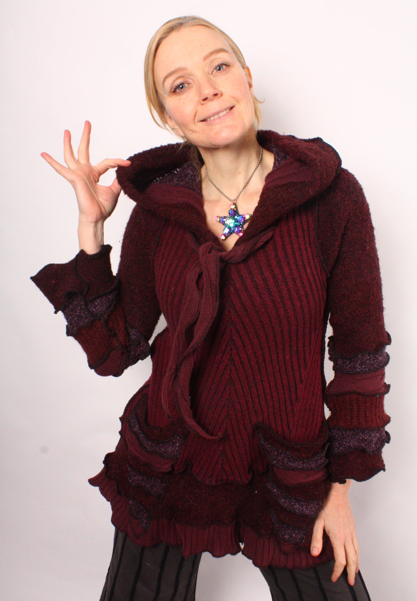 Each Katwise sweater is one-of-a-kind, sewn by me in my attic. They are perfectly imperfect, sometimes borderline wonky. They are all upcycled from sweaters I find in my vast thrift shopping expeditions. There is a huge variety in the texture and stretchiness of these knits, so no two are ever quite alike.