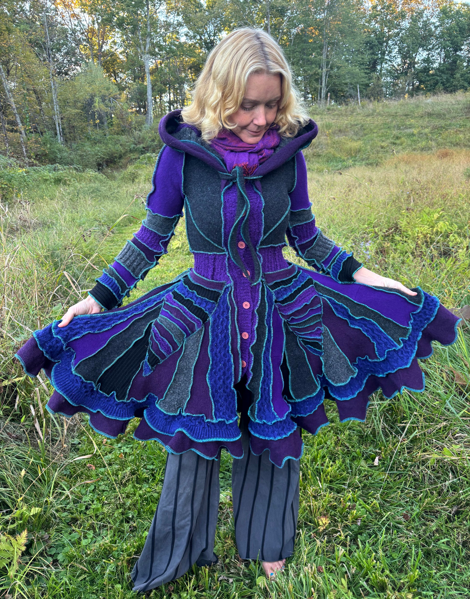 Each Katwise sweater is one-of-a-kind, sewn by me in my attic. They are perfectly imperfect, sometimes borderline wonky. They are all upcycled from sweaters I find in my vast thrift shopping expeditions. There is a huge variety in the texture and stretchiness of these knits, so no two are ever quite alike.