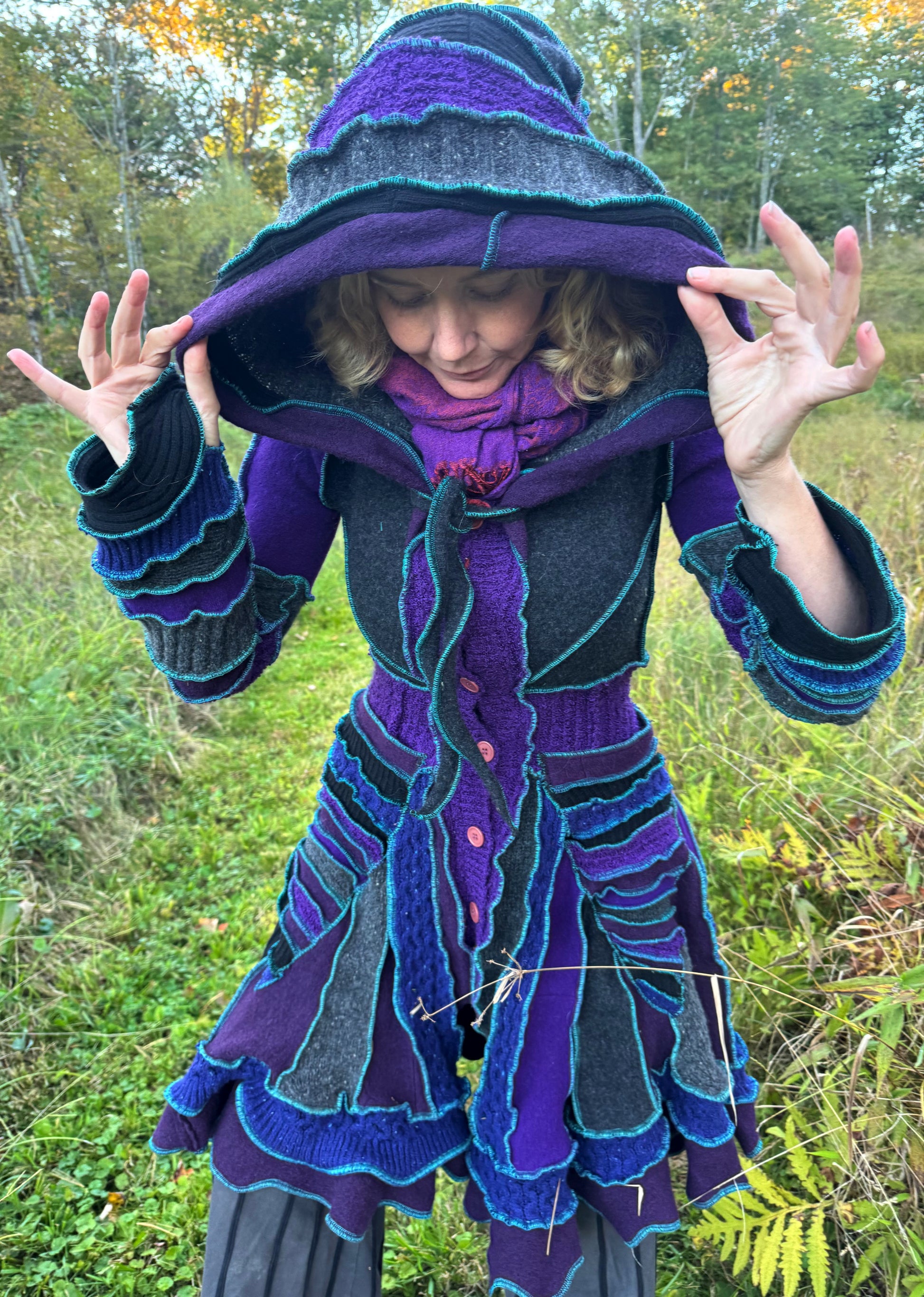 Clio is an instantly memorable oceanic swirl of indigo and violet with bold teal seams. It's made of sturdy wool with a button front.