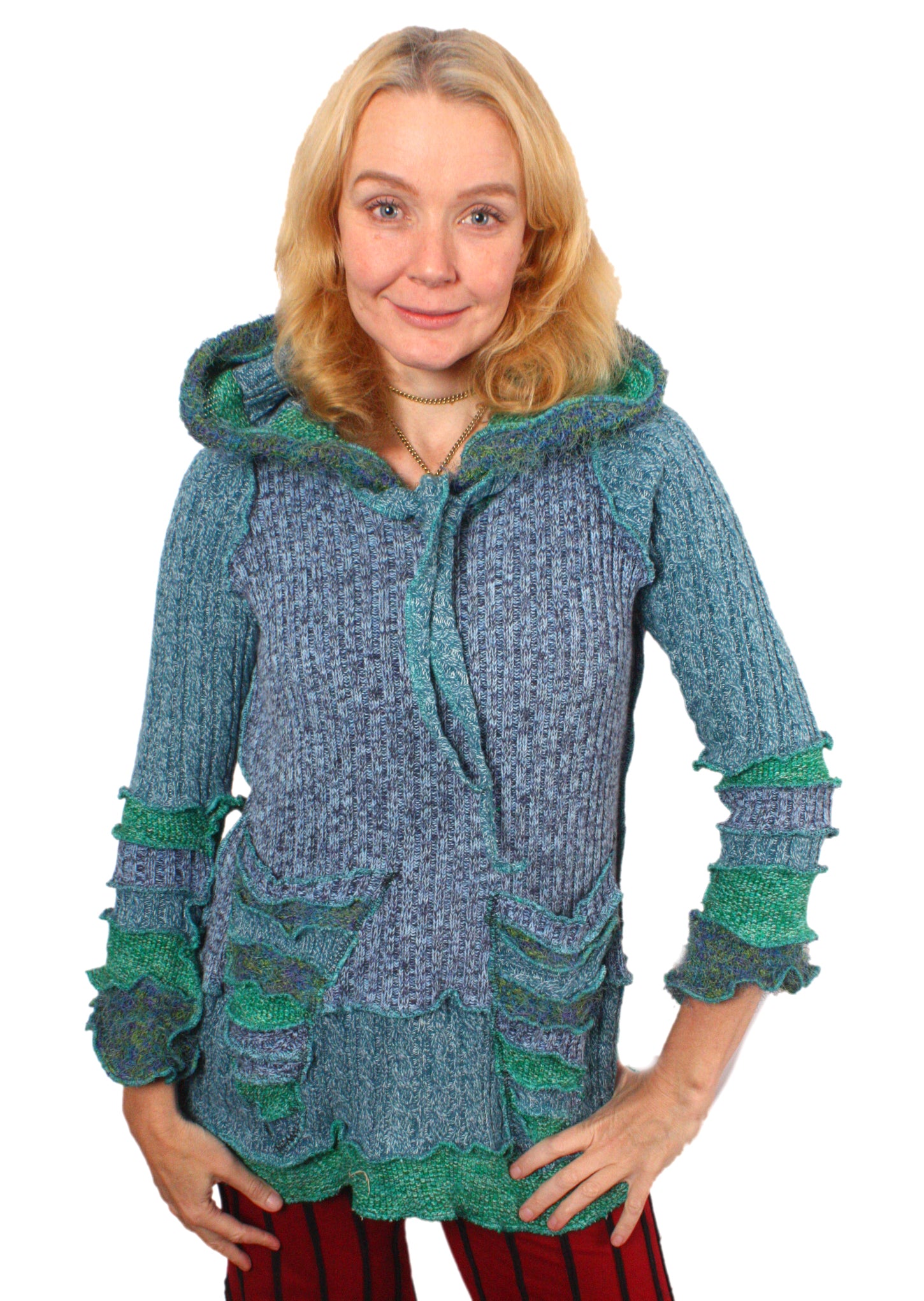 Each Katwise sweater is one-of-a-kind, sewn by me in my attic. They are perfectly imperfect, sometimes borderline wonky. They are all upcycled from sweaters I find in my vast thrift shopping expeditions. There is a huge variety in the texture and stretchiness of these knits, so no two are ever quite alike.