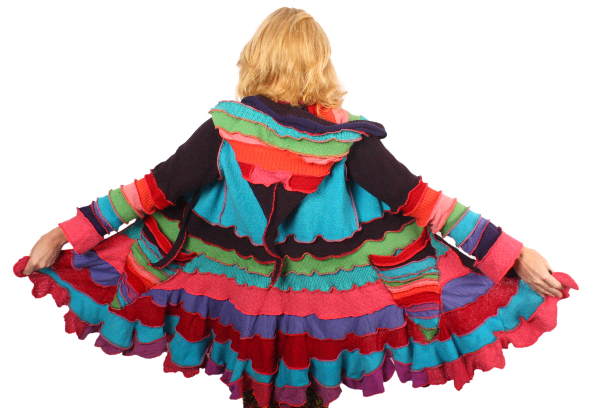 Flouncy Coats are fun and twirly with lots of bouncy ruffles. I use lots of lightweight soft stretchy knits that make these very comfy and easy to wear, while still being extravagantly cheerful.