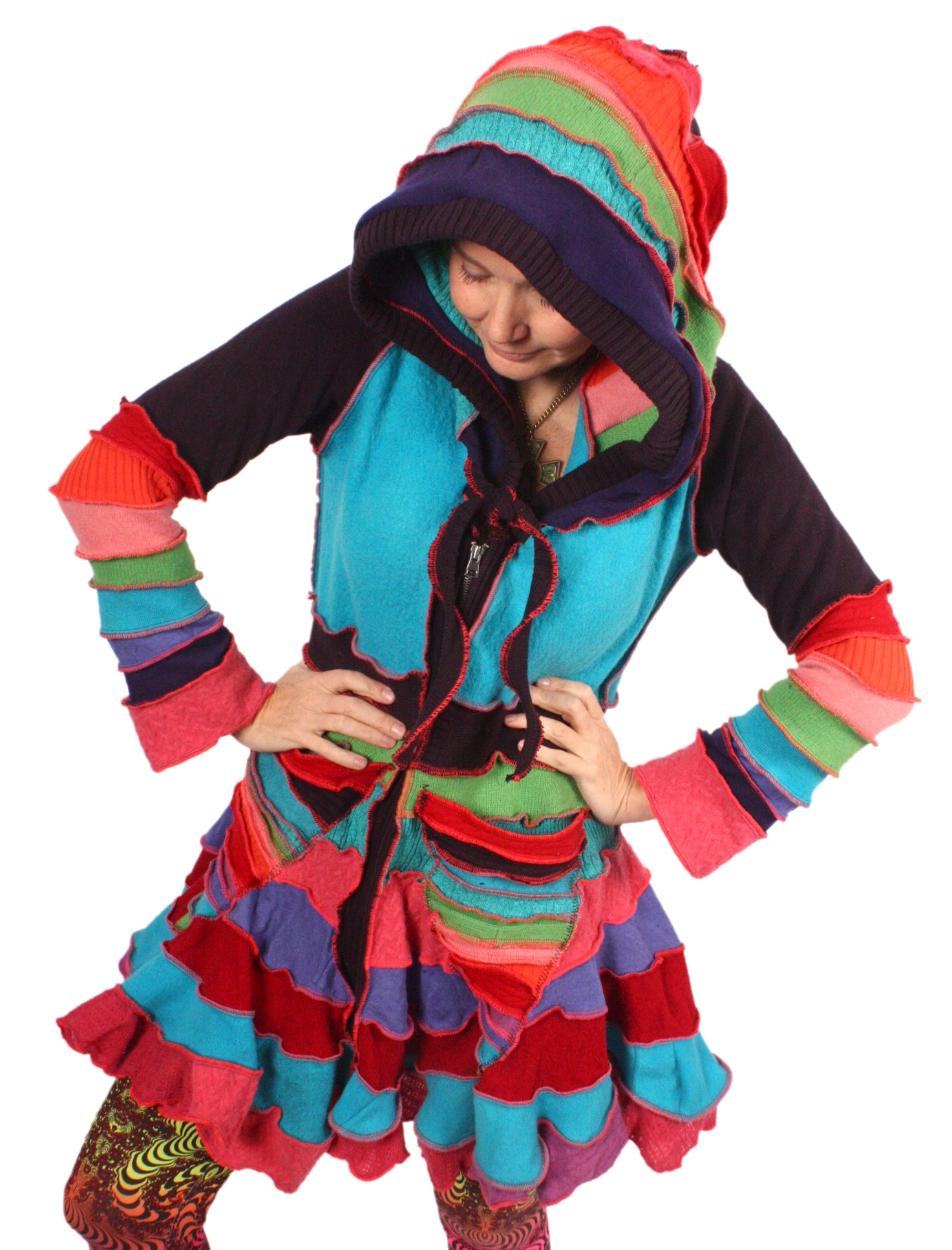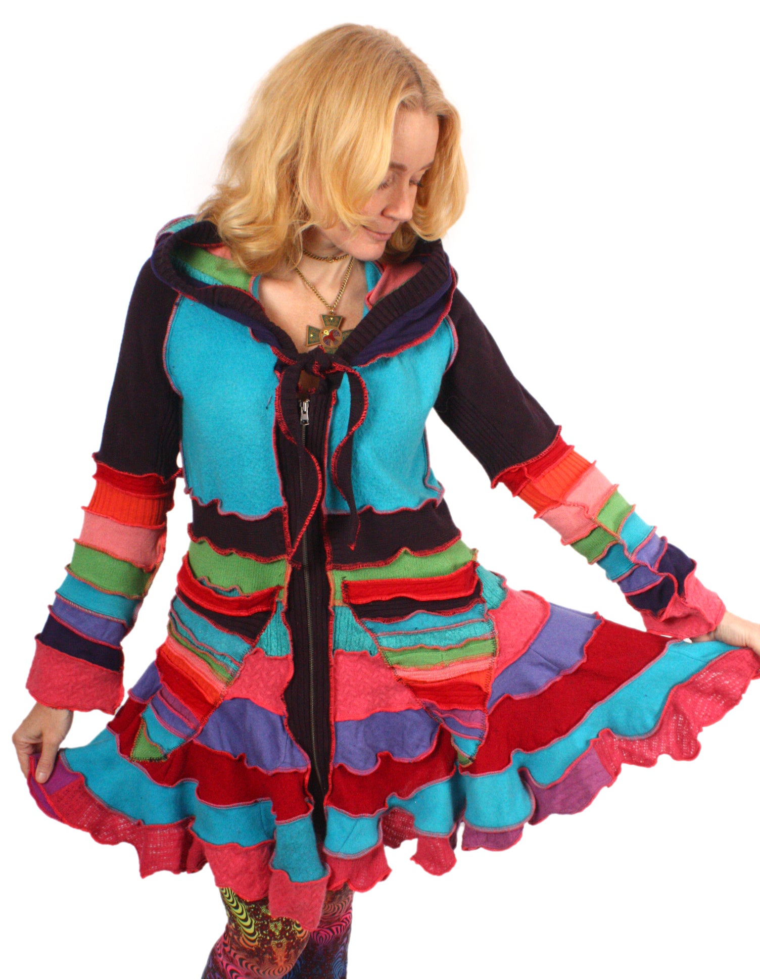 Kallichore is a vibrant rainbow flouncy with neon seams. This coat features wool, cotton, cashmere, and a zipper front.
