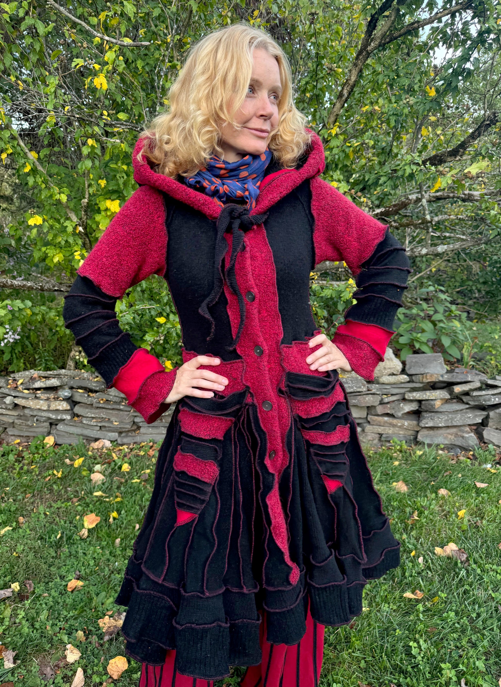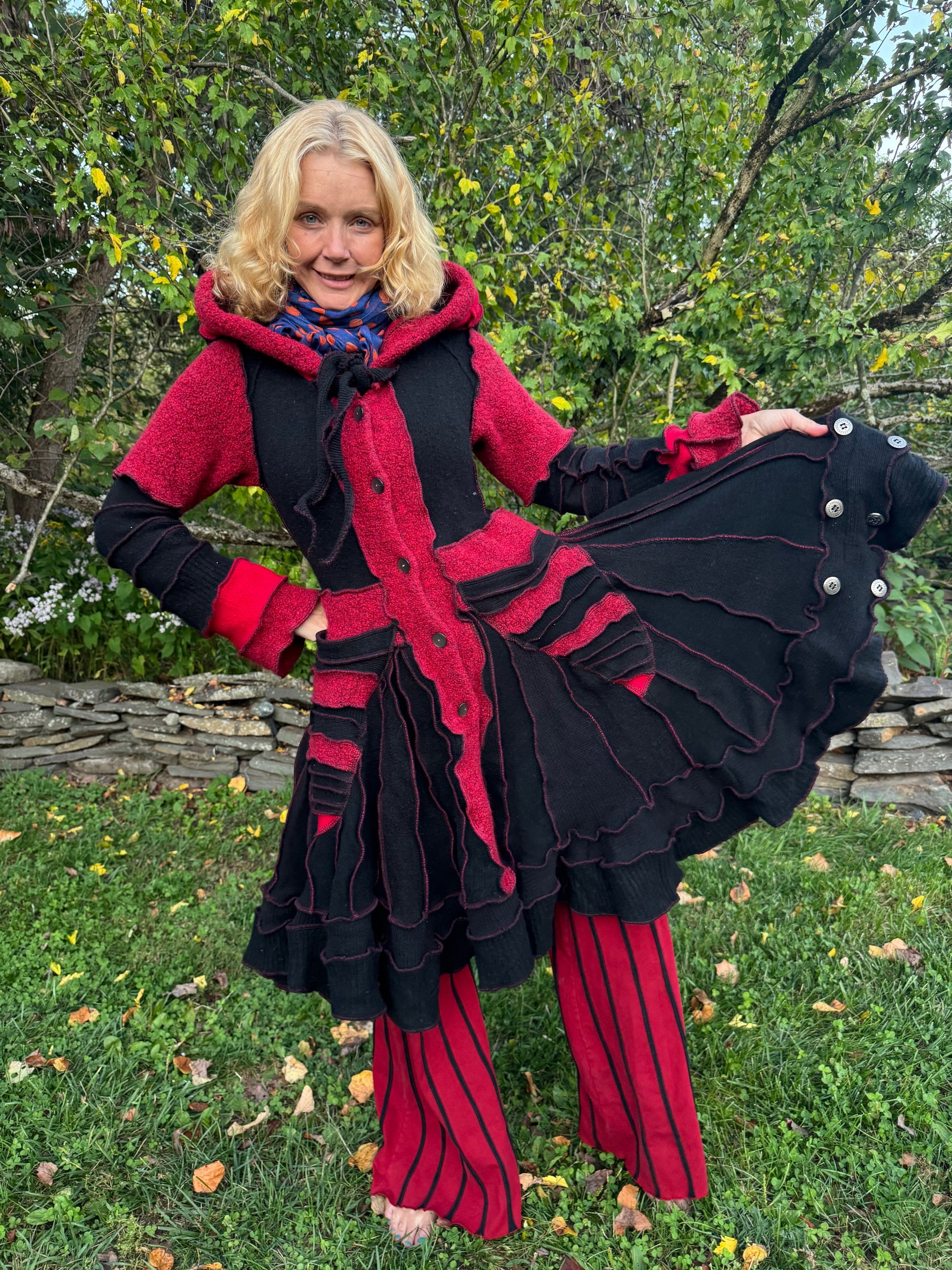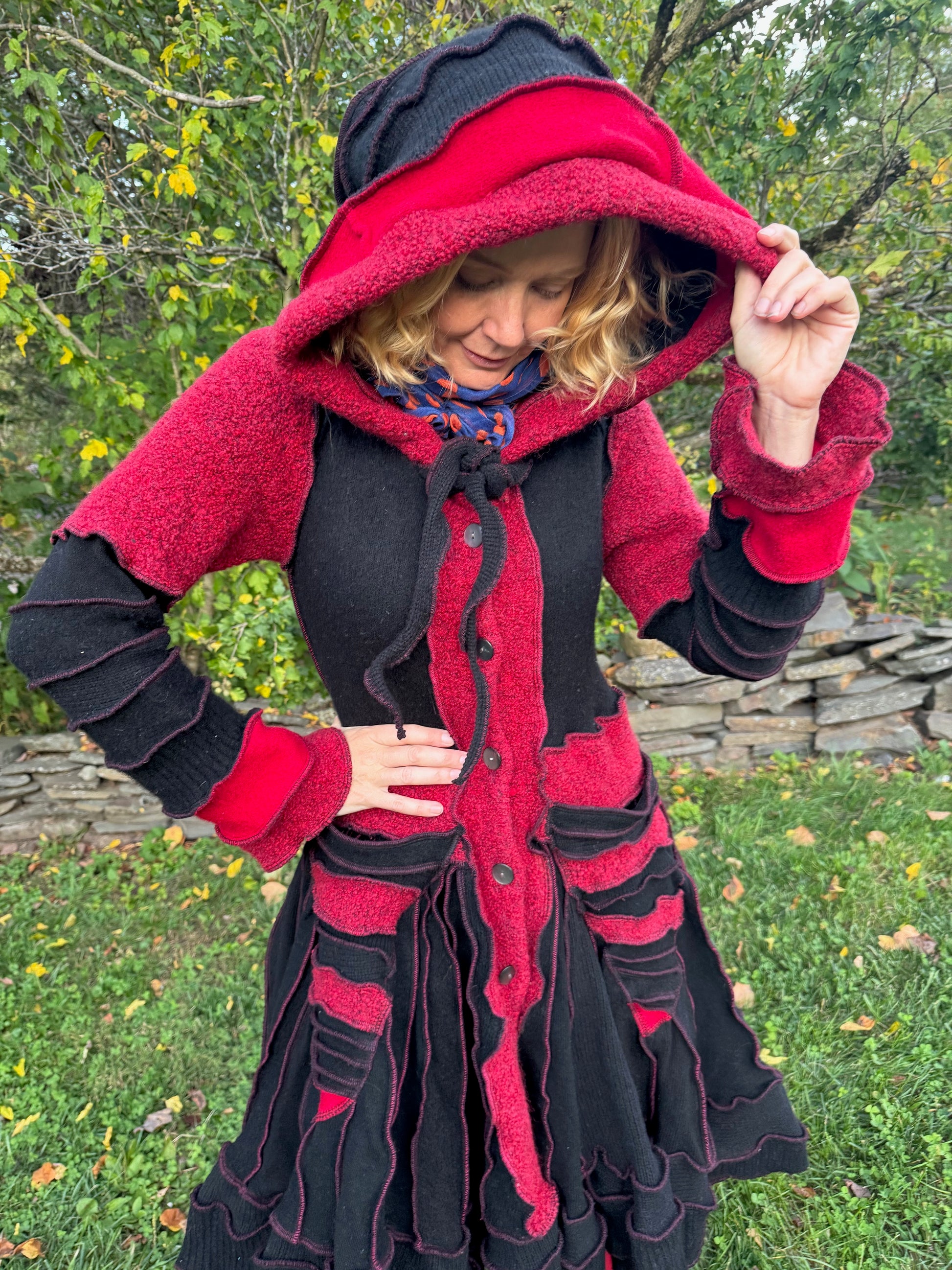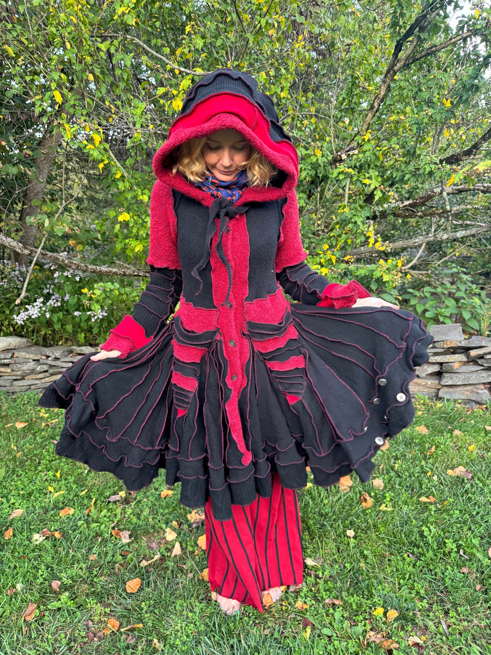 Erato is a romantic red and black cozy sweater that reminds me of a friendly black widow. The extra decorative buttons on the hem remind me of cute little spider eyes.