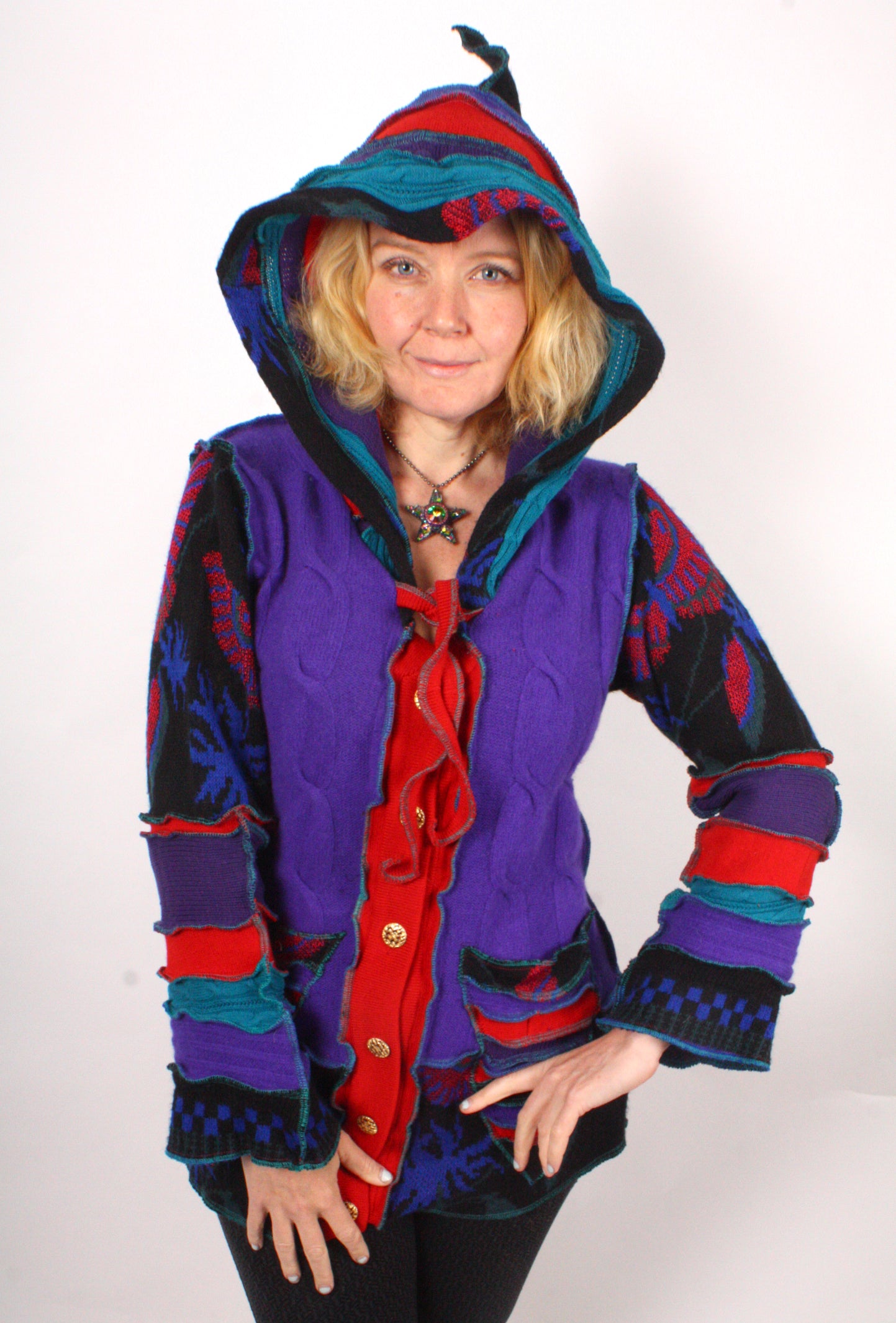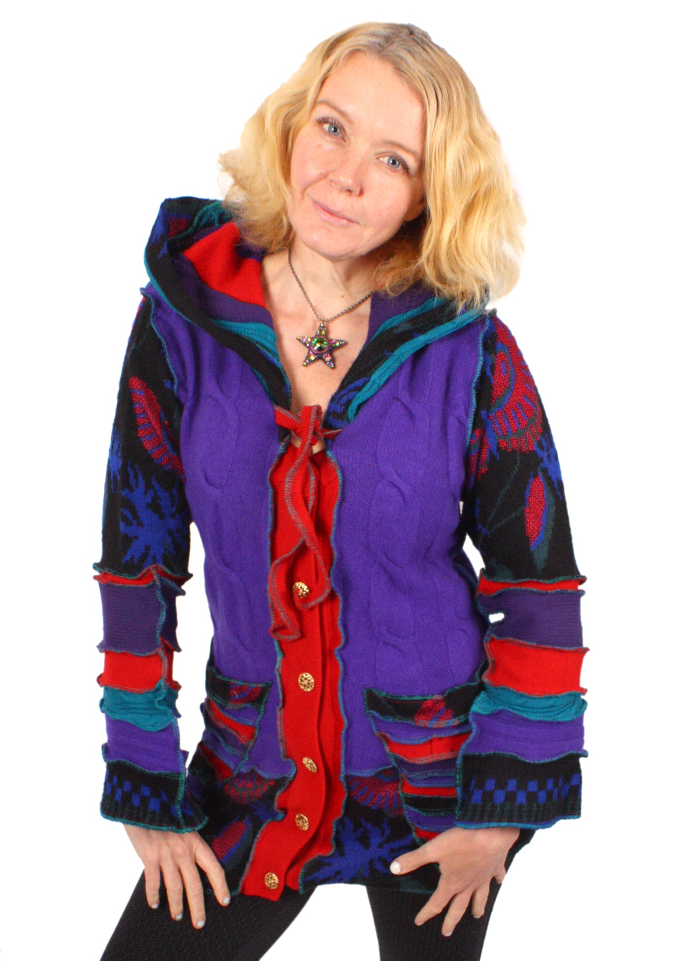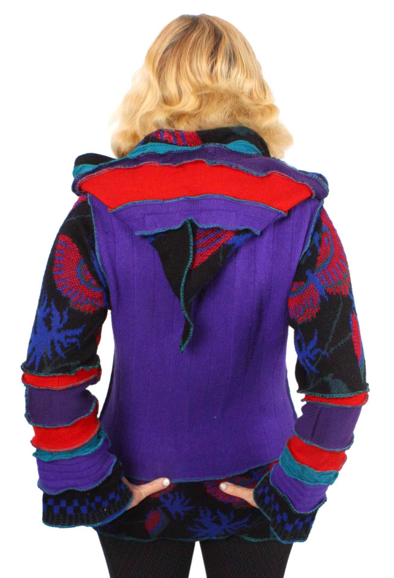 You Made Me The Thief of Your Heart is a royal purple and crimson stunner with vintage butterfly knits and golden buttons. It's a mix of wool, cotton, and 80s mystery fiber.
