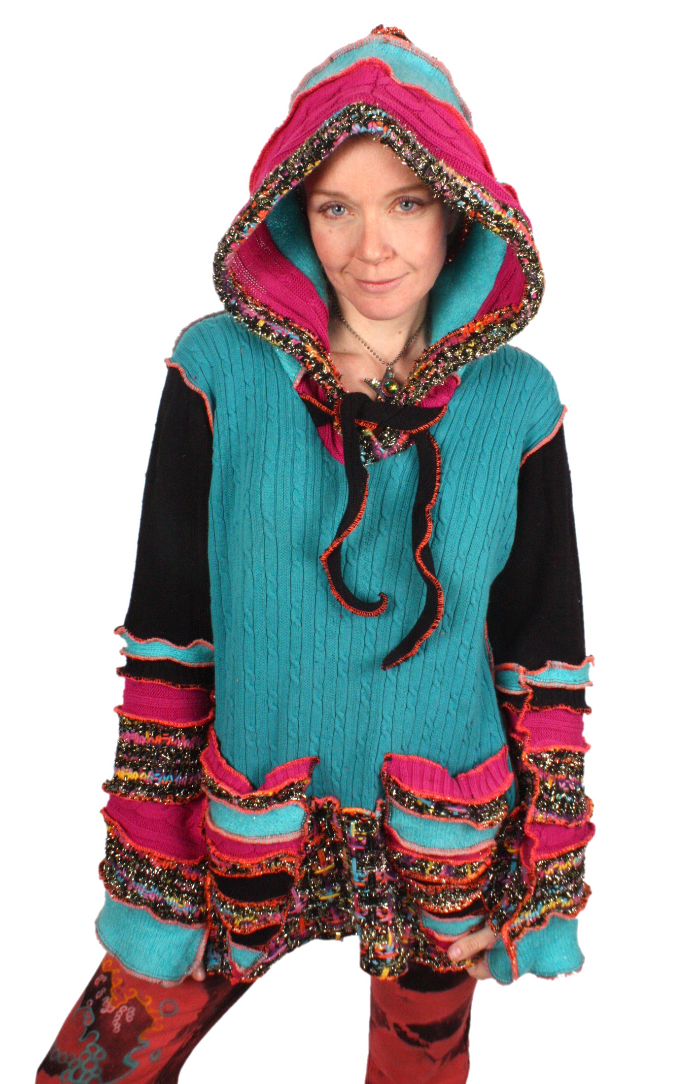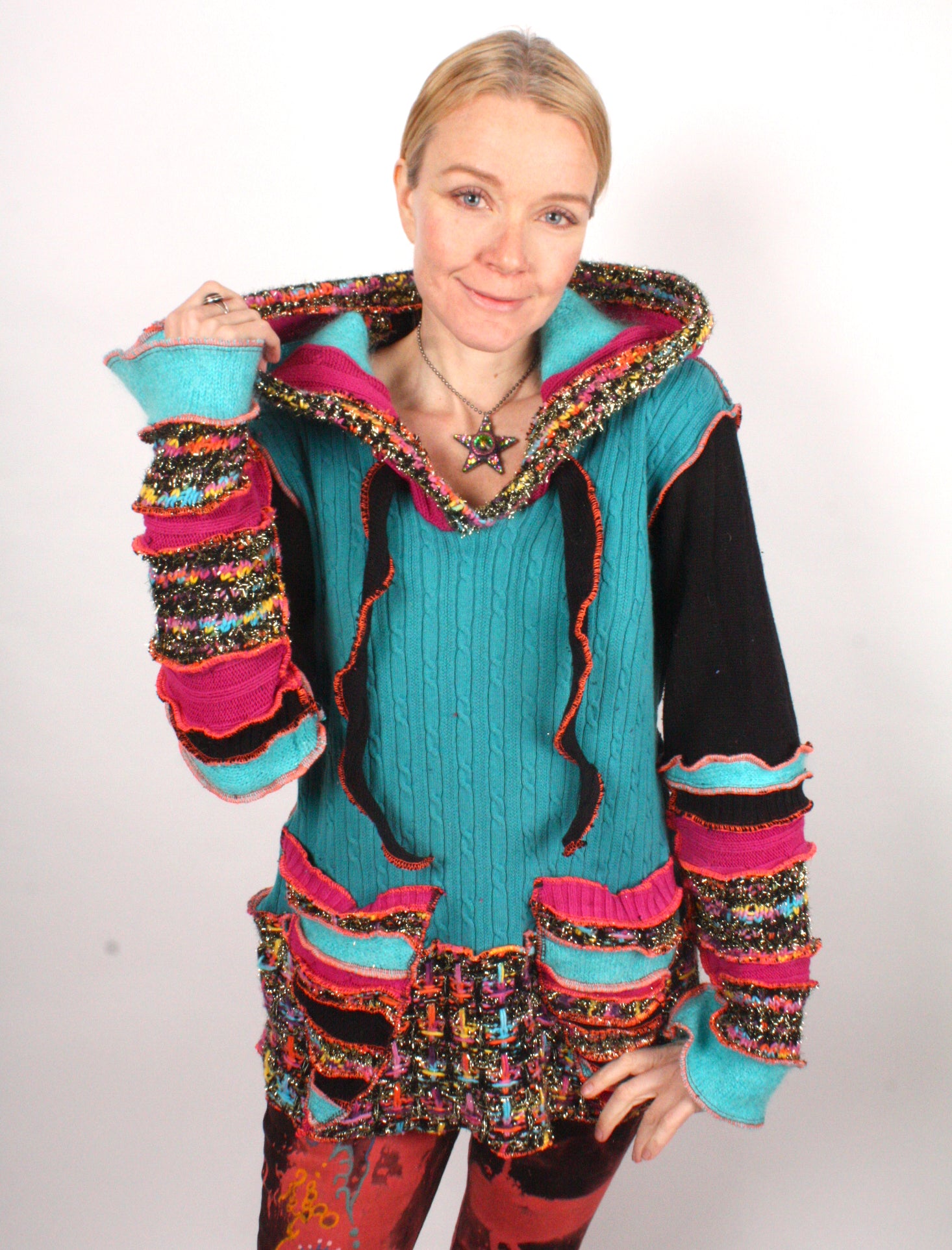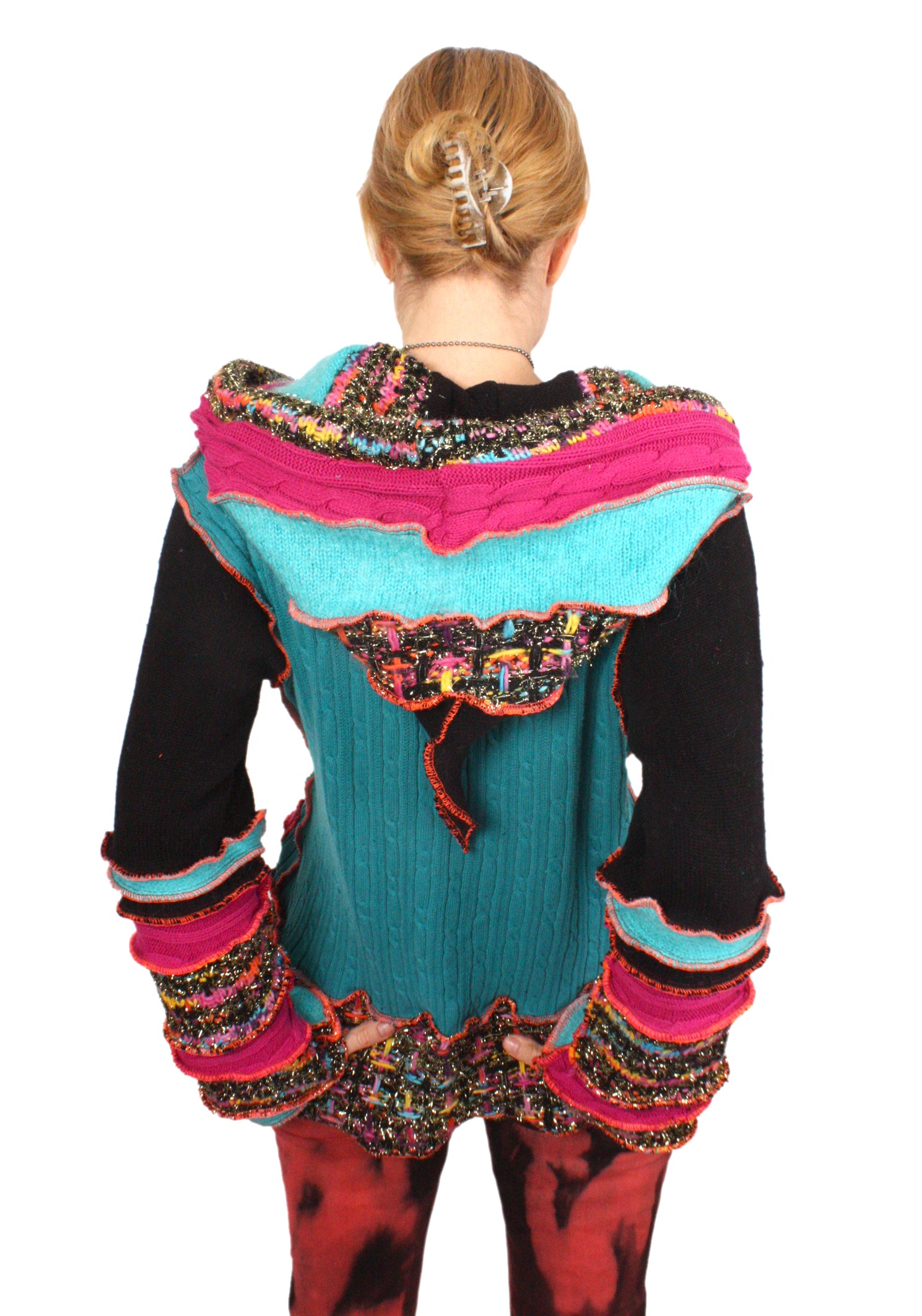 Each Katwise sweater is one-of-a-kind, sewn by me in my attic. They are perfectly imperfect, sometimes borderline wonky. They are all upcycled from sweaters I find in my vast thrift shopping expeditions. There is a huge variety in the texture and stretchiness of these knits, so no two are ever quite alike.