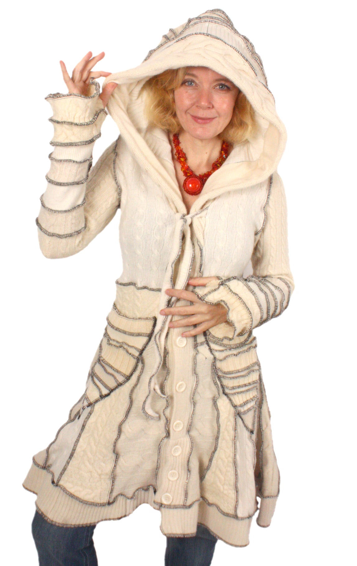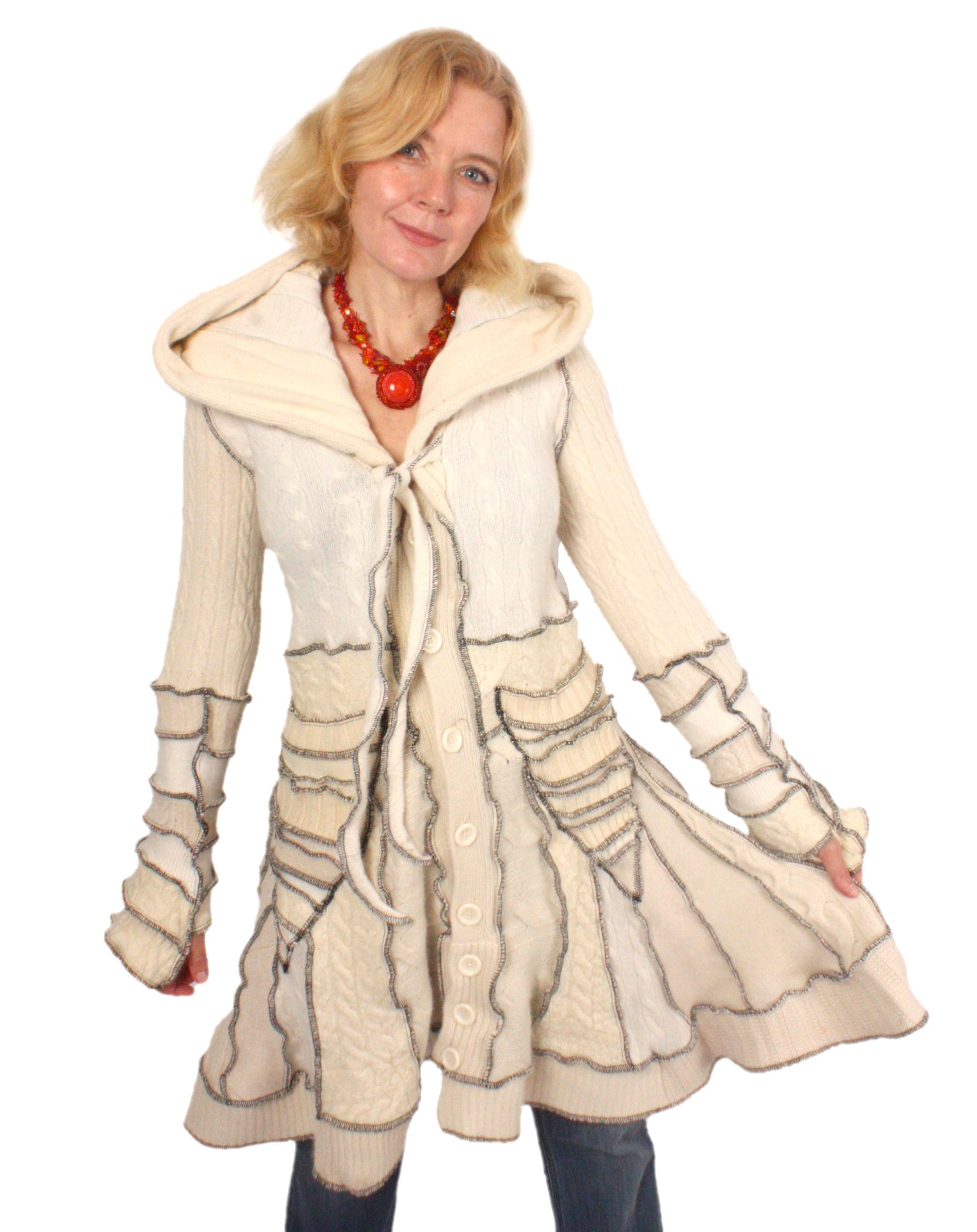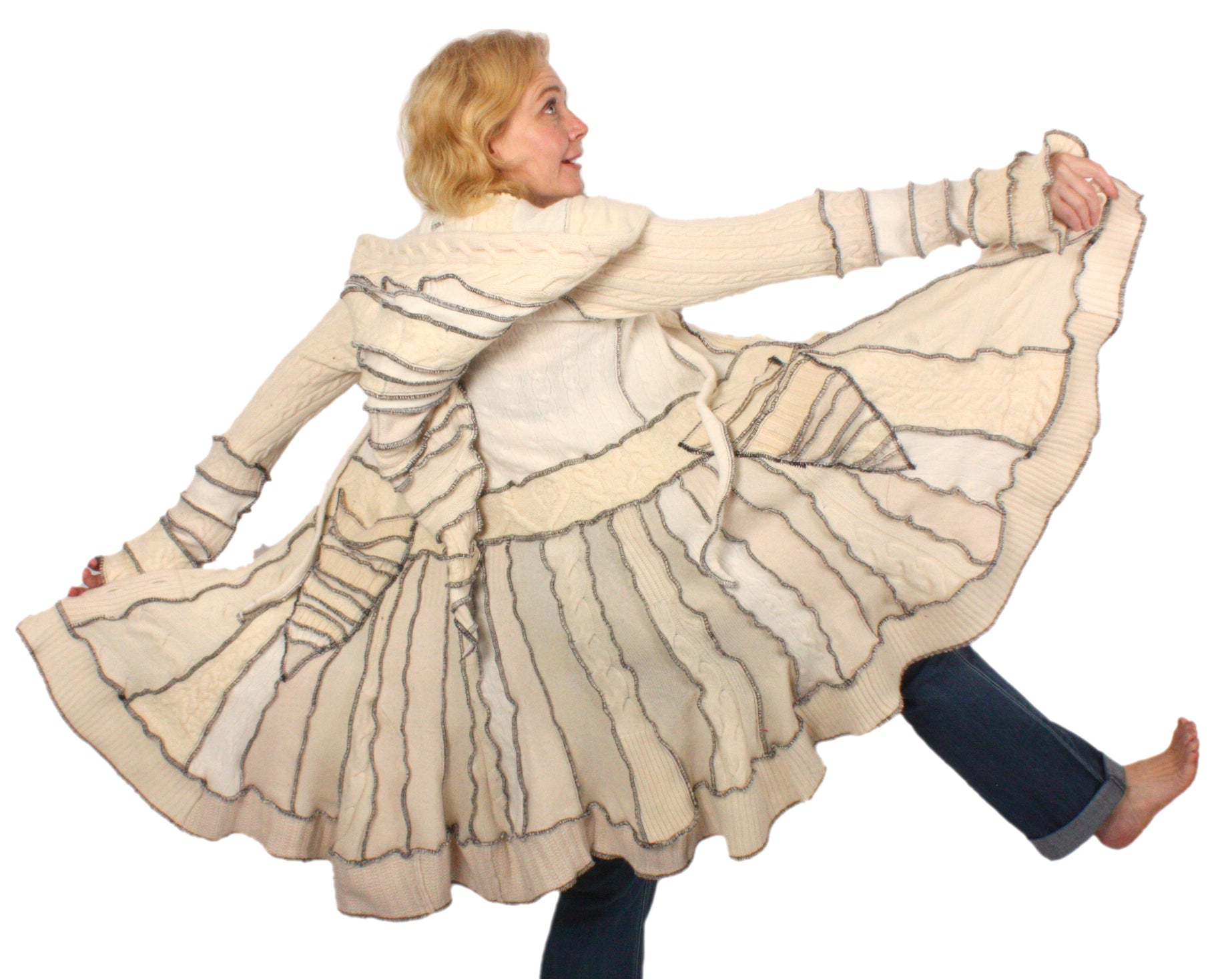 You Are What You is is a classic carousel coat in wintry shades of snow and frost. It's made from bold wool fishermen sweaters with a touch of cashmere in just the right places and has a long button front and I think it would look super-awesome if somebody tie-dyed this.