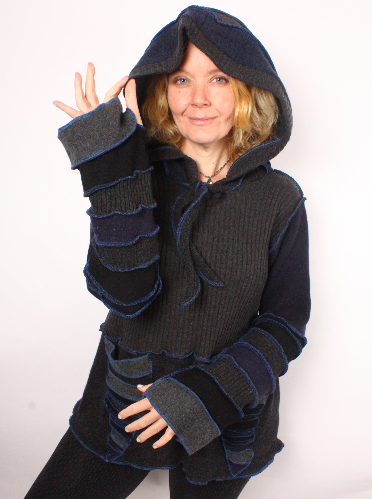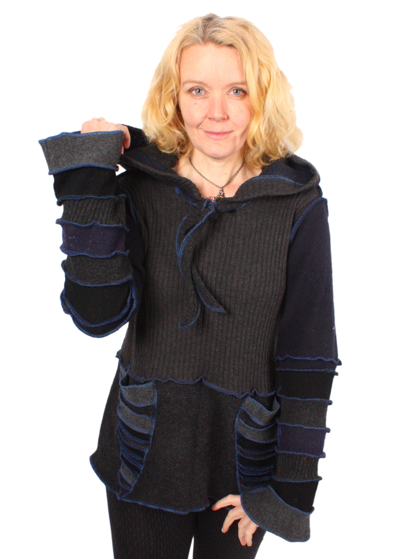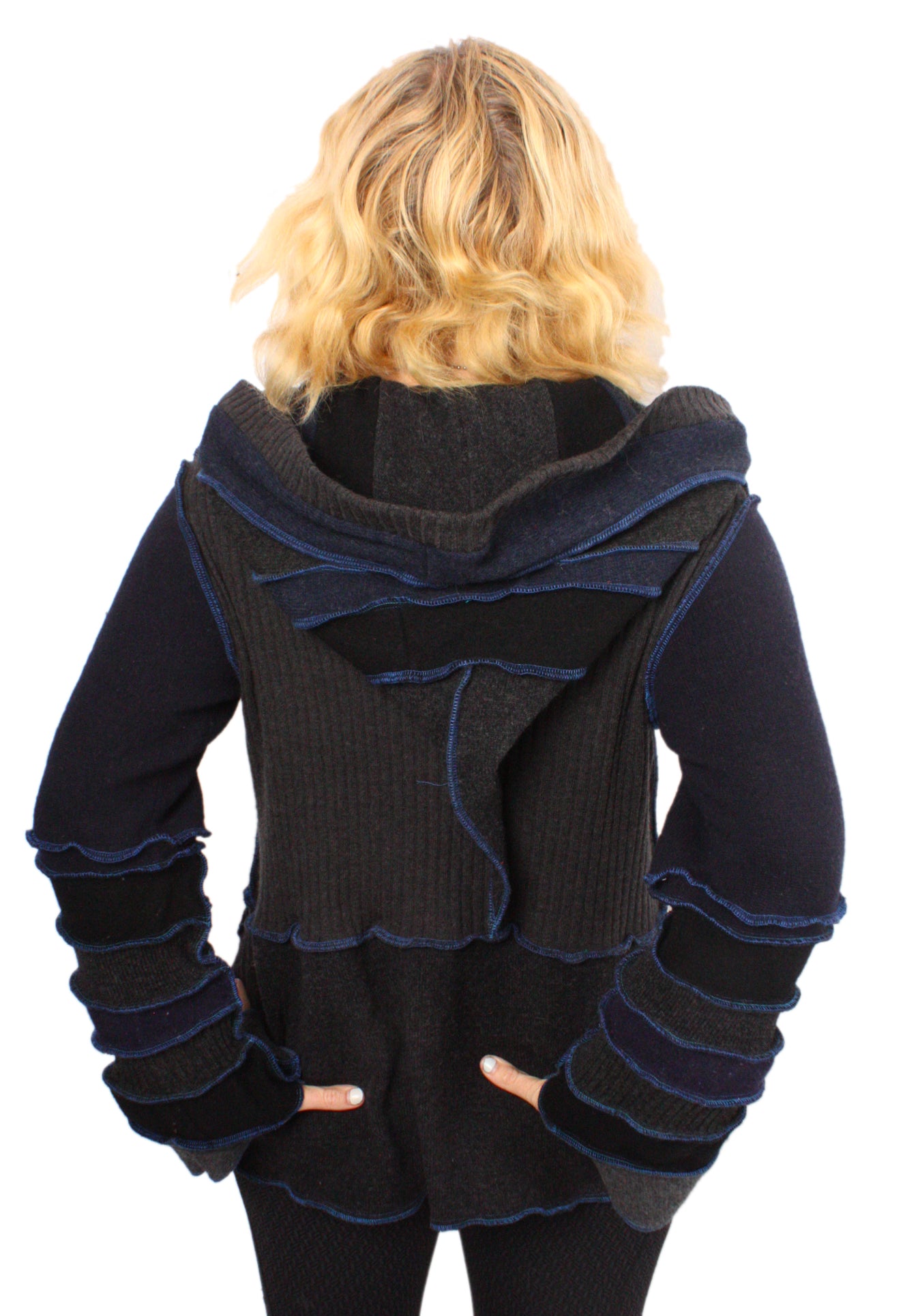 Each Katwise sweater is one-of-a-kind, sewn by me in my attic. They are perfectly imperfect, sometimes borderline wonky. They are all upcycled from sweaters I find in my vast thrift shopping expeditions. There is a huge variety in the texture and stretchiness of these knits, so no two are ever quite alike.