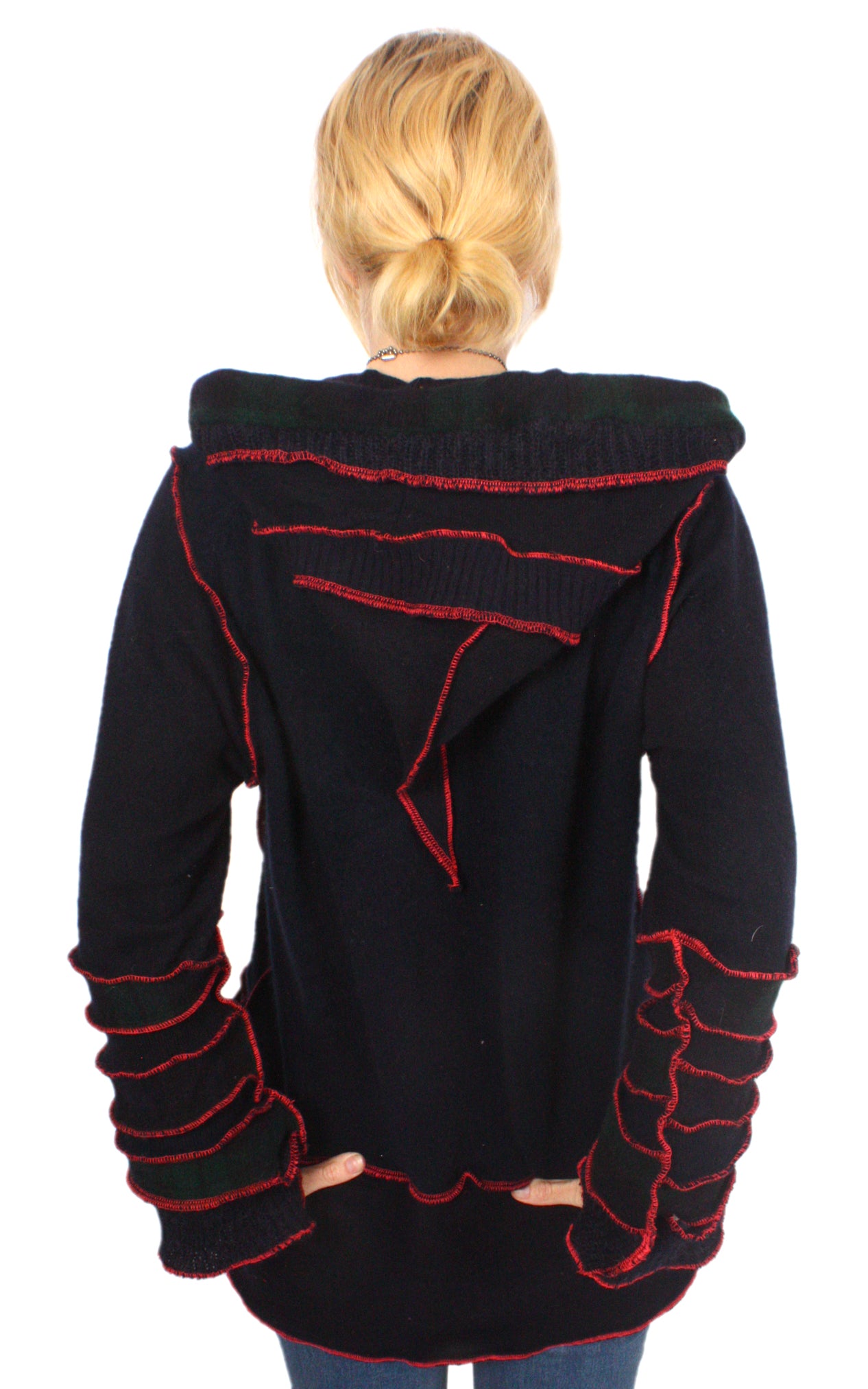 Hunter V is an ultra-soft ebony cashmere tunic with neon seams and a tiny touch of green plaid peeking through.