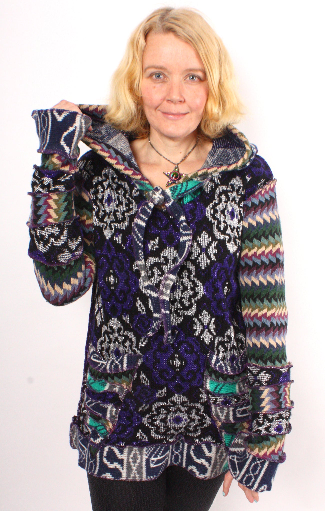 Each Katwise sweater is one-of-a-kind, sewn by me in my attic. They are perfectly imperfect, sometimes borderline wonky. They are all upcycled from sweaters I find in my vast thrift shopping expeditions. There is a huge variety in the texture and stretchiness of these knits, so no two are ever quite alike.