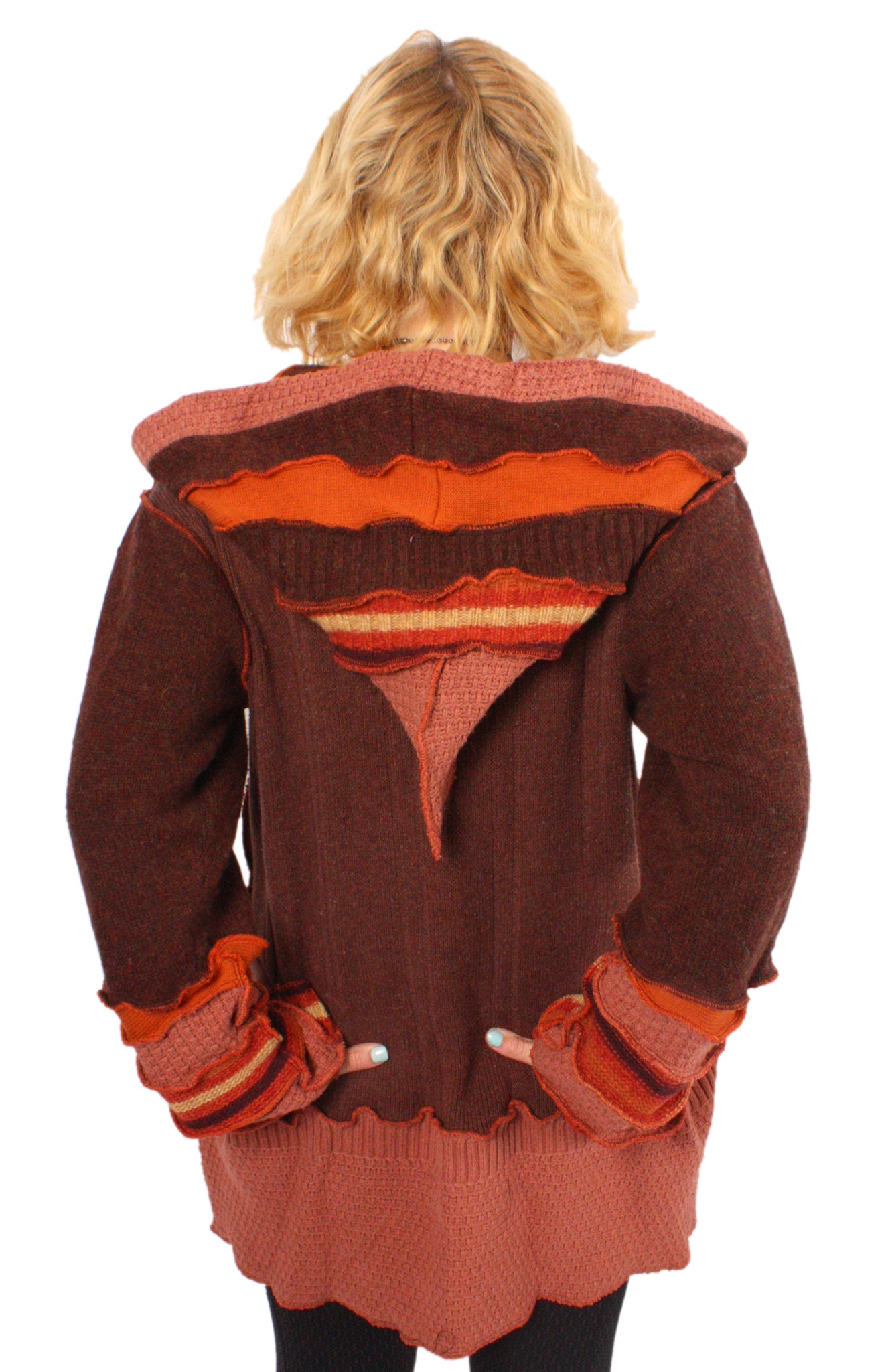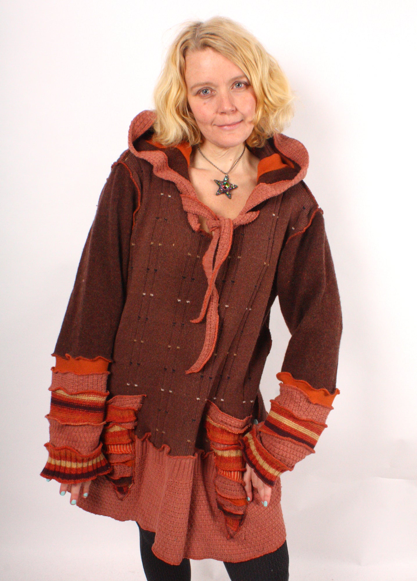 Each Katwise sweater is one-of-a-kind, sewn by me in my attic. They are perfectly imperfect, sometimes borderline wonky. They are all upcycled from sweaters I find in my vast thrift shopping expeditions. There is a huge variety in the texture and stretchiness of these knits, so no two are ever quite alike.