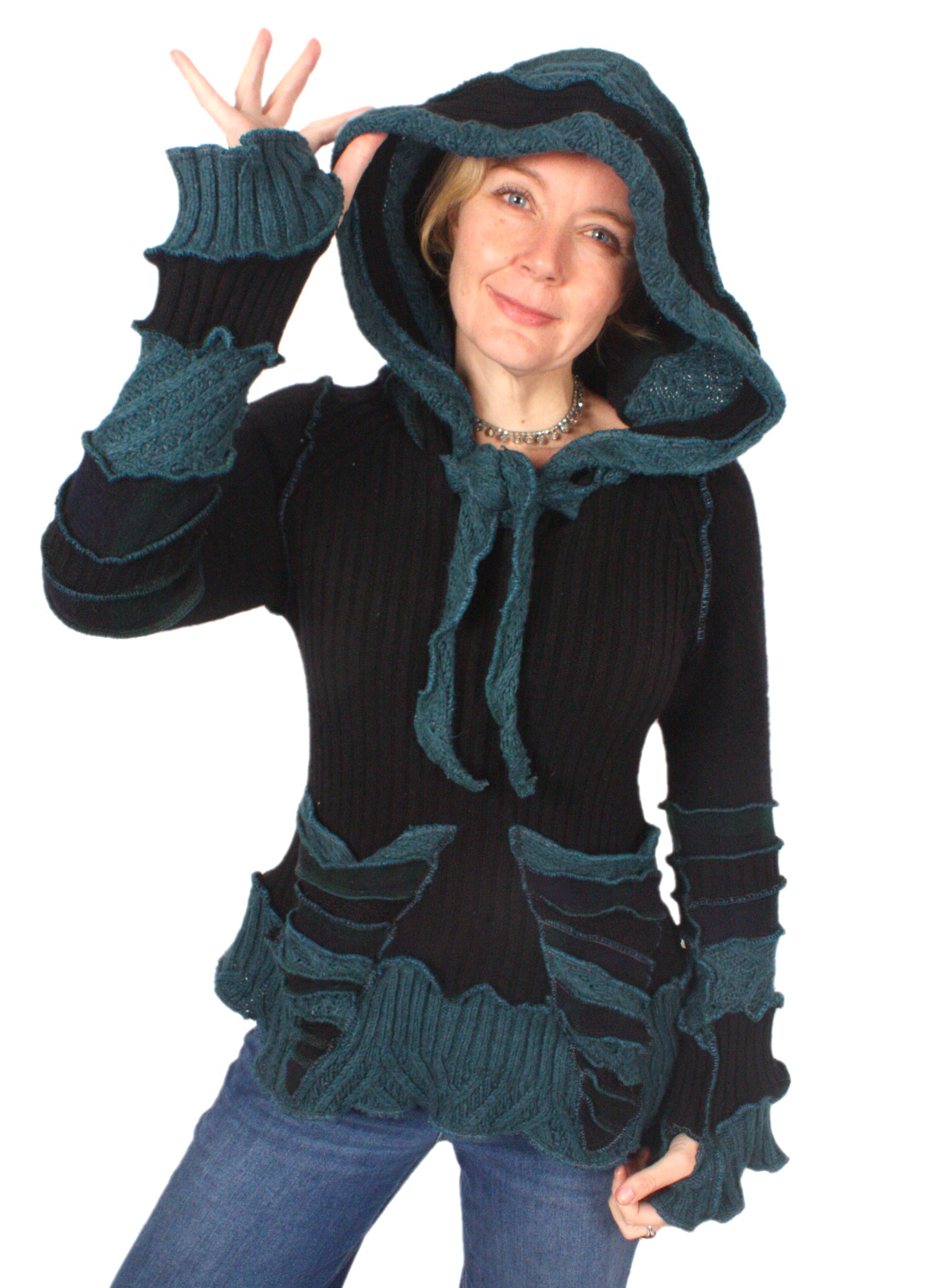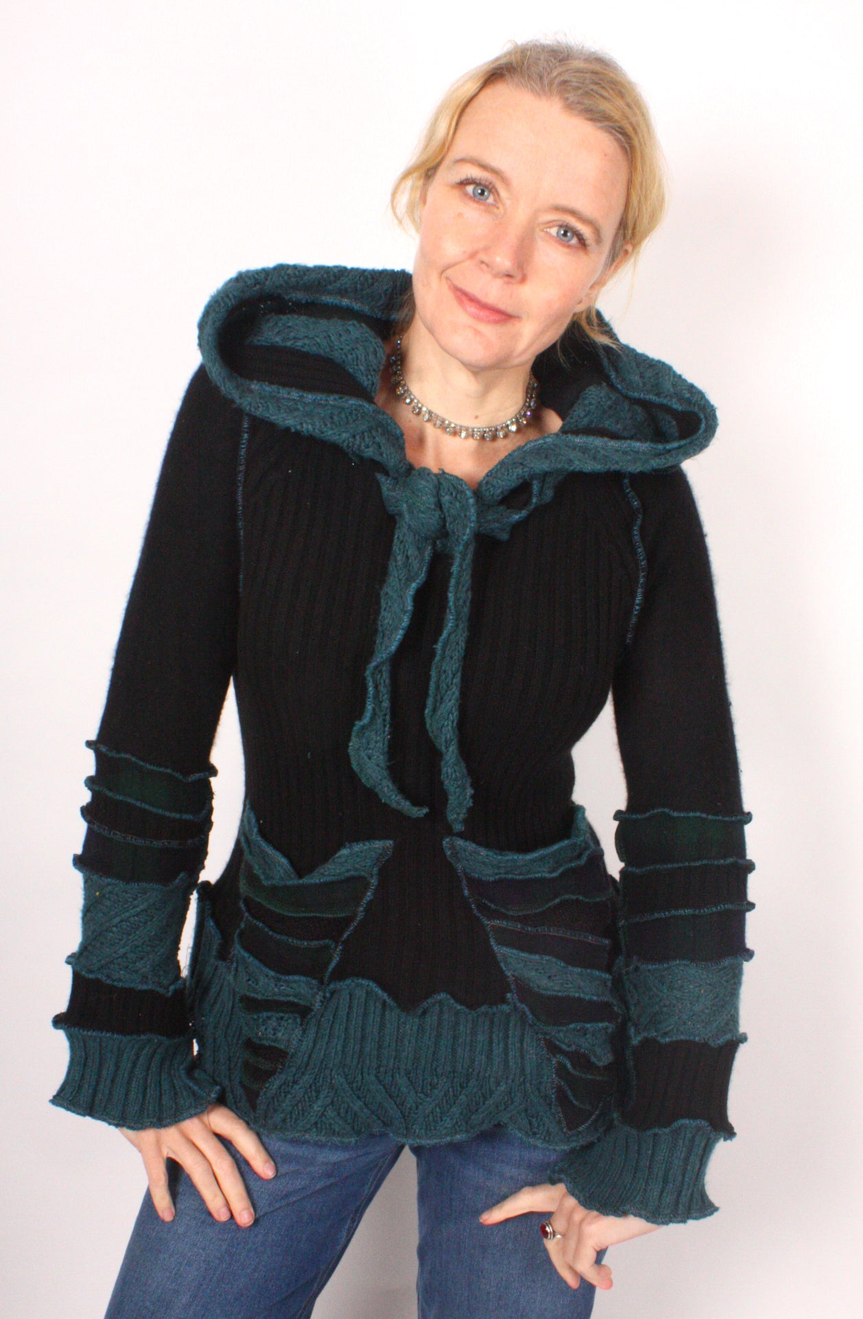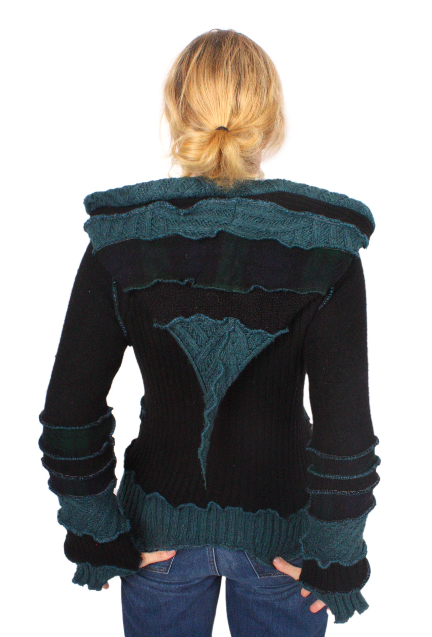 Each Katwise sweater is one-of-a-kind, sewn by me in my attic. They are perfectly imperfect, sometimes borderline wonky. They are all upcycled from sweaters I find in my vast thrift shopping expeditions. There is a huge variety in the texture and stretchiness of these knits, so no two are ever quite alike.