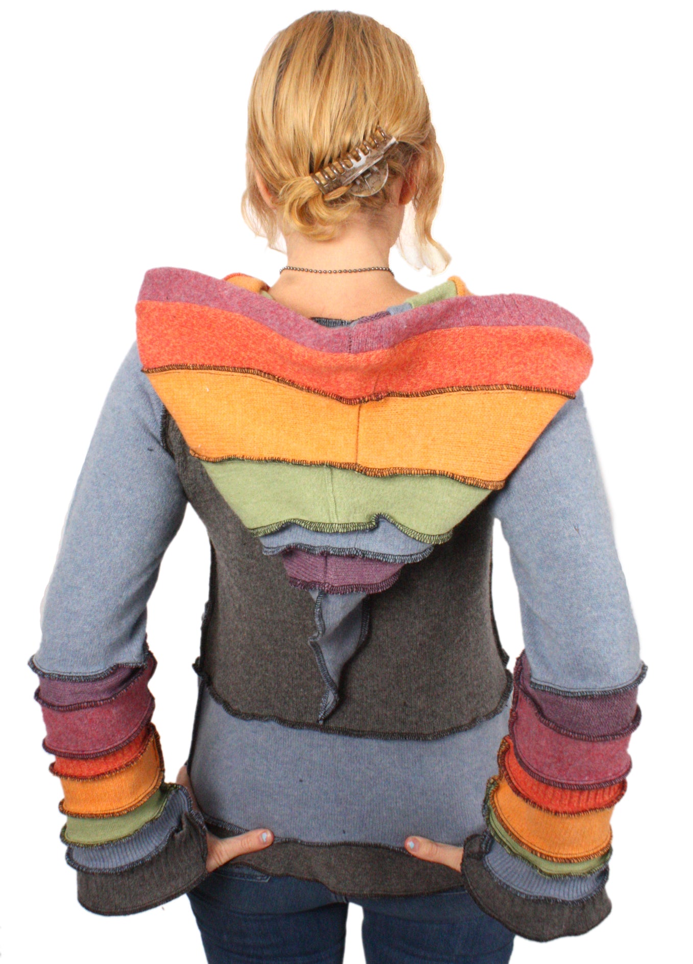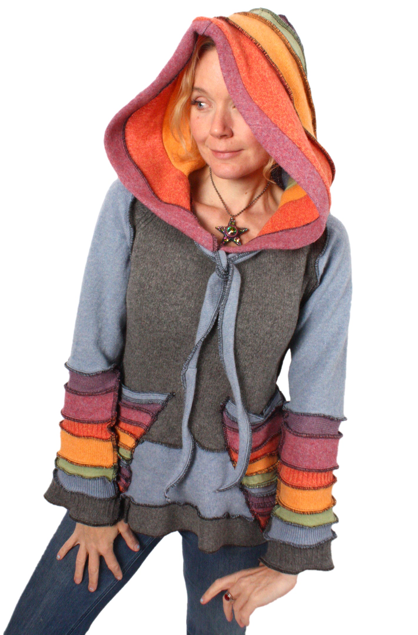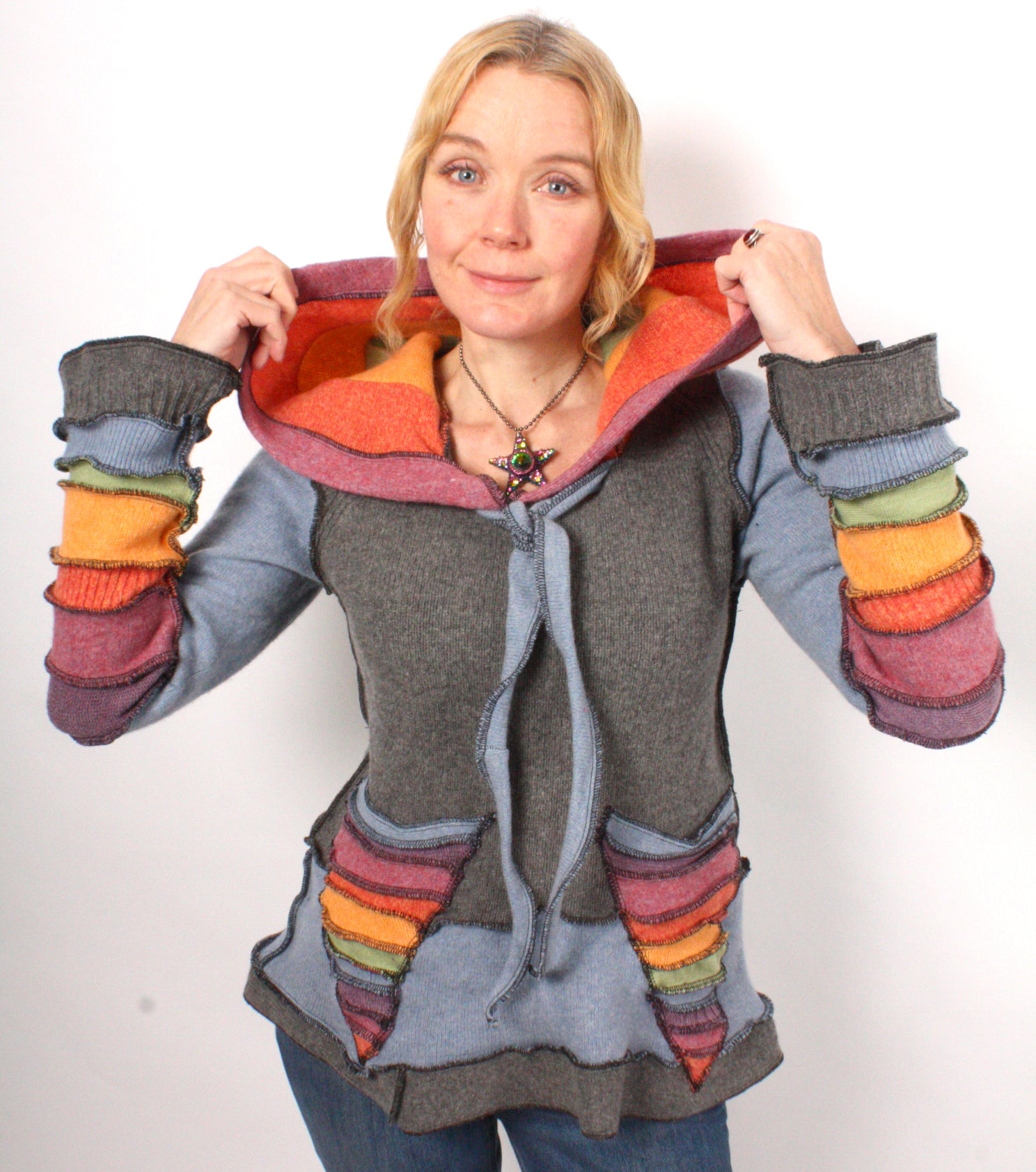 Each Katwise sweater is one-of-a-kind, sewn by me in my attic. They are perfectly imperfect, sometimes borderline wonky. They are all upcycled from sweaters I find in my vast thrift shopping expeditions. There is a huge variety in the texture and stretchiness of these knits, so no two are ever quite alike.