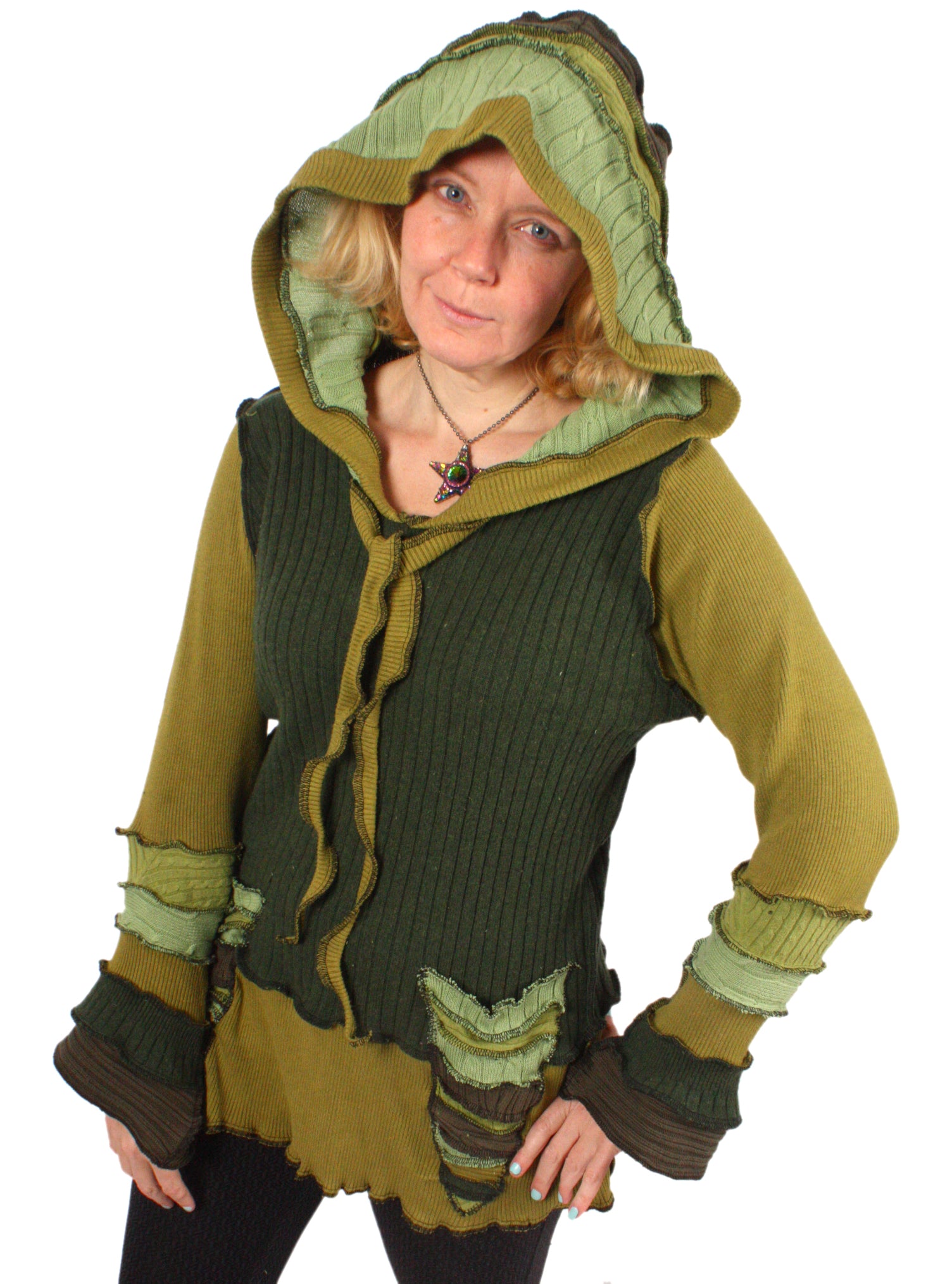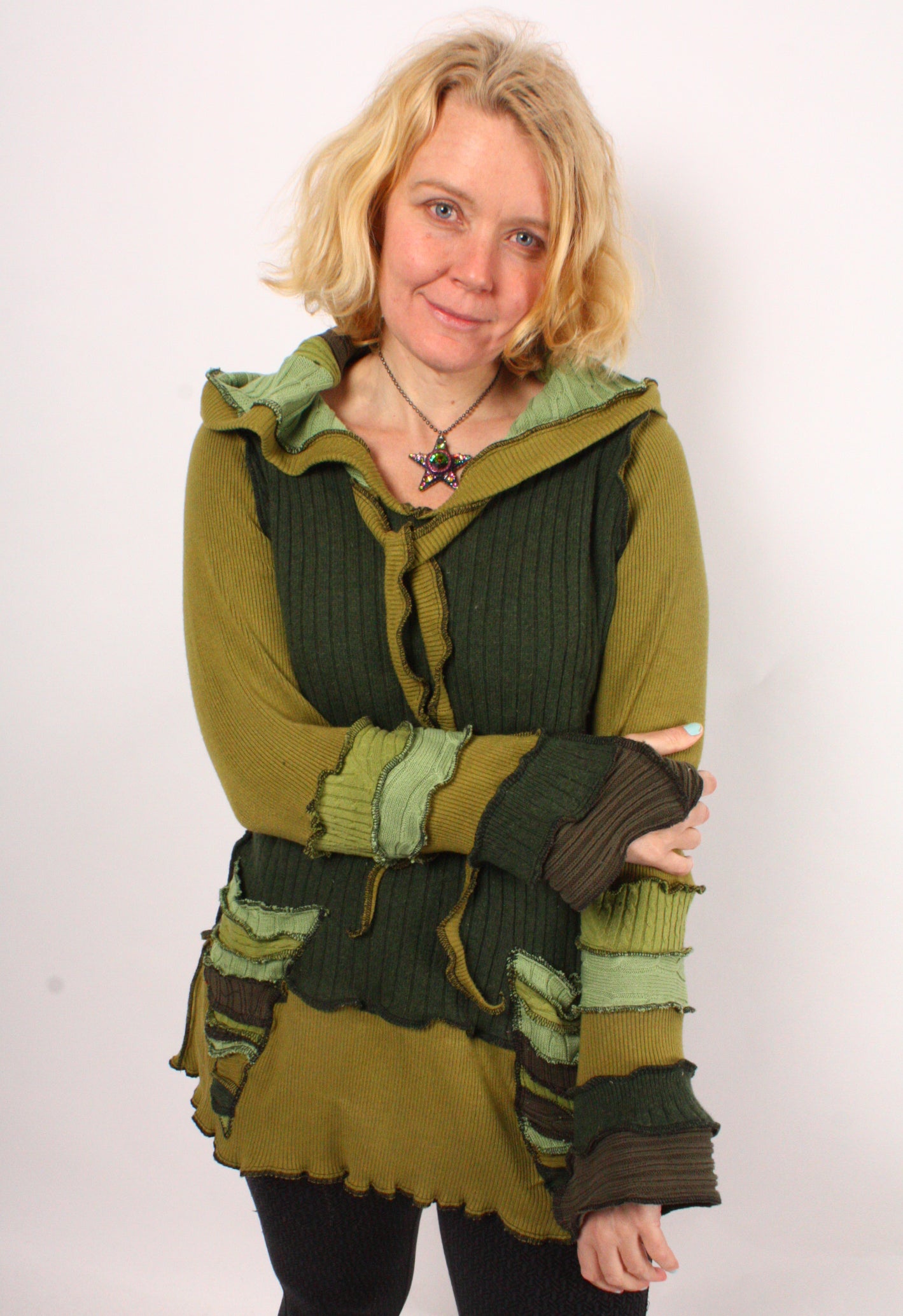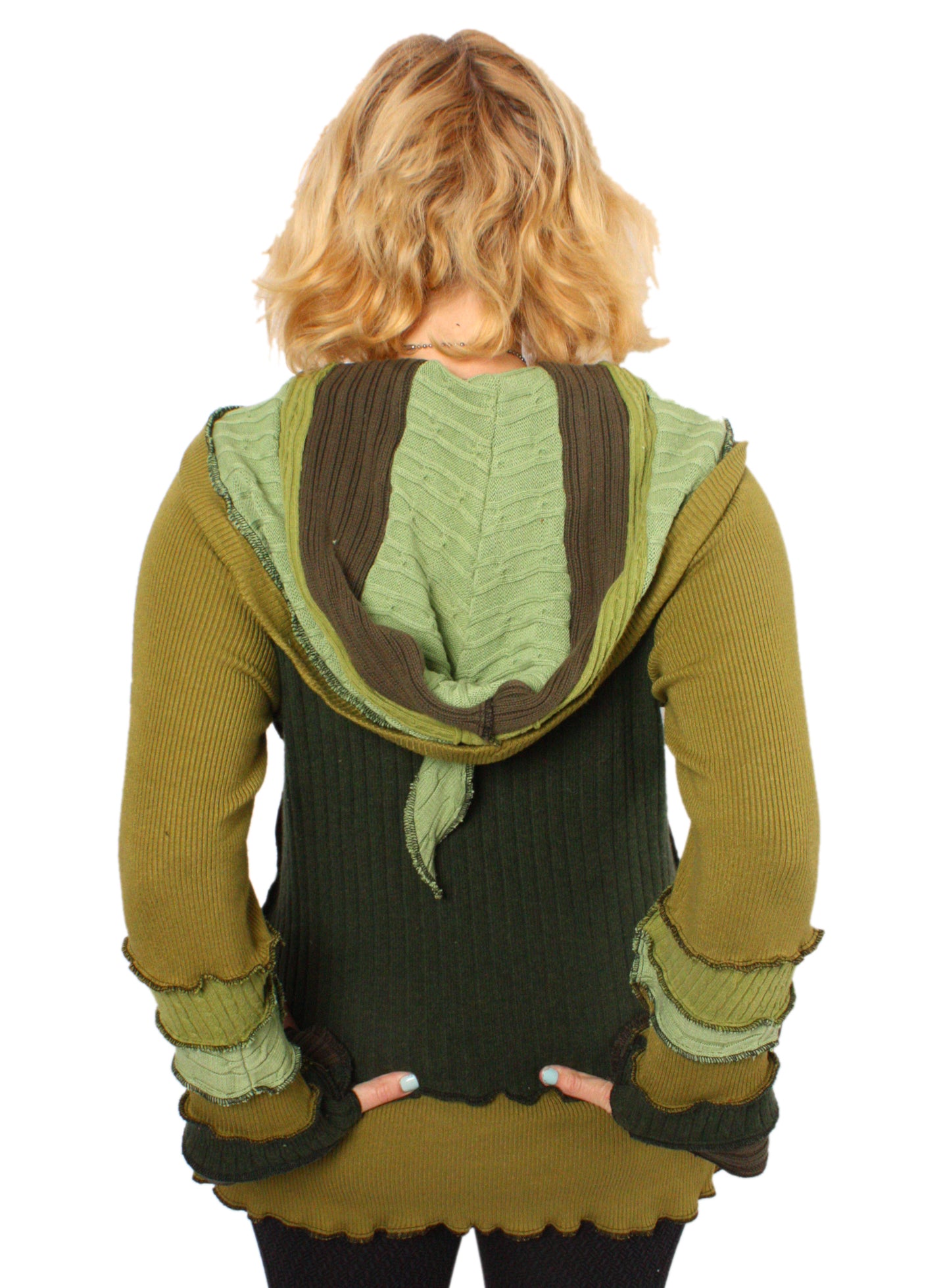 Each Katwise sweater is one-of-a-kind, sewn by me in my attic. They are perfectly imperfect, sometimes borderline wonky. They are all upcycled from sweaters I find in my vast thrift shopping expeditions. There is a huge variety in the texture and stretchiness of these knits, so no two are ever quite alike.