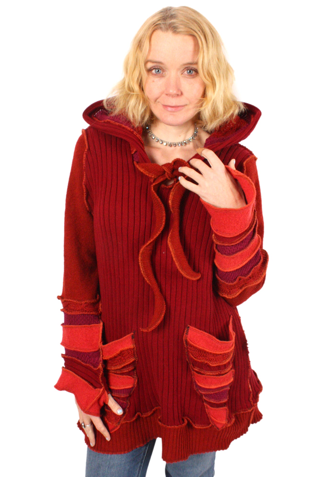 Venus in Bother Boots is a glowing tunic of molten reds and orange. The bodice is cotton and the accents are wool.