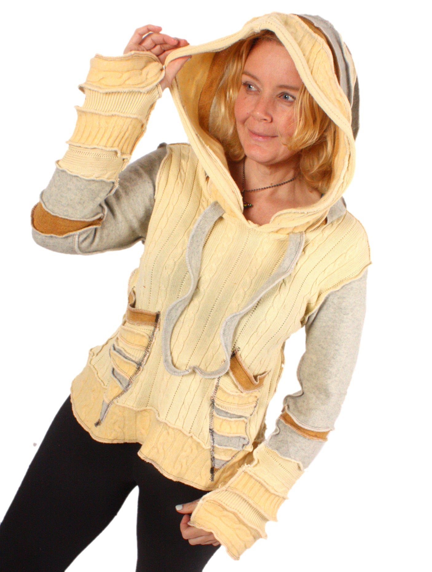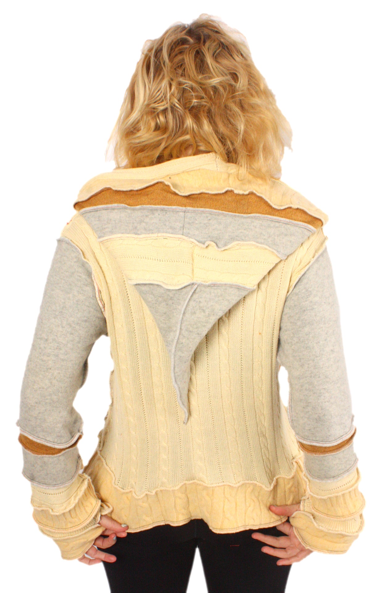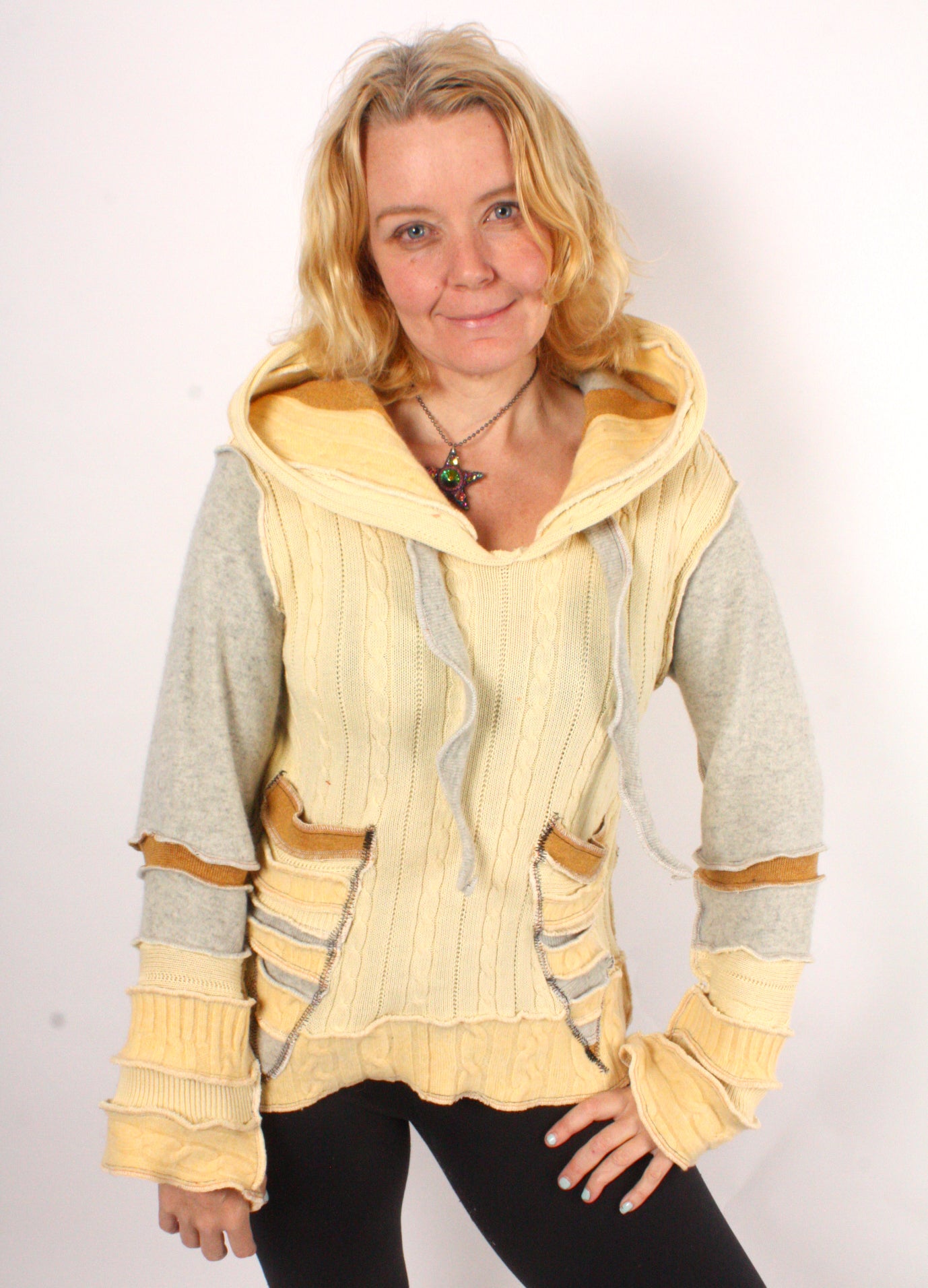 Each Katwise sweater is one-of-a-kind, sewn by me in my attic. They are perfectly imperfect, sometimes borderline wonky. They are all upcycled from sweaters I find in my vast thrift shopping expeditions. There is a huge variety in the texture and stretchiness of these knits, so no two are ever quite alike.