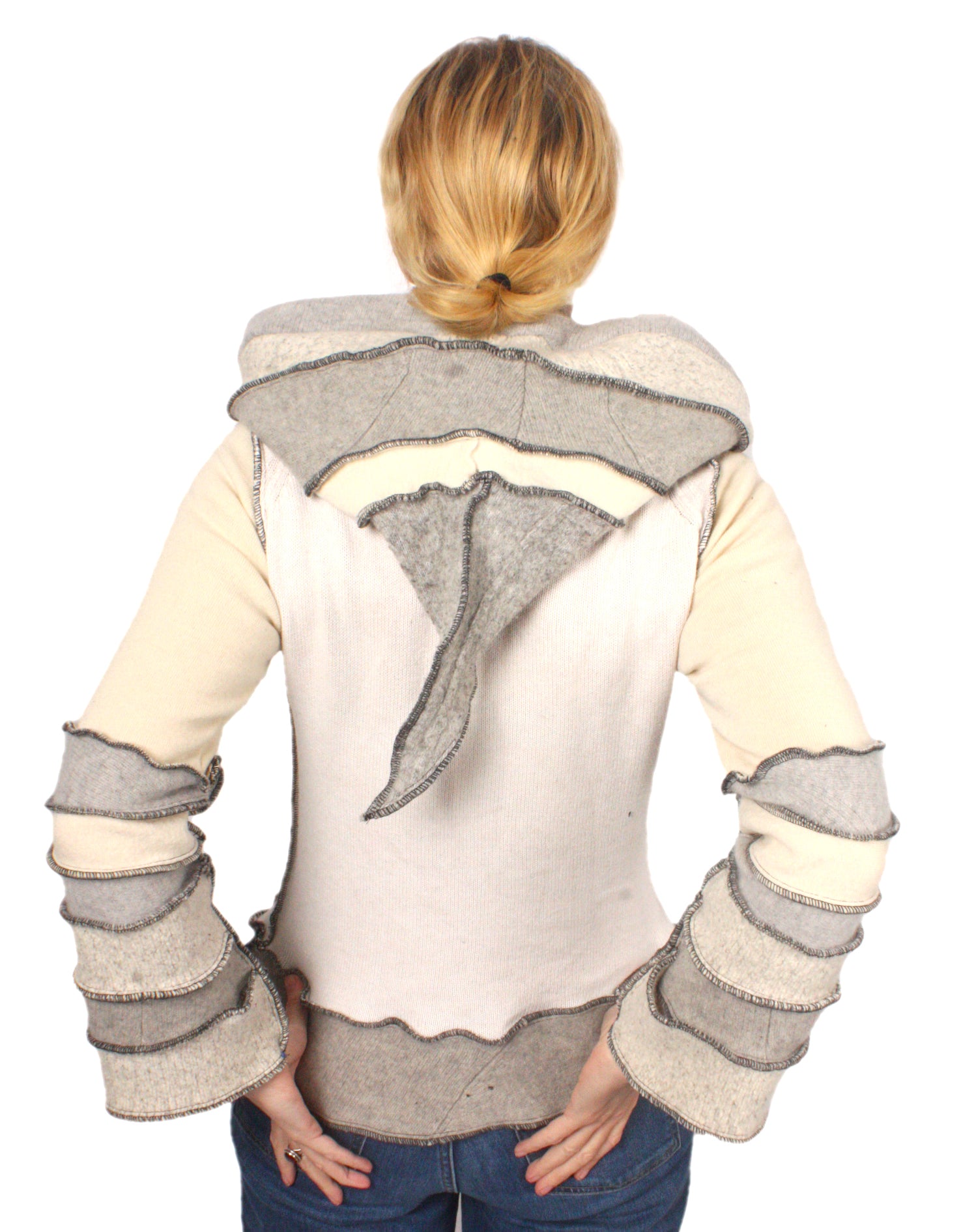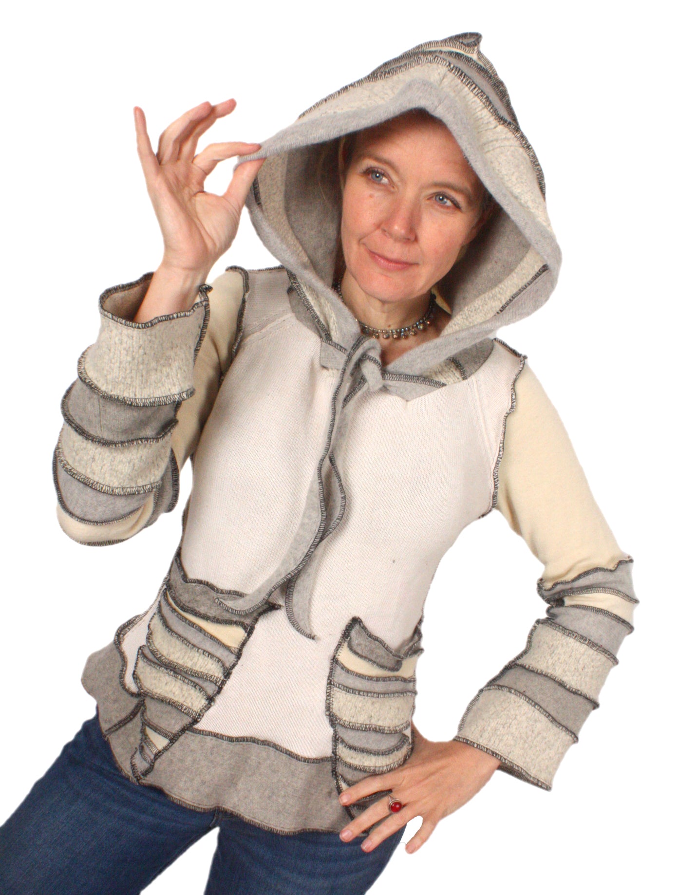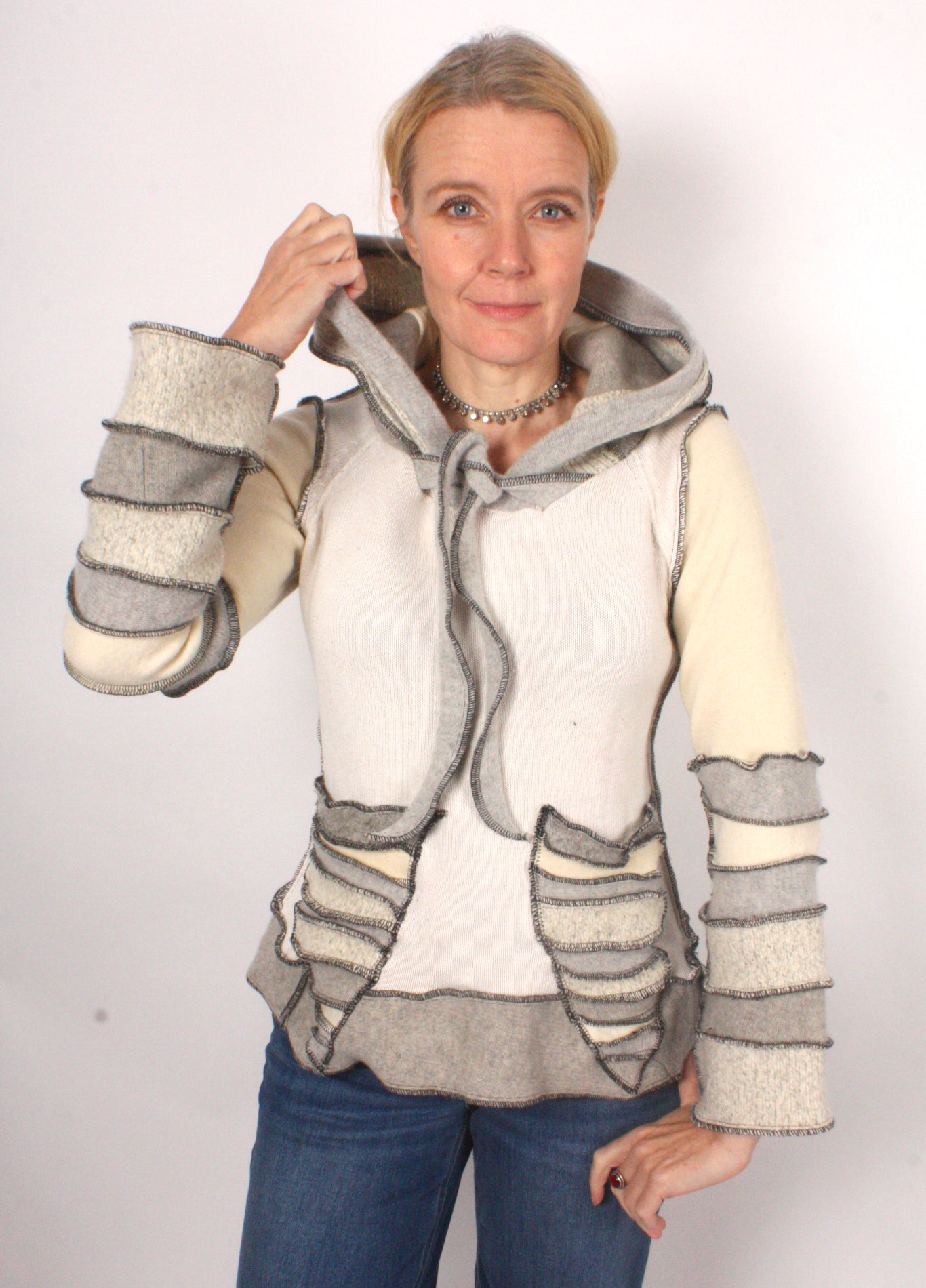 Each Katwise sweater is one-of-a-kind, sewn by me in my attic. They are perfectly imperfect, sometimes borderline wonky. They are all upcycled from sweaters I find in my vast thrift shopping expeditions. There is a huge variety in the texture and stretchiness of these knits, so no two are ever quite alike.