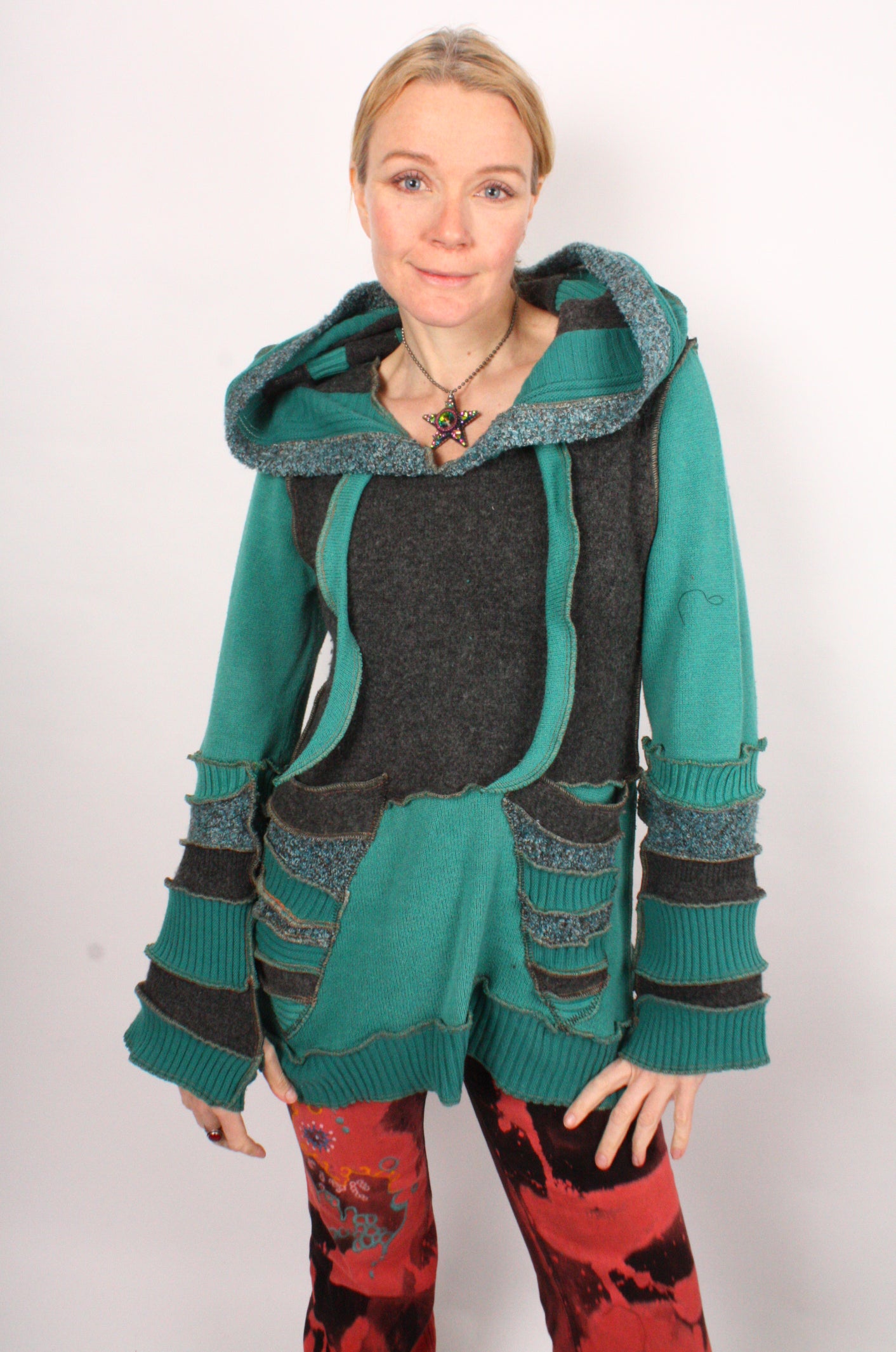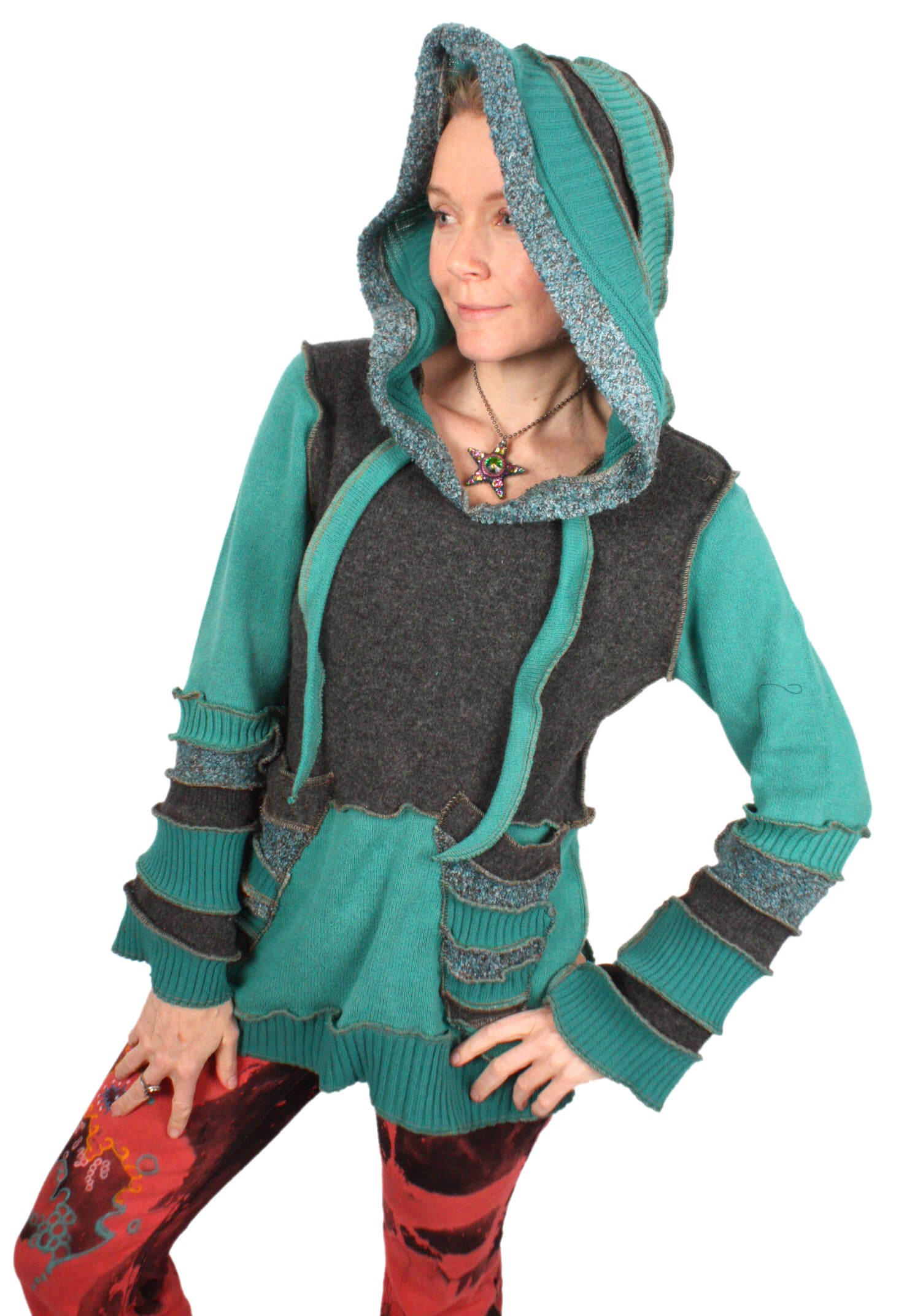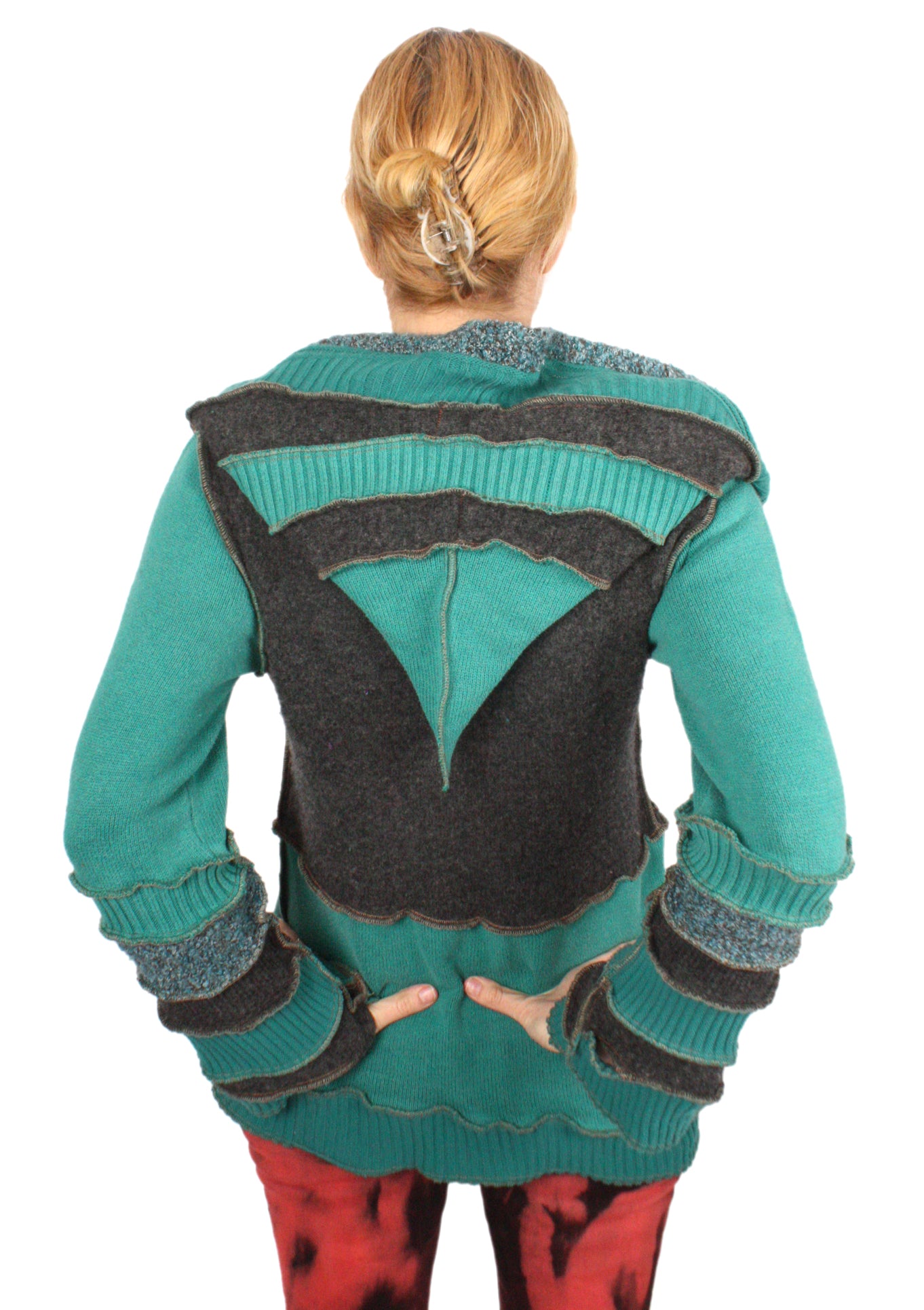 Each Katwise sweater is one-of-a-kind, sewn by me in my attic. They are perfectly imperfect, sometimes borderline wonky. They are all upcycled from sweaters I find in my vast thrift shopping expeditions. There is a huge variety in the texture and stretchiness of these knits, so no two are ever quite alike.