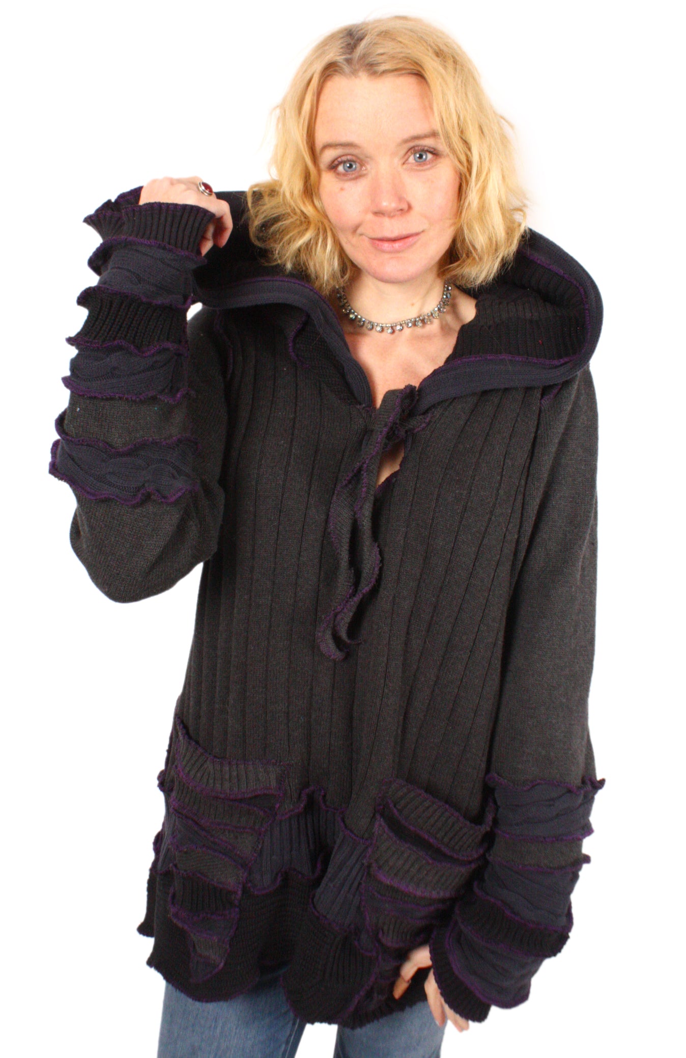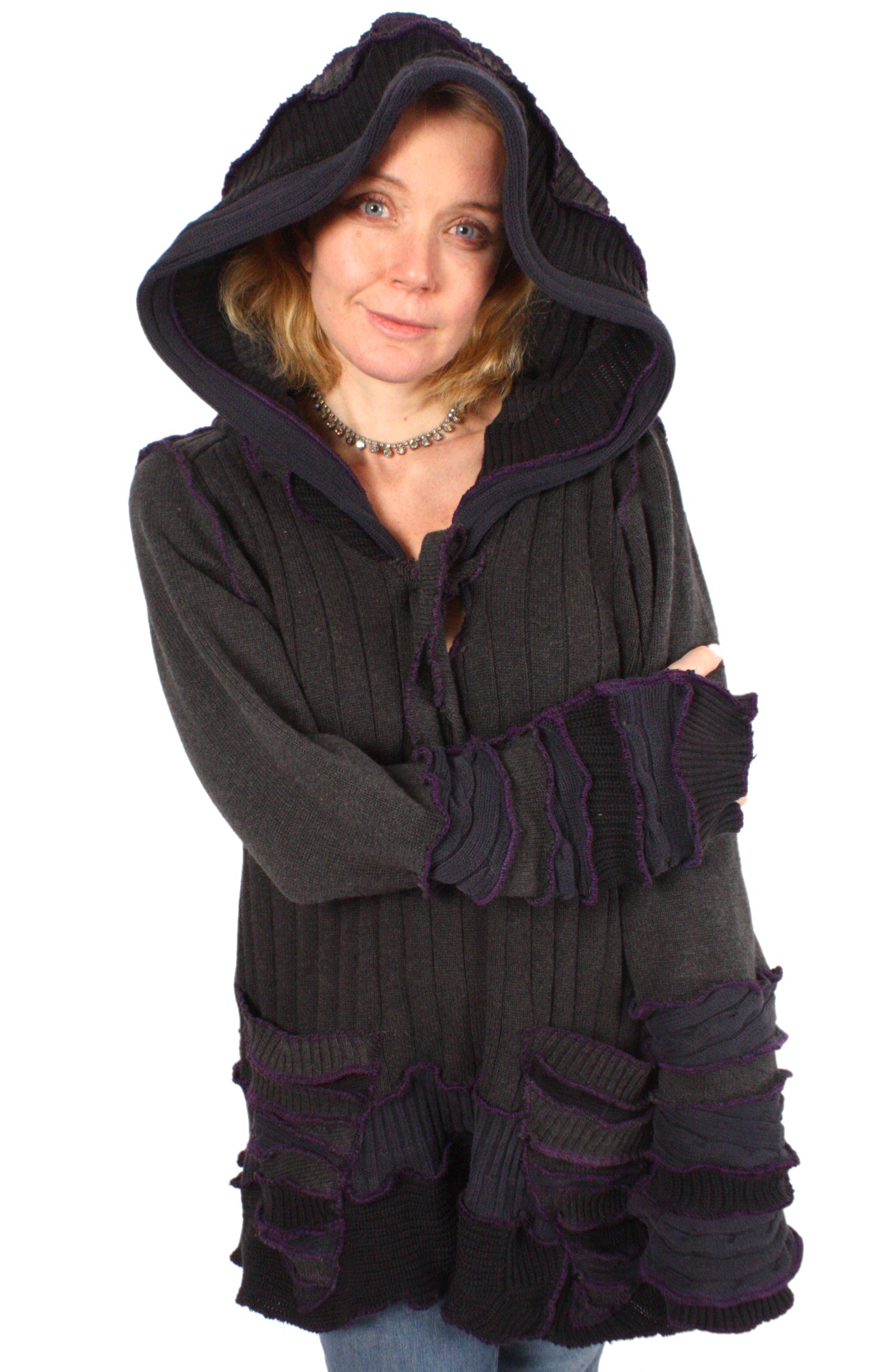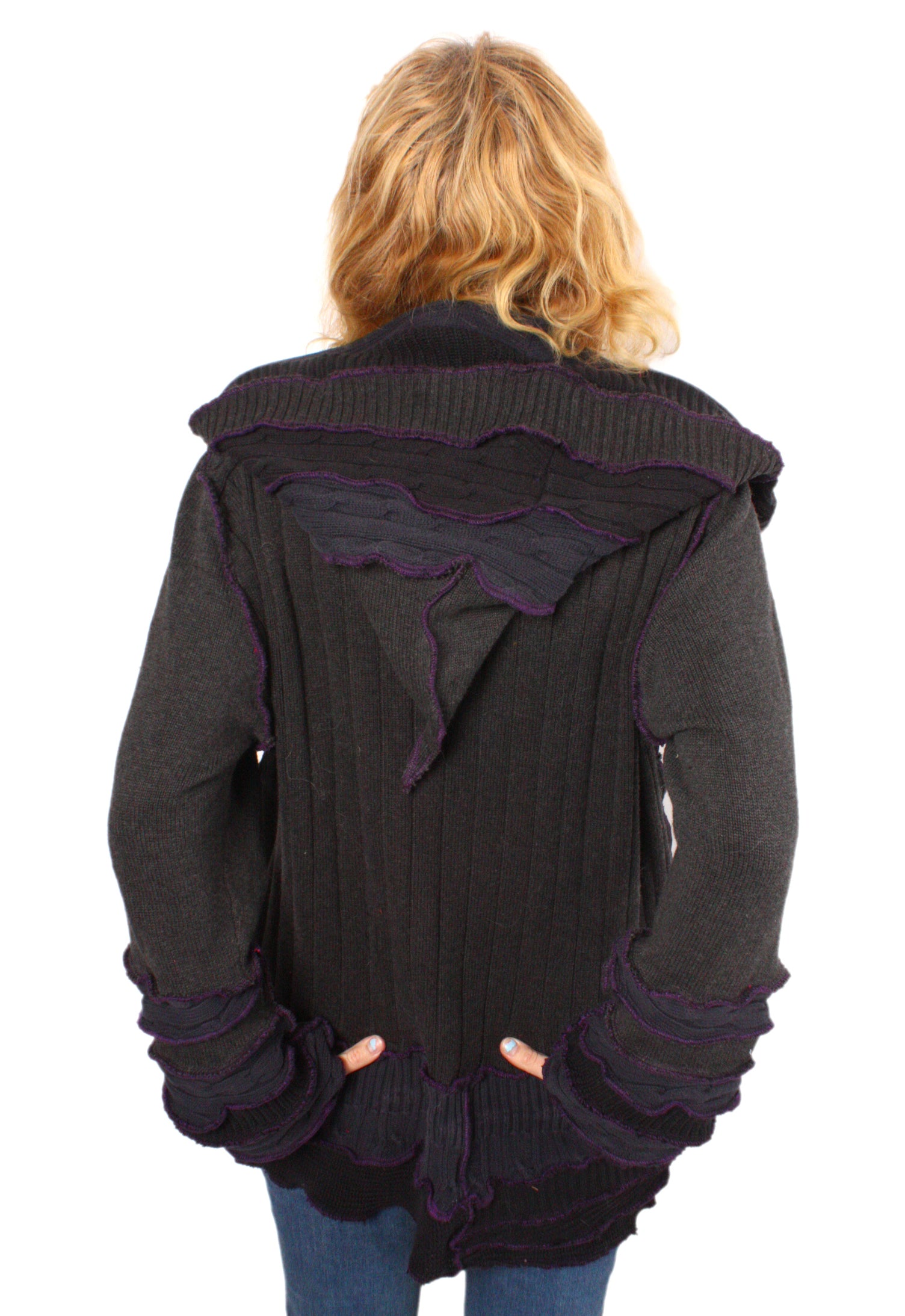 Each Katwise sweater is one-of-a-kind, sewn by me in my attic. They are perfectly imperfect, sometimes borderline wonky. They are all upcycled from sweaters I find in my vast thrift shopping expeditions. There is a huge variety in the texture and stretchiness of these knits, so no two are ever quite alike.
