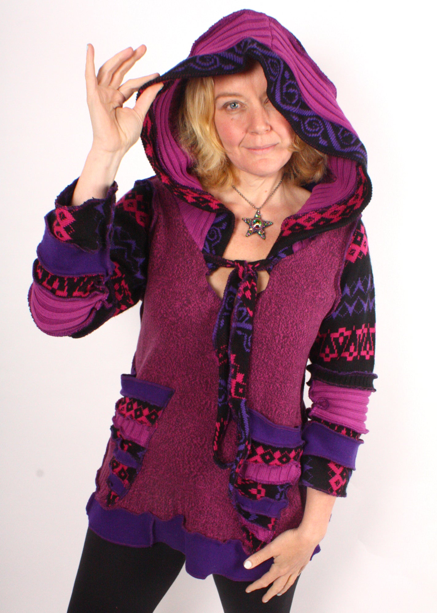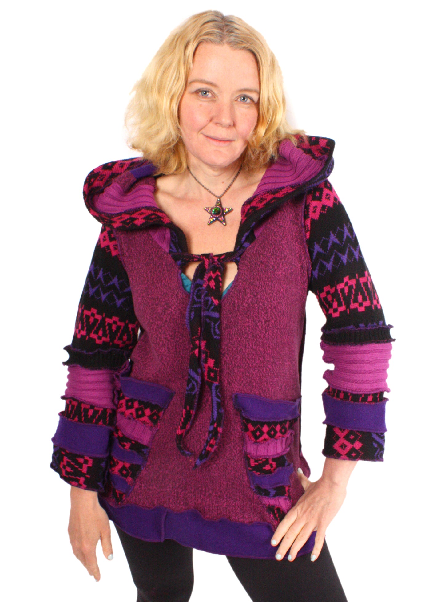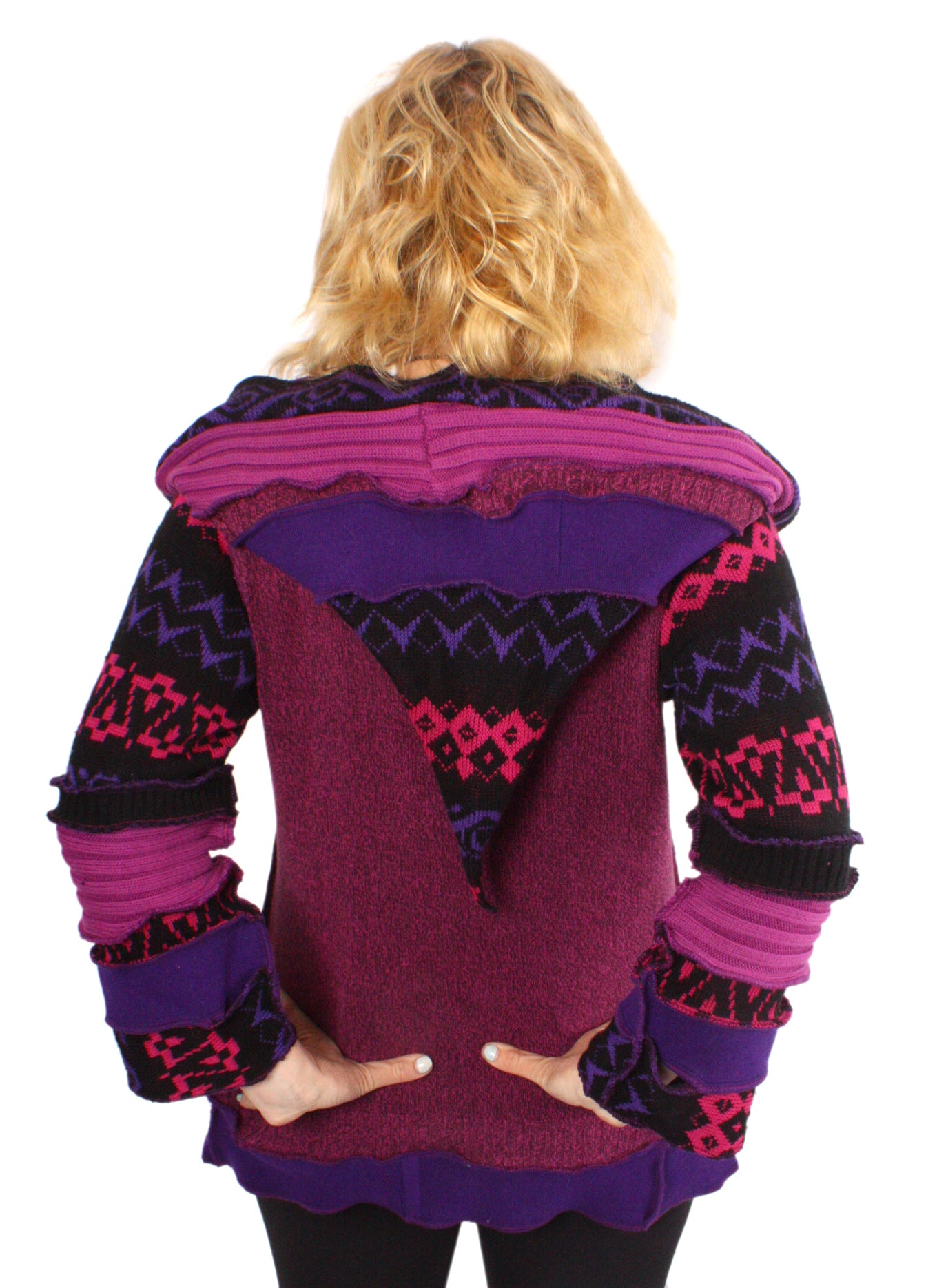 Each Katwise sweater is one-of-a-kind, sewn by me in my attic. They are perfectly imperfect, sometimes borderline wonky. They are all upcycled from sweaters I find in my vast thrift shopping expeditions. There is a huge variety in the texture and stretchiness of these knits, so no two are ever quite alike.