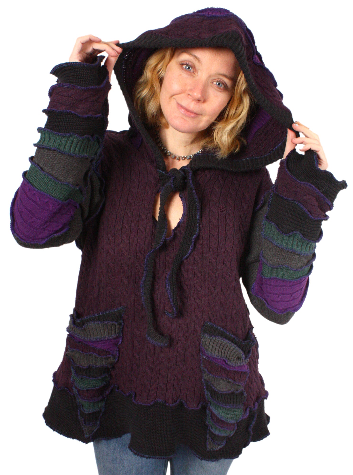 Waxie's Dargle is a proud purple pullover of cable-knit cotton with subtle green undertones. 100% cotton.