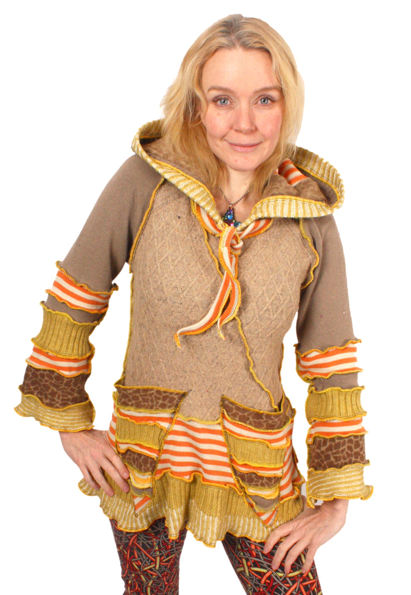 Each Katwise sweater is one-of-a-kind, sewn by me in my attic. They are perfectly imperfect, sometimes borderline wonky. They are all upcycled from sweaters I find in my vast thrift shopping expeditions. There is a huge variety in the texture and stretchiness of these knits, so no two are ever quite alike.