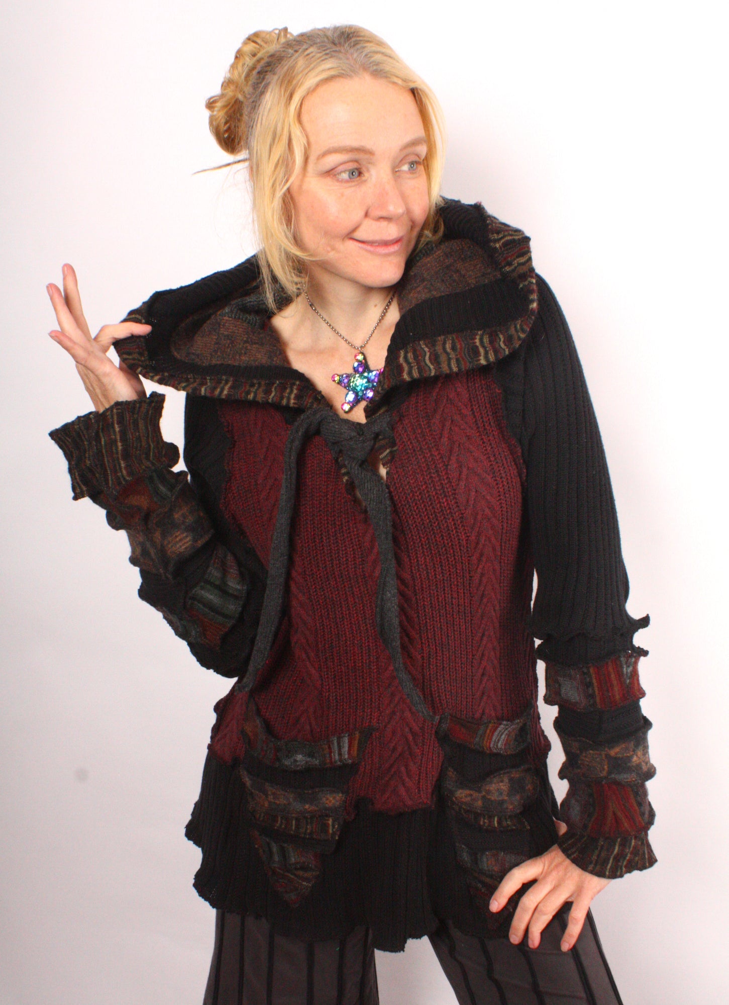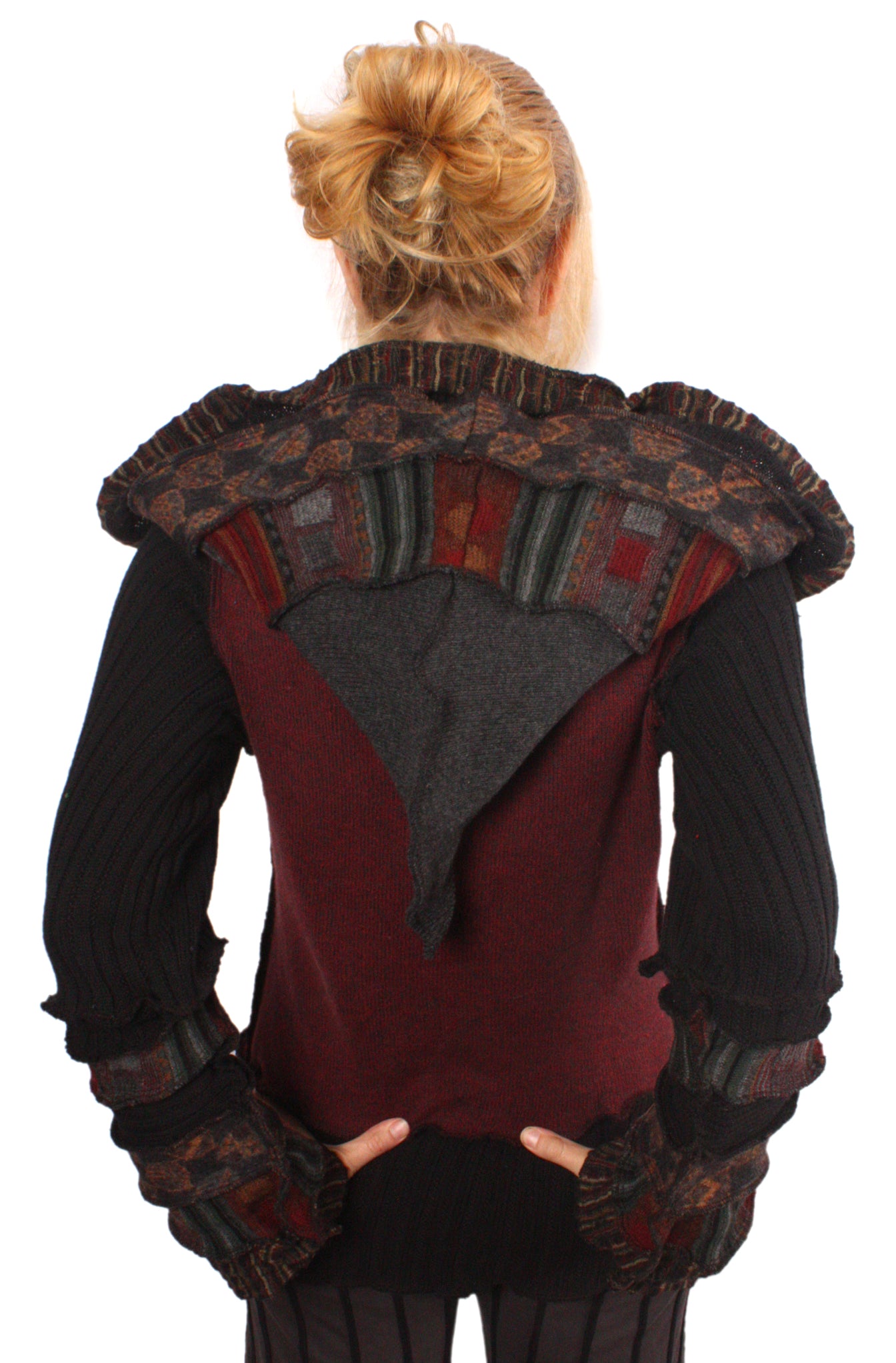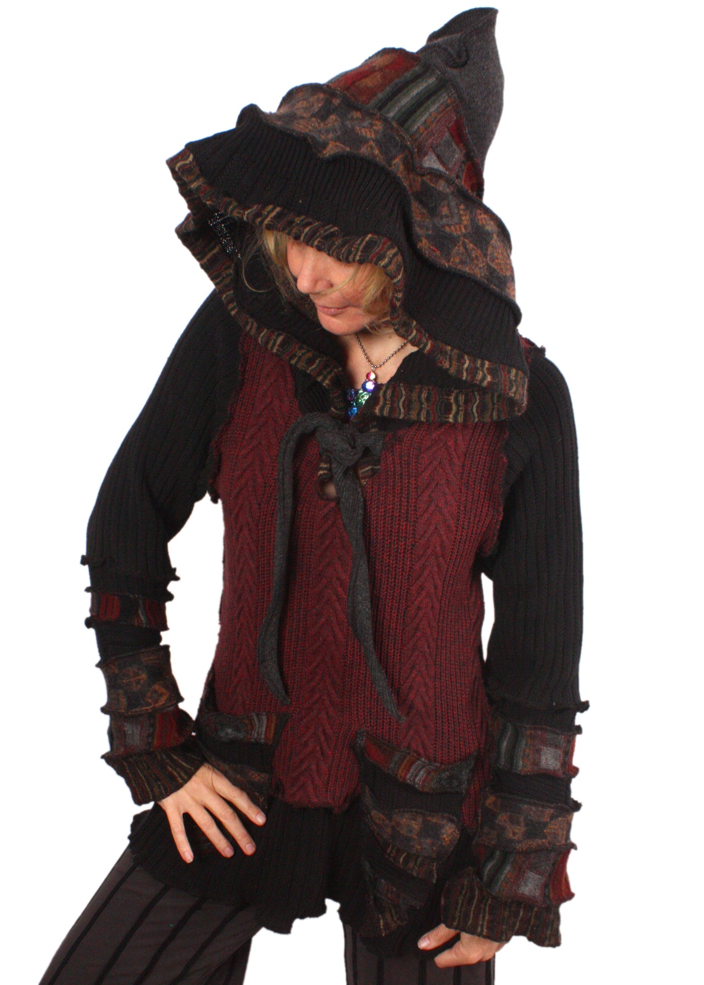 Rattlesnake Plantain is a beautiful burgundy and black tunic with cool rusty-hued patterns. It's mostly cotton with a smattering of wool. The hood's a little extra roomy on this one.