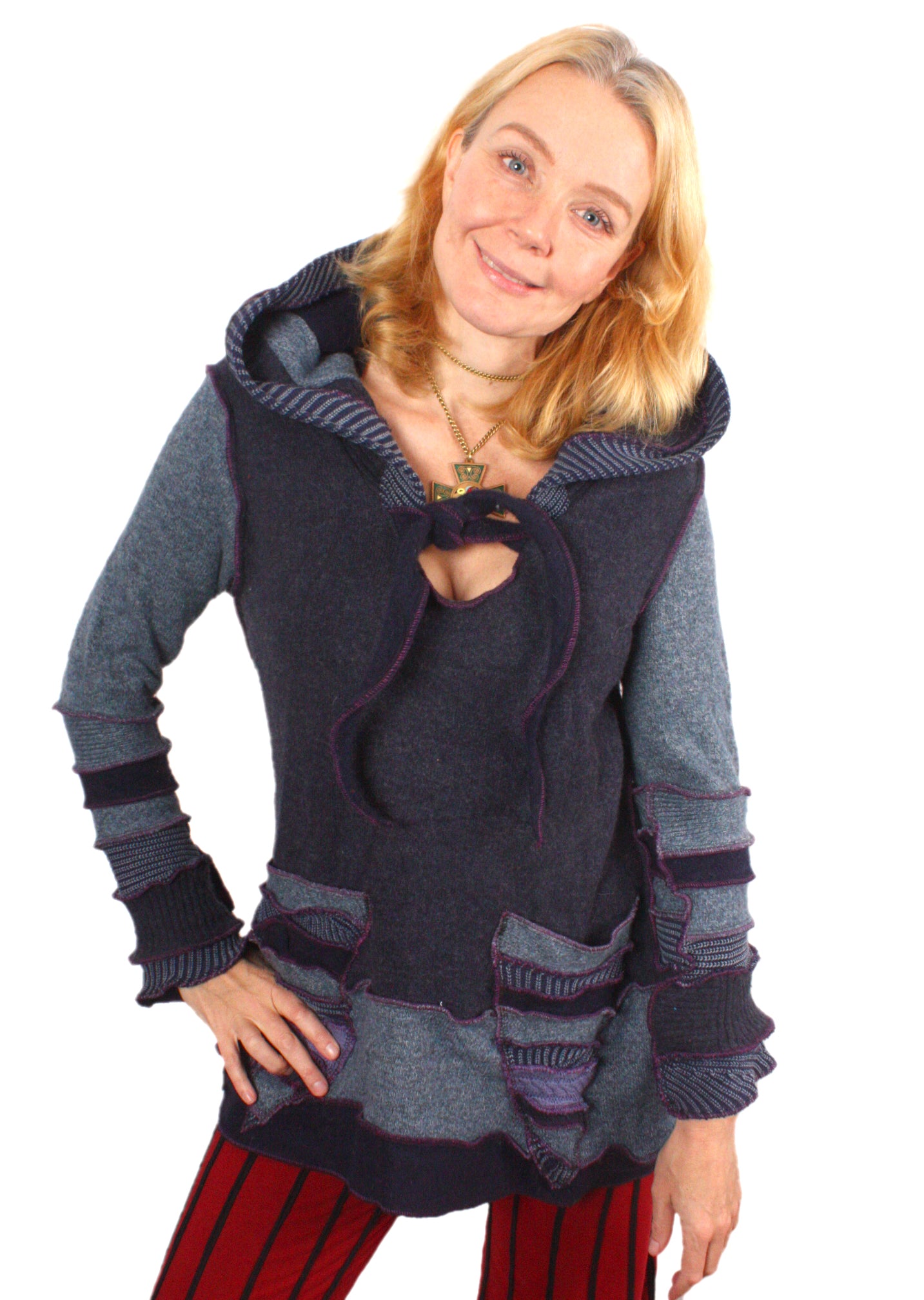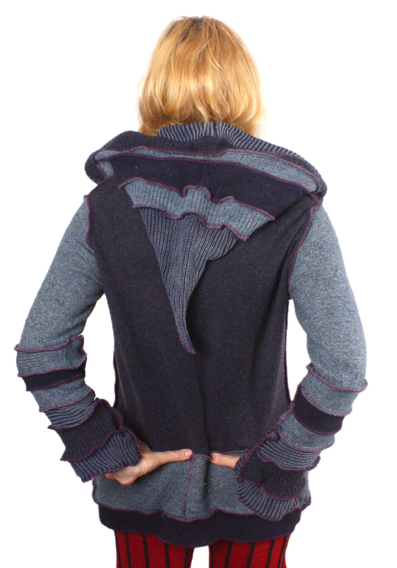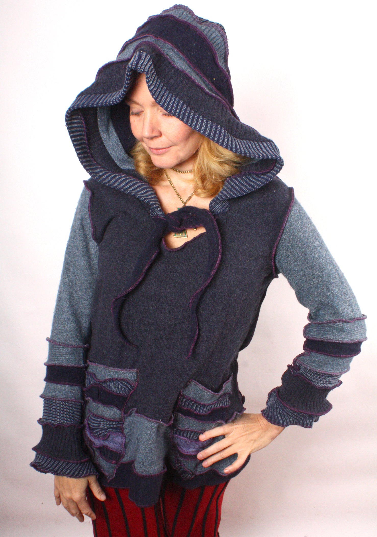 Each Katwise sweater is one-of-a-kind, sewn by me in my attic. They are perfectly imperfect, sometimes borderline wonky. They are all upcycled from sweaters I find in my vast thrift shopping expeditions. There is a huge variety in the texture and stretchiness of these knits, so no two are ever quite alike.