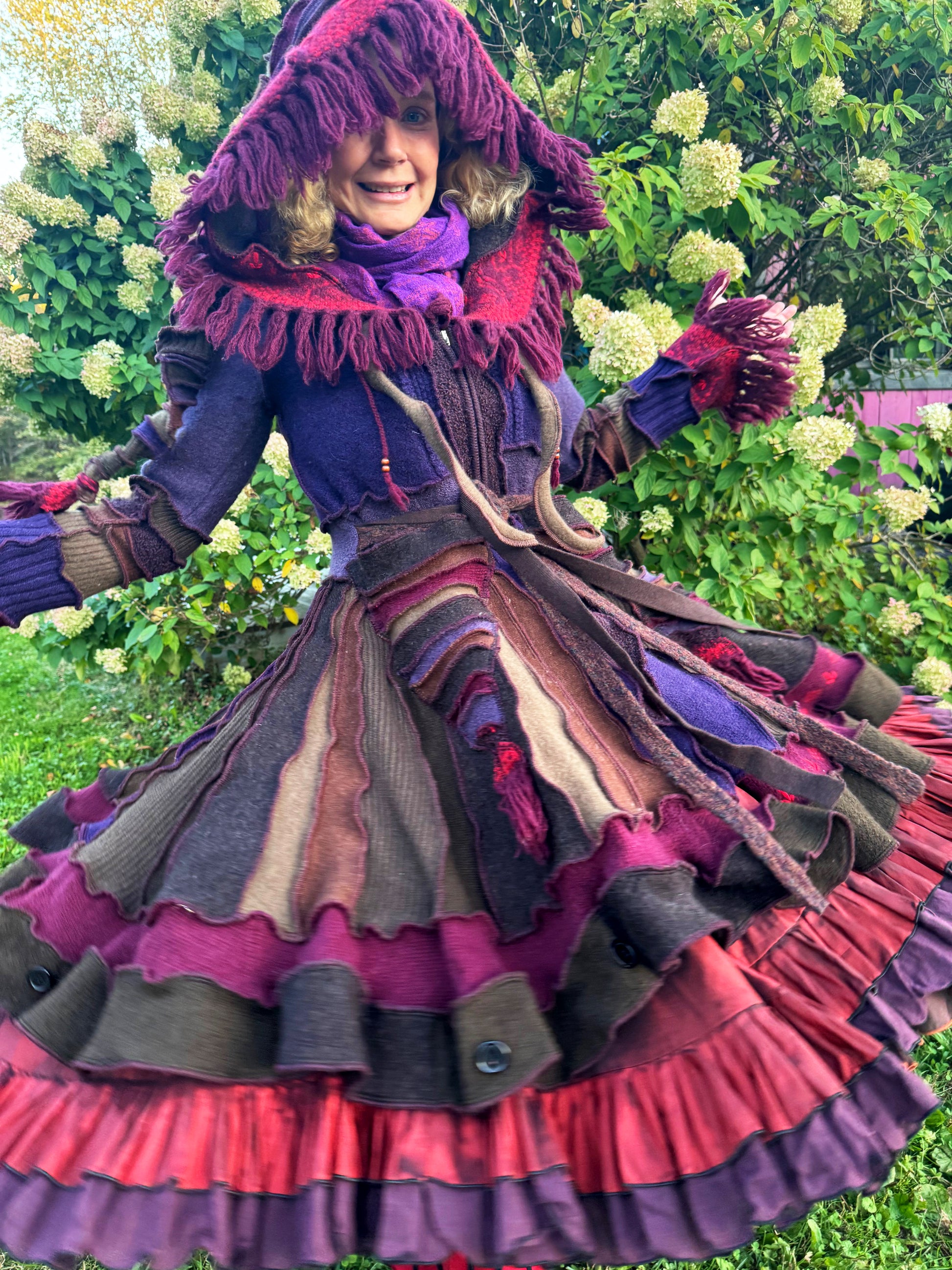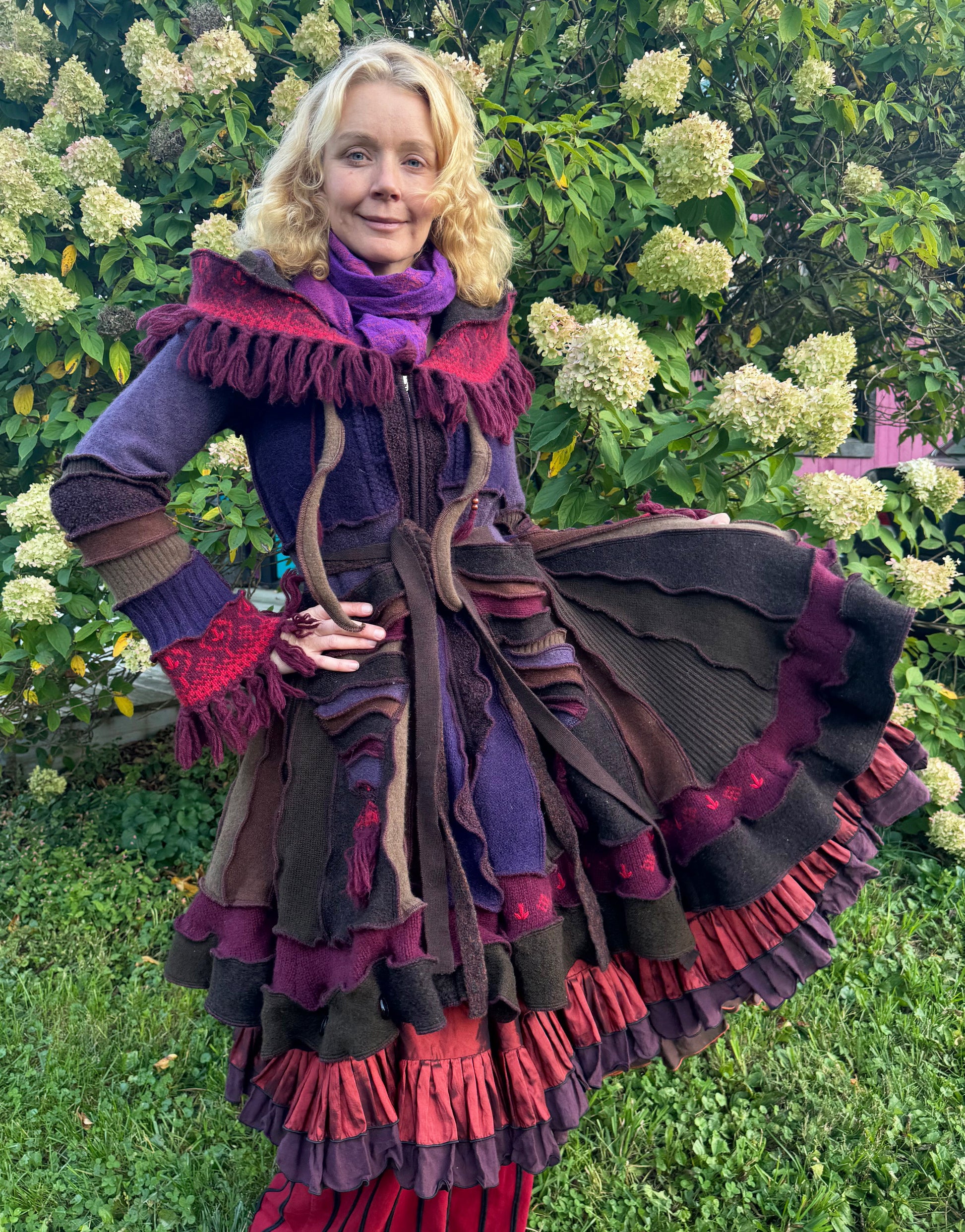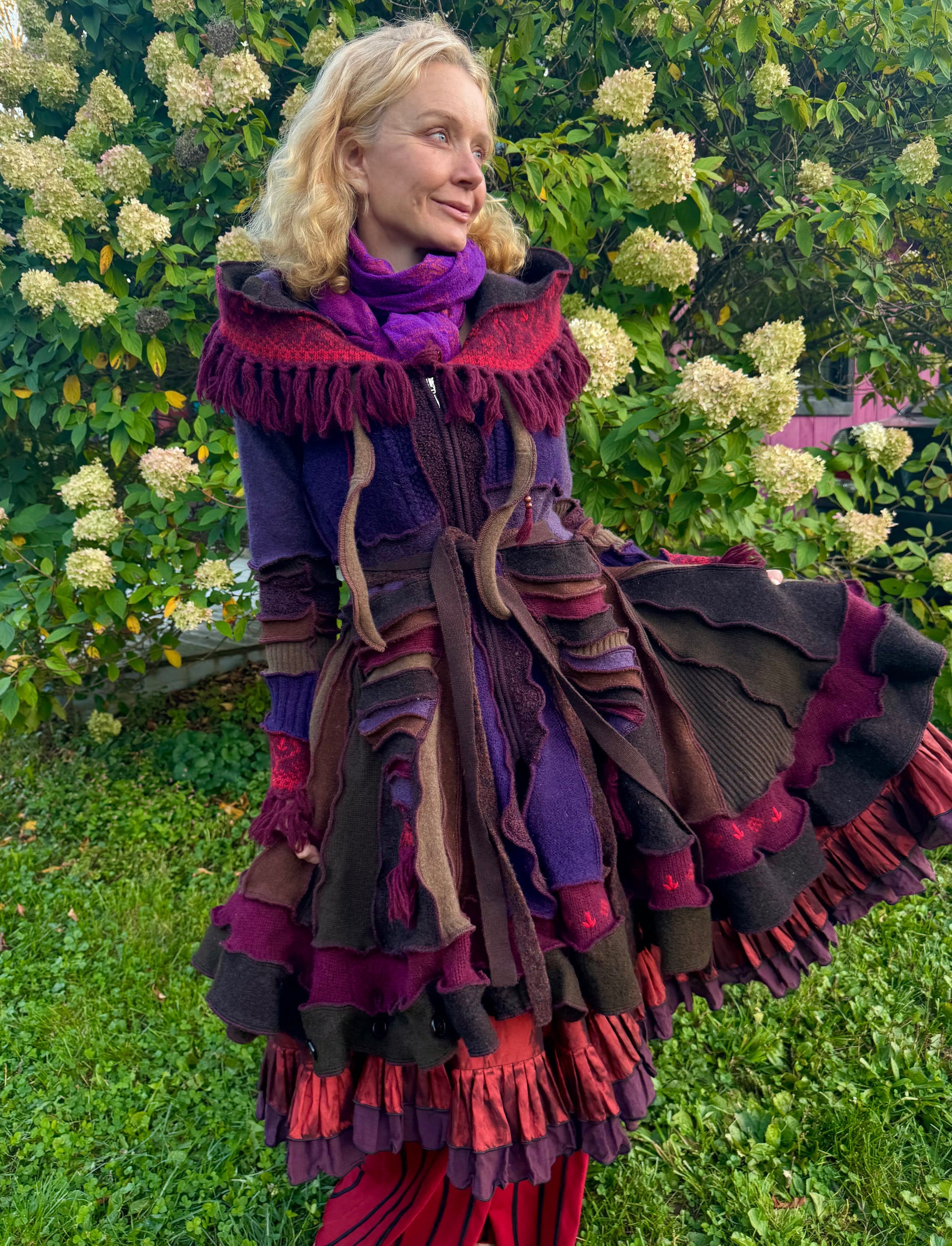Melpomene is a harmonically balanced, magnificently woodsy coat with fringey trim. It's made of warm purply brown wool, ribboned with scarlet, and has a long zipper front.