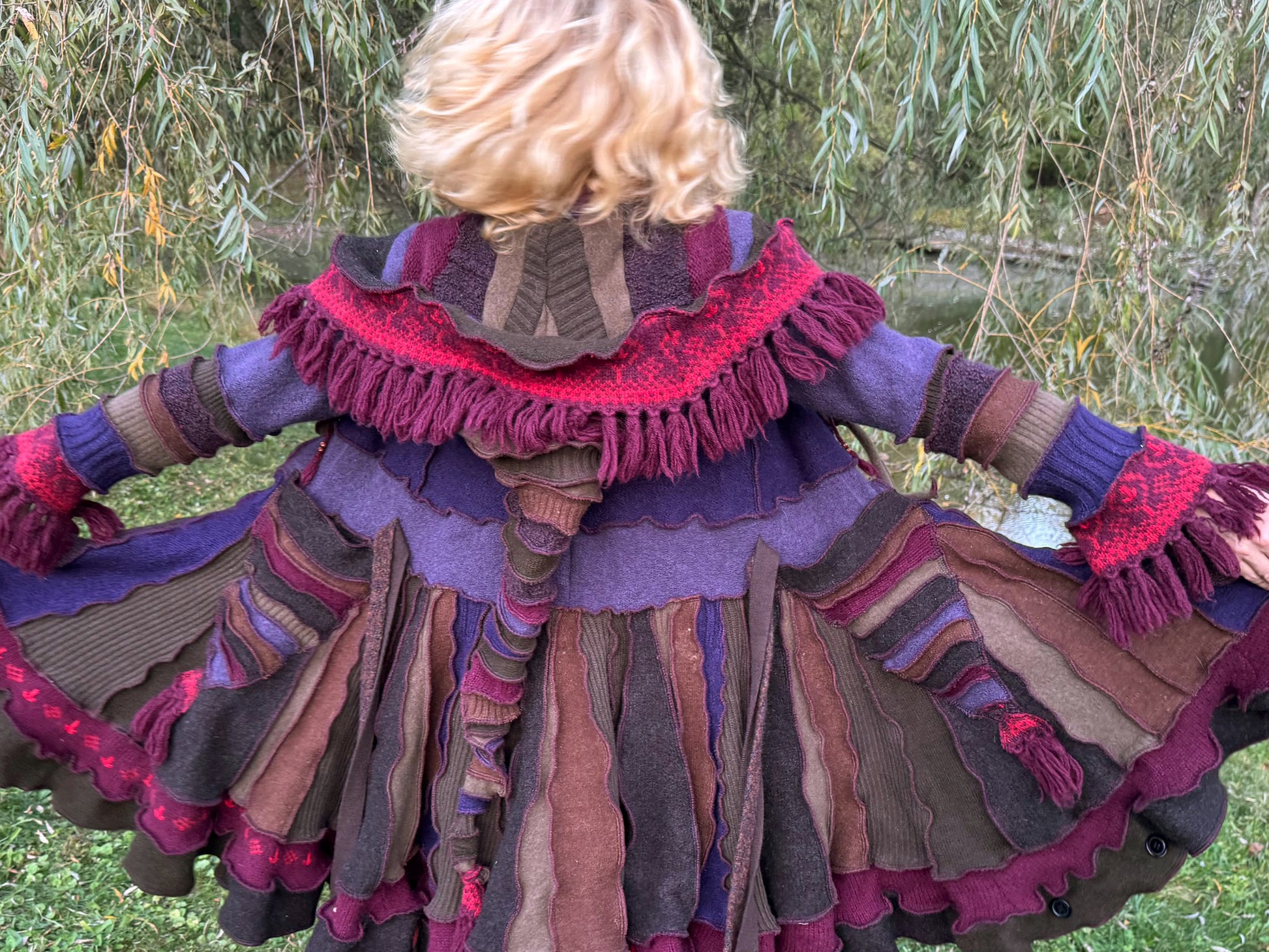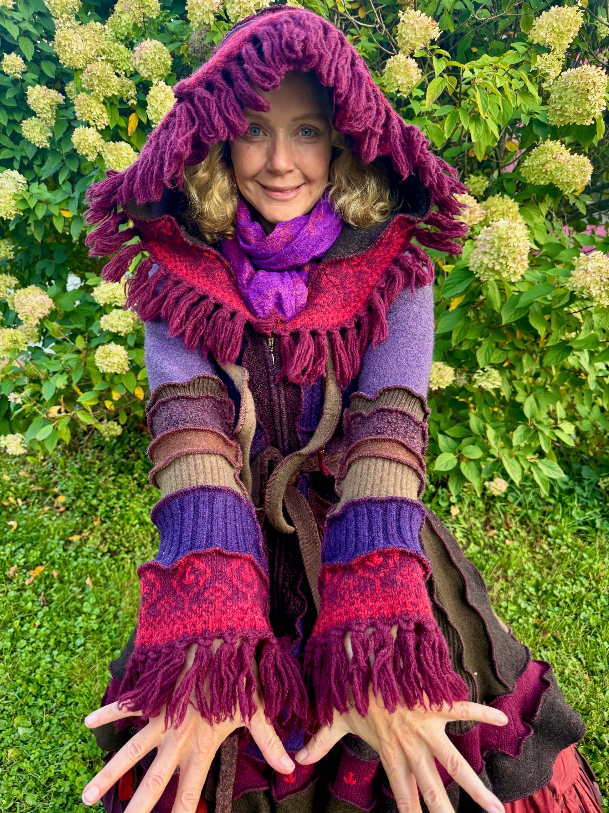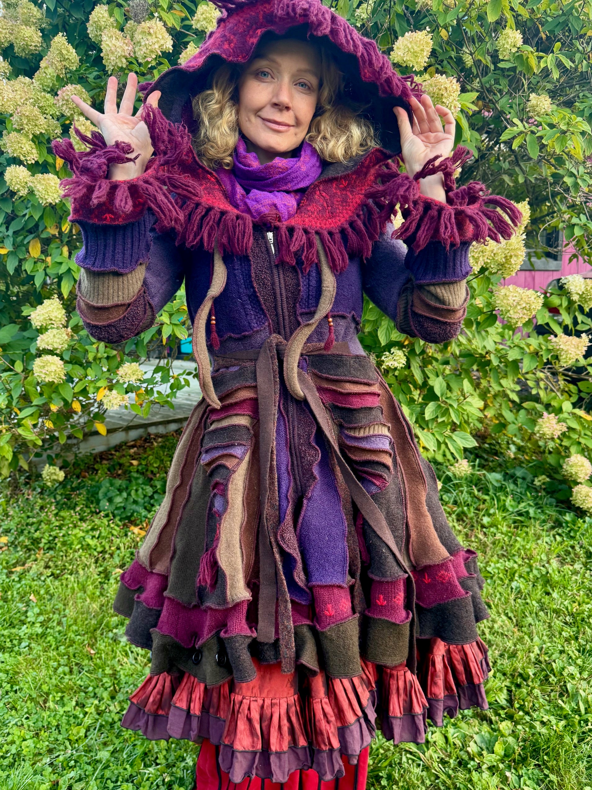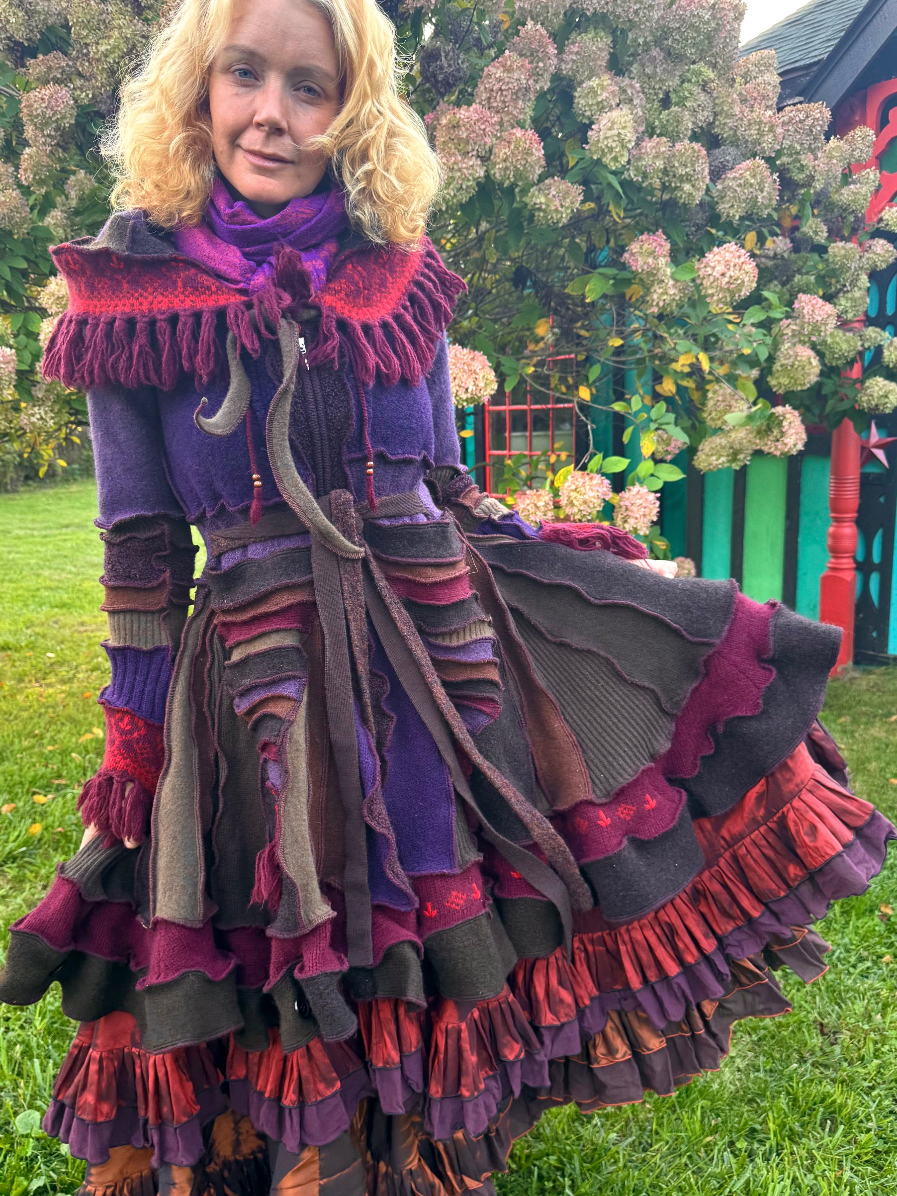 Melpomene is a harmonically balanced, magnificently woodsy coat with fringey trim. It's made of warm purply brown wool, ribboned with scarlet, and has a long zipper front.
