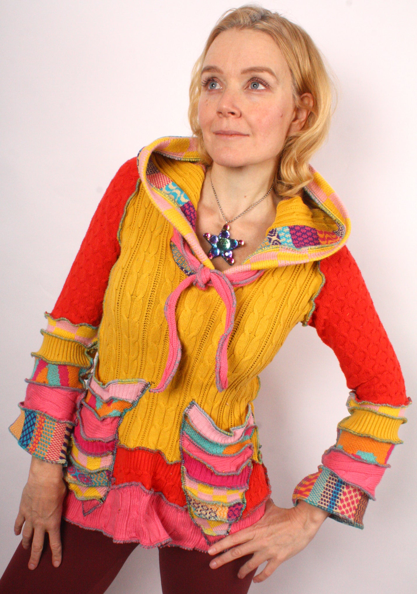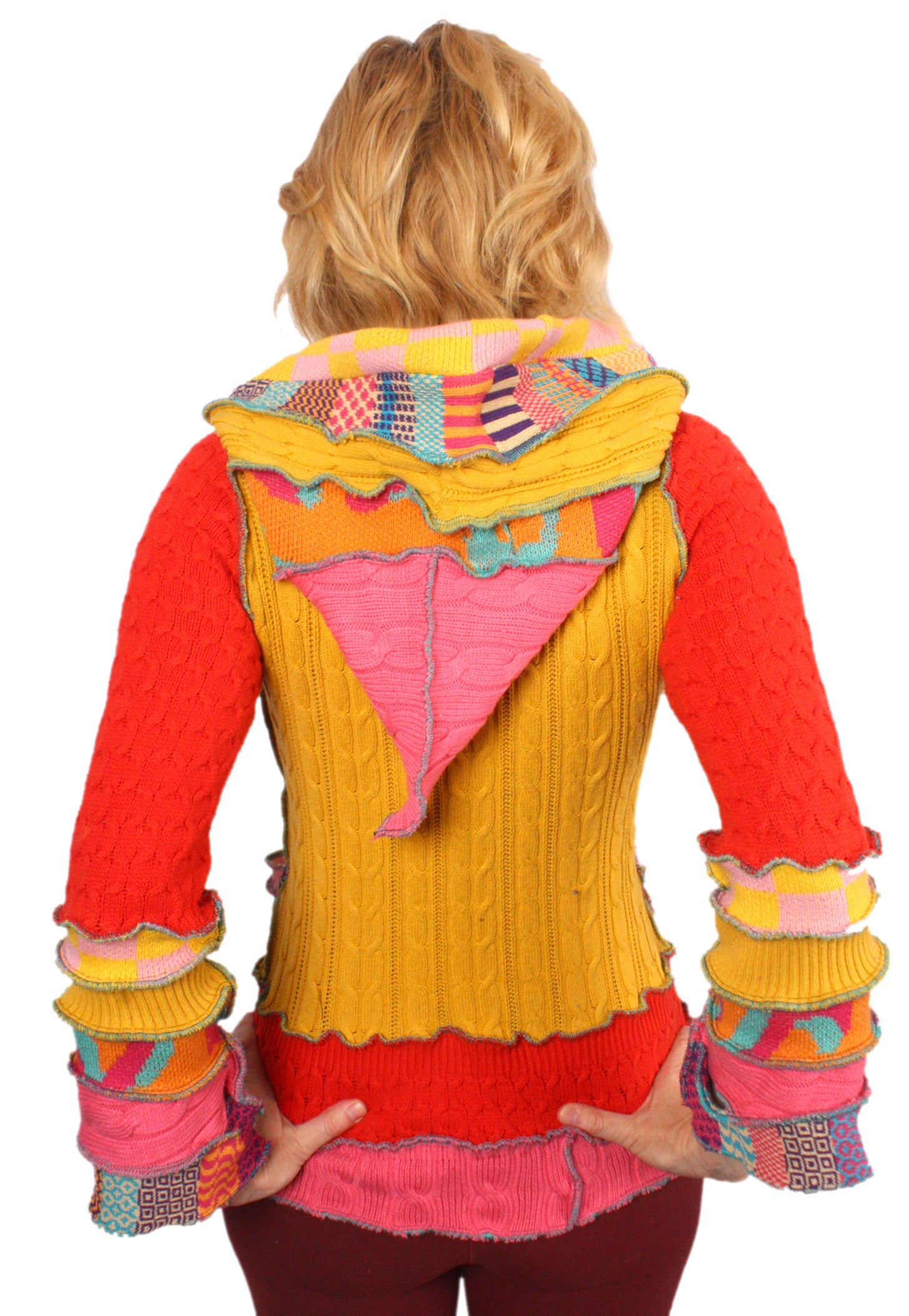 Each Katwise sweater is one-of-a-kind, sewn by me in my attic. They are perfectly imperfect, sometimes borderline wonky. They are all upcycled from sweaters I find in my vast thrift shopping expeditions. There is a huge variety in the texture and stretchiness of these knits, so no two are ever quite alike.