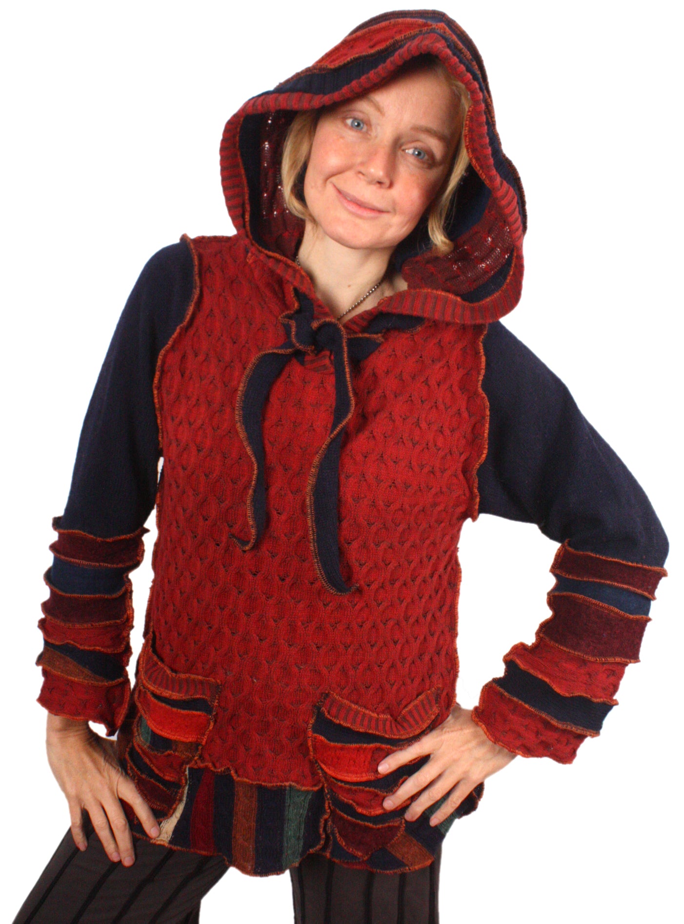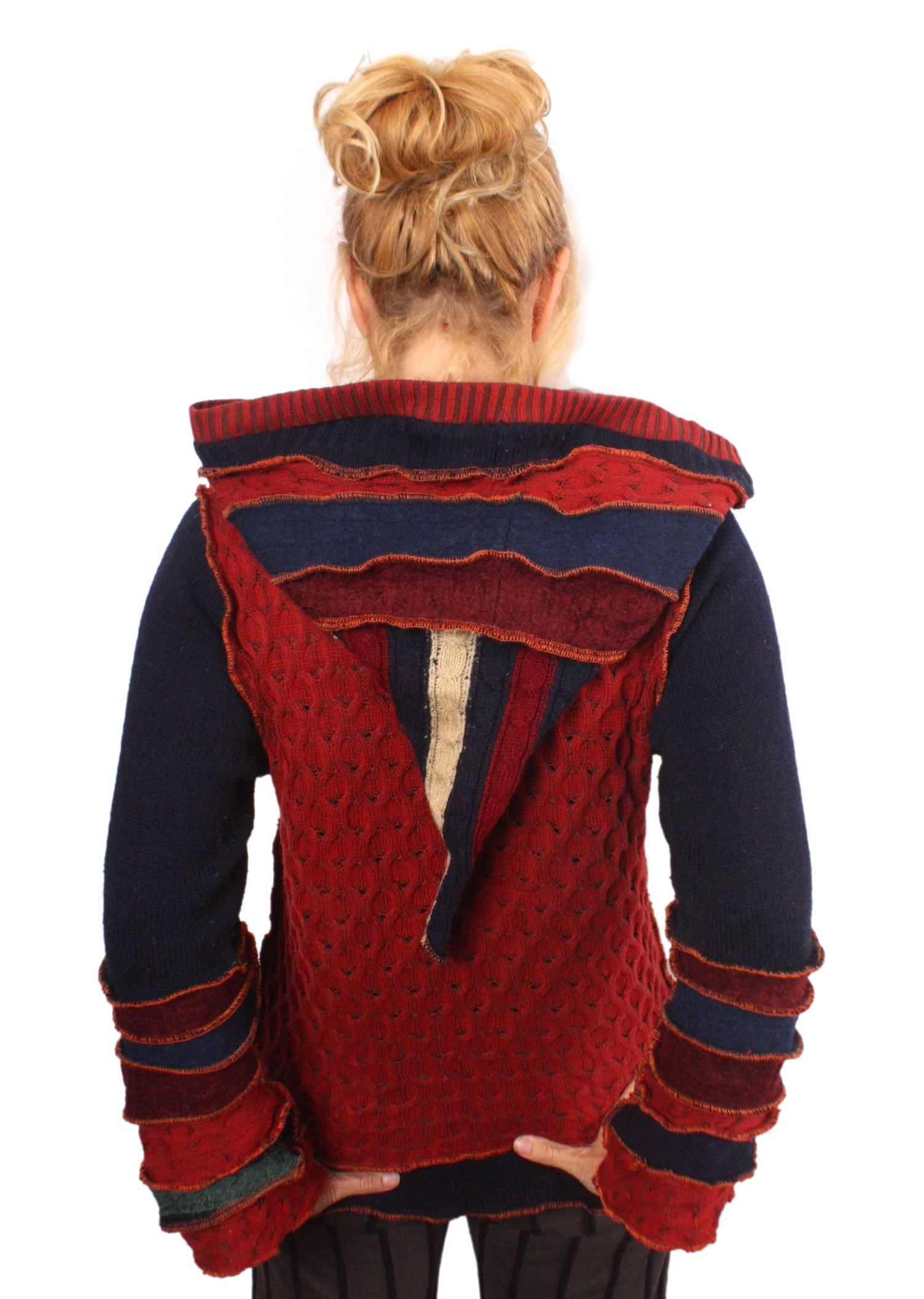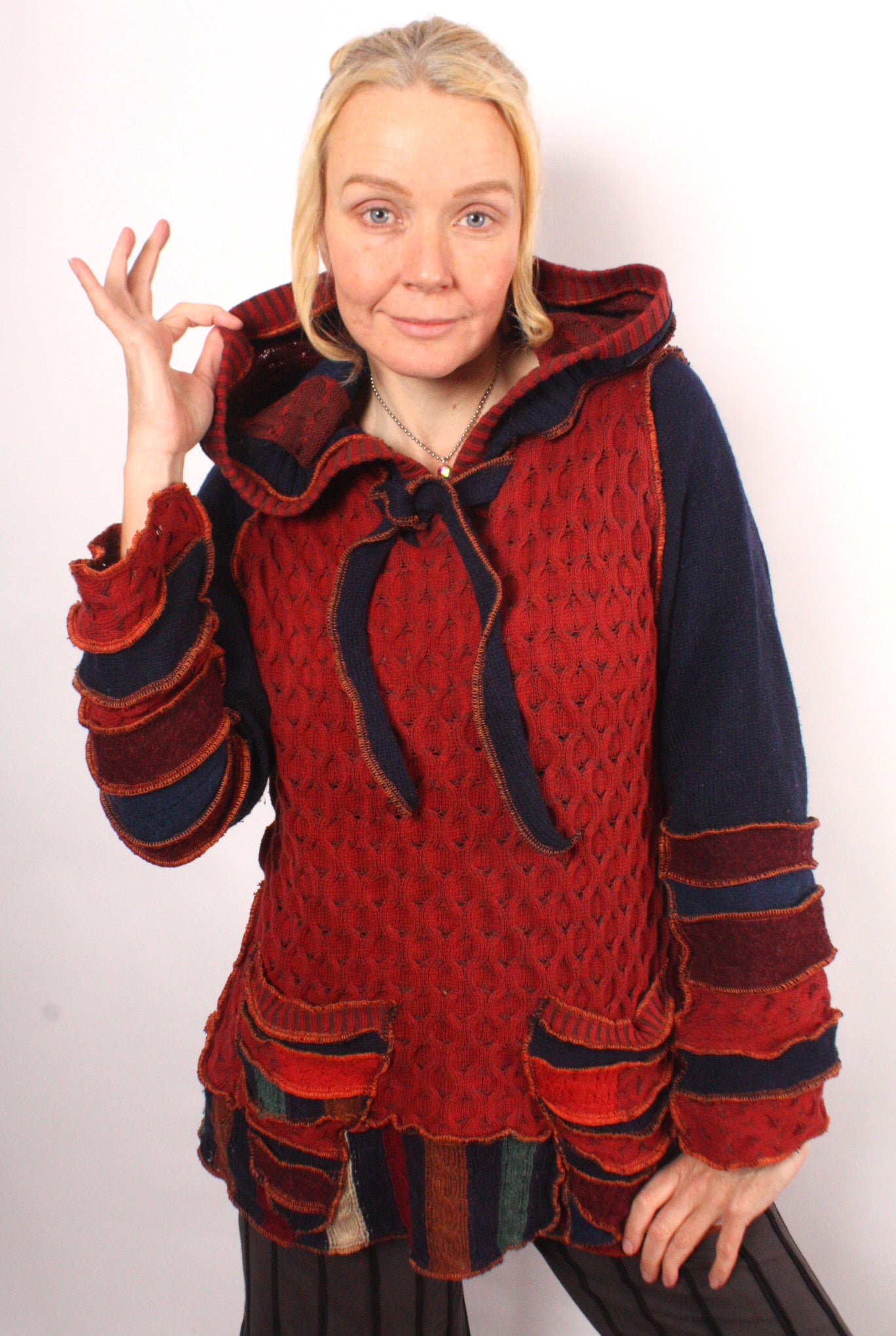 Each Katwise sweater is one-of-a-kind, sewn by me in my attic. They are perfectly imperfect, sometimes borderline wonky. They are all upcycled from sweaters I find in my vast thrift shopping expeditions. There is a huge variety in the texture and stretchiness of these knits, so no two are ever quite alike.