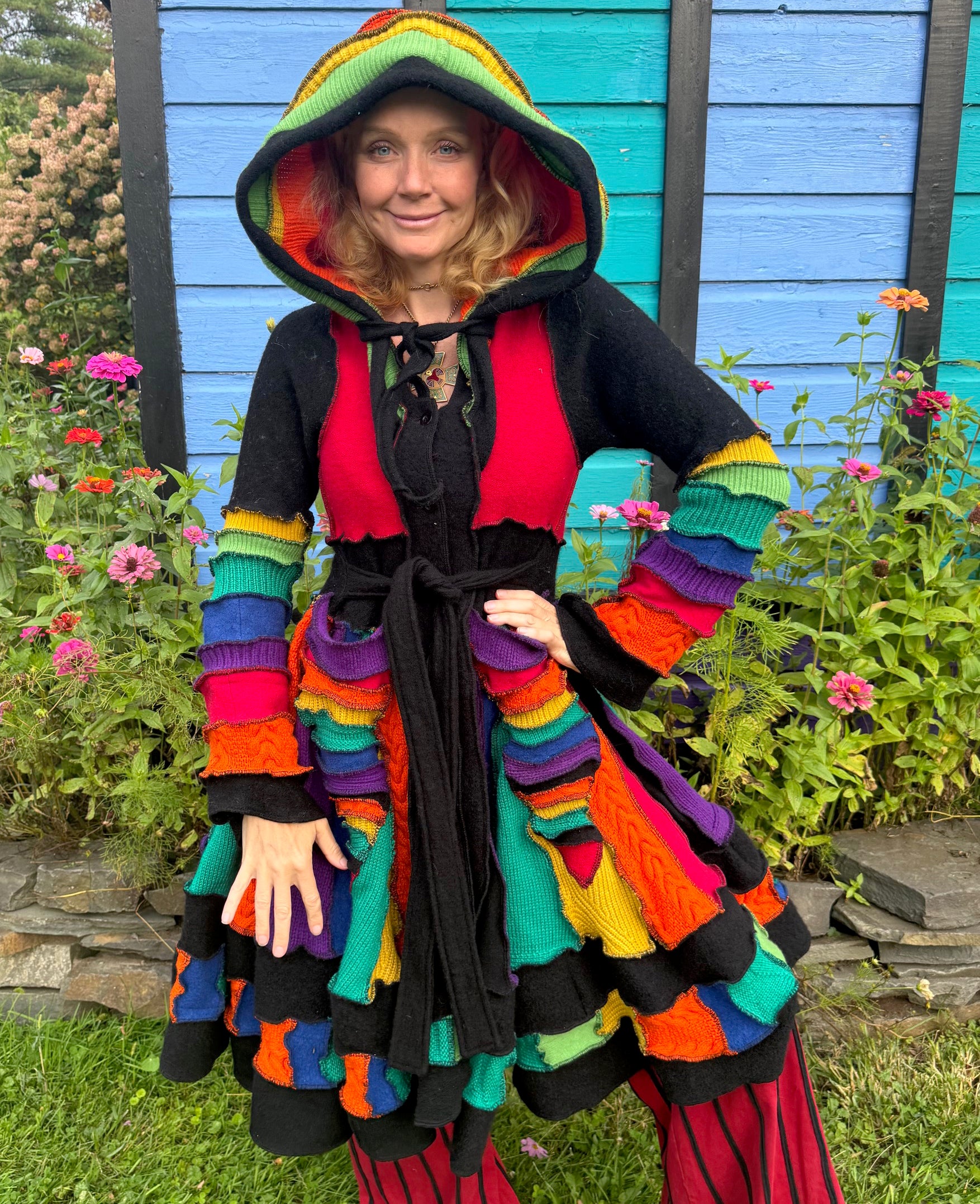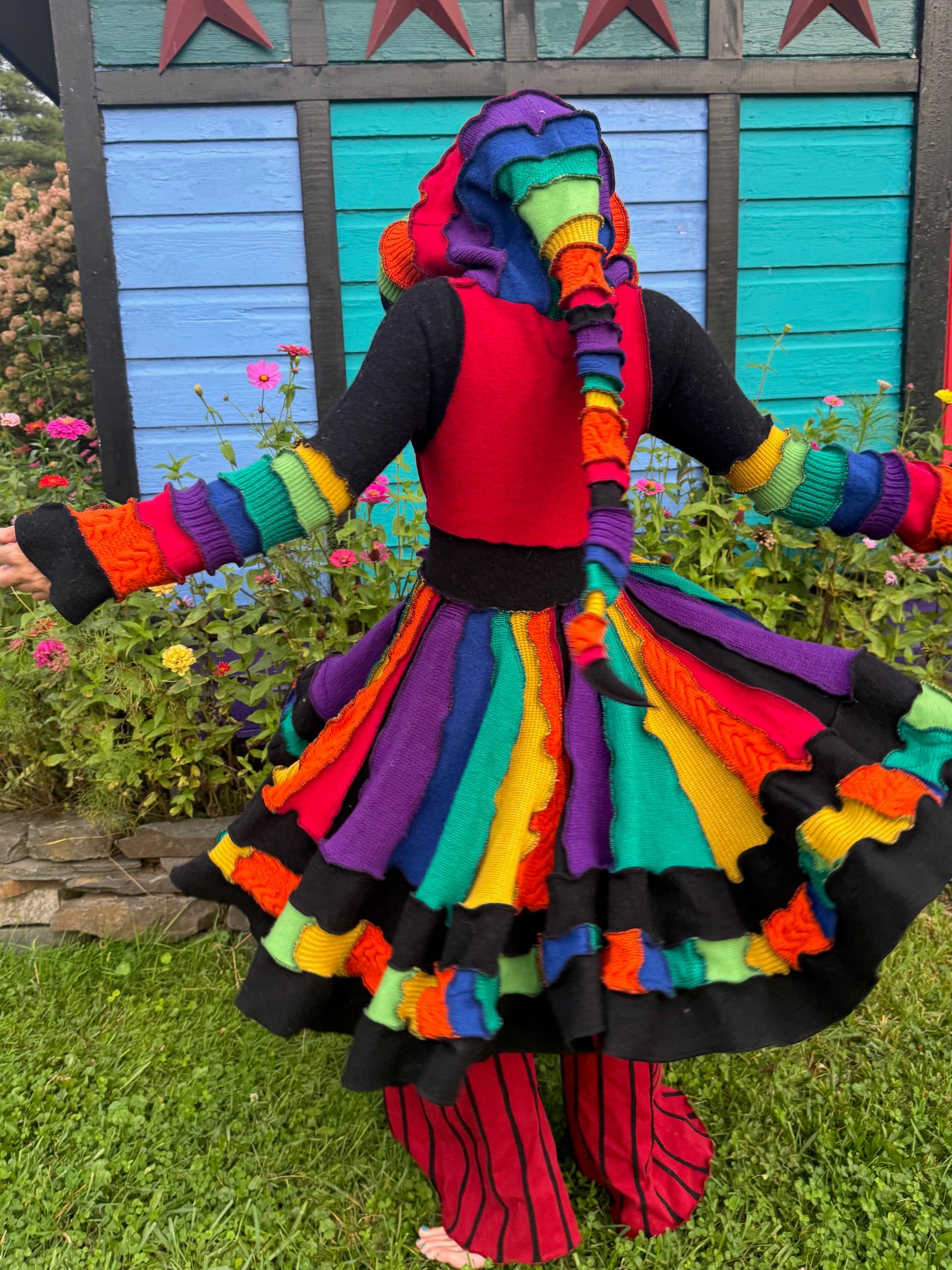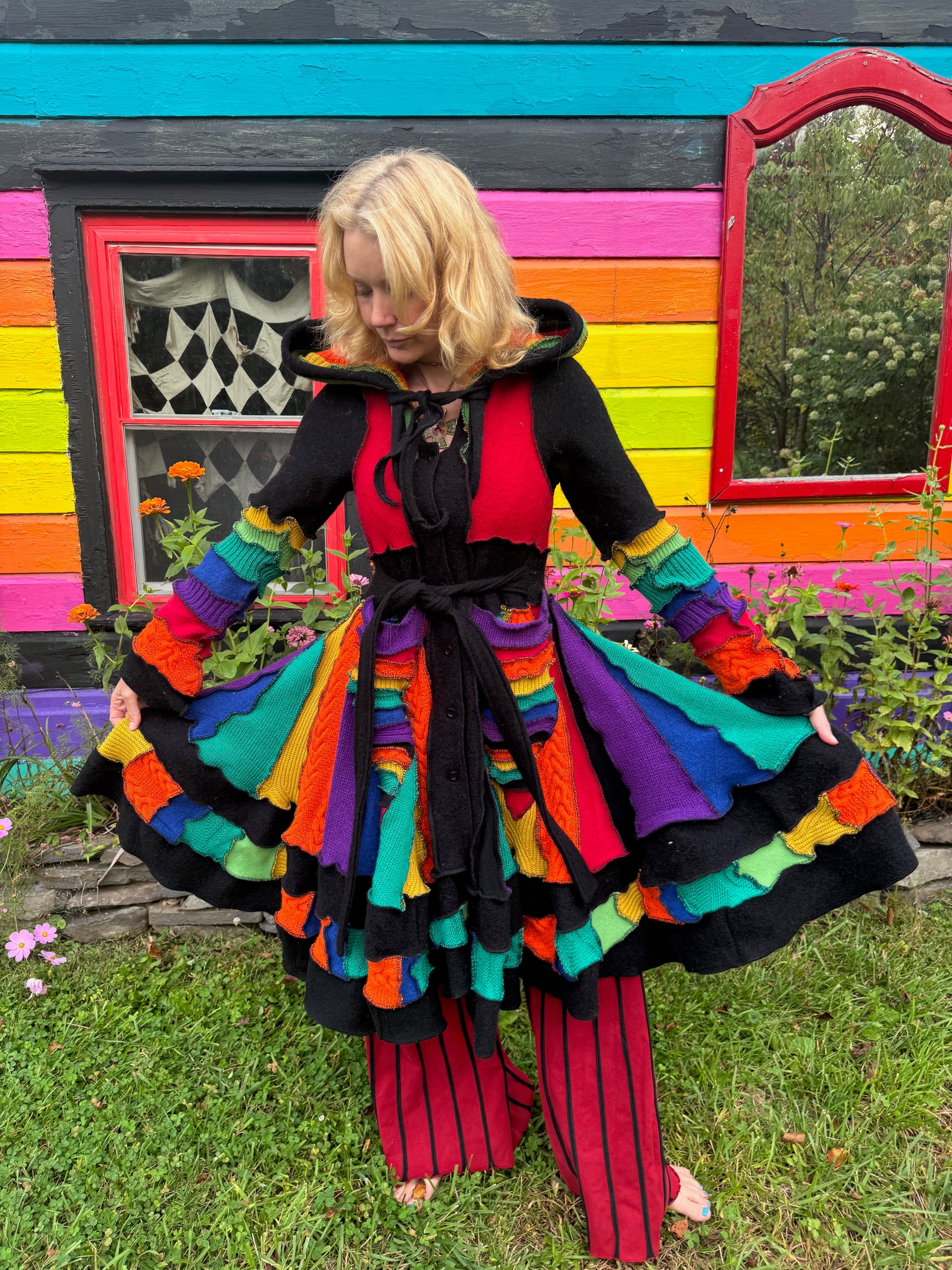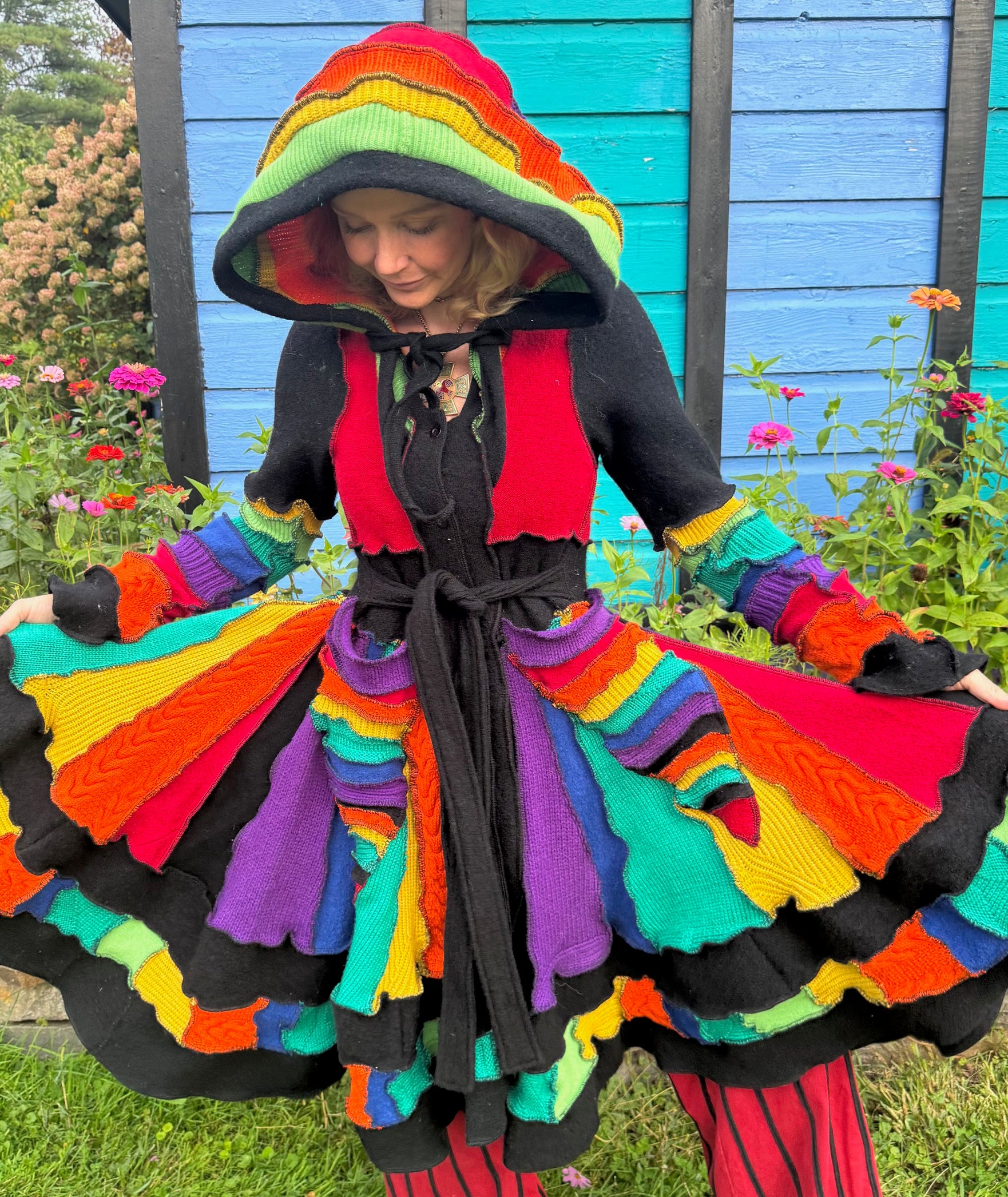 Calliope is a perfect rainbow coat full of joyful bold hues and a long button front. An epic poem of color, it's extra full for extra twirliness!