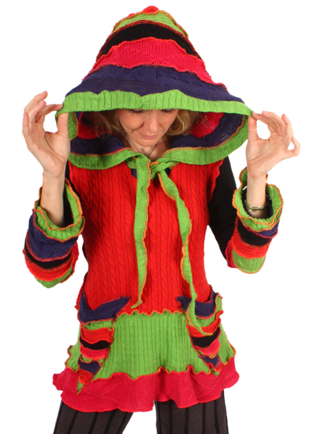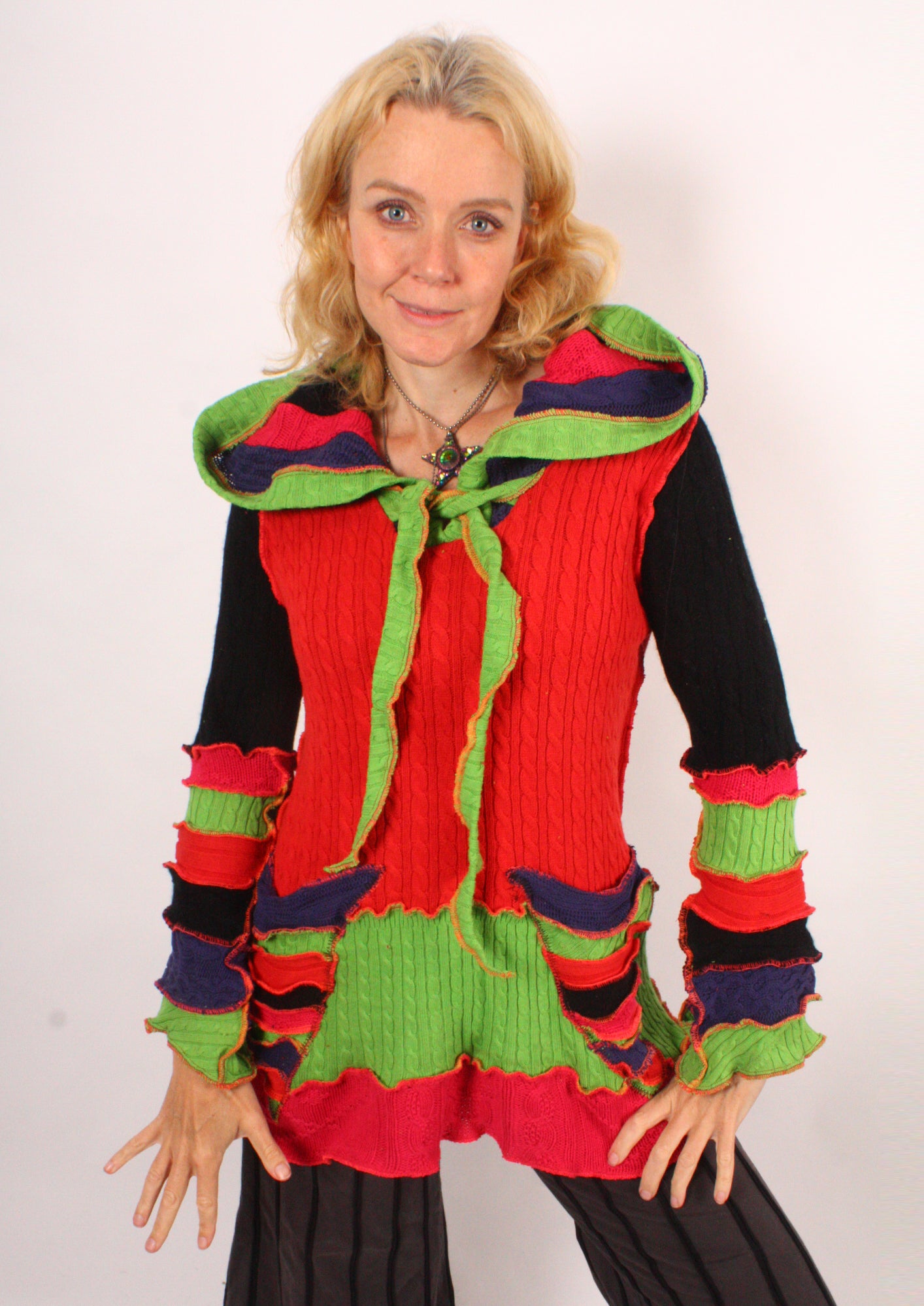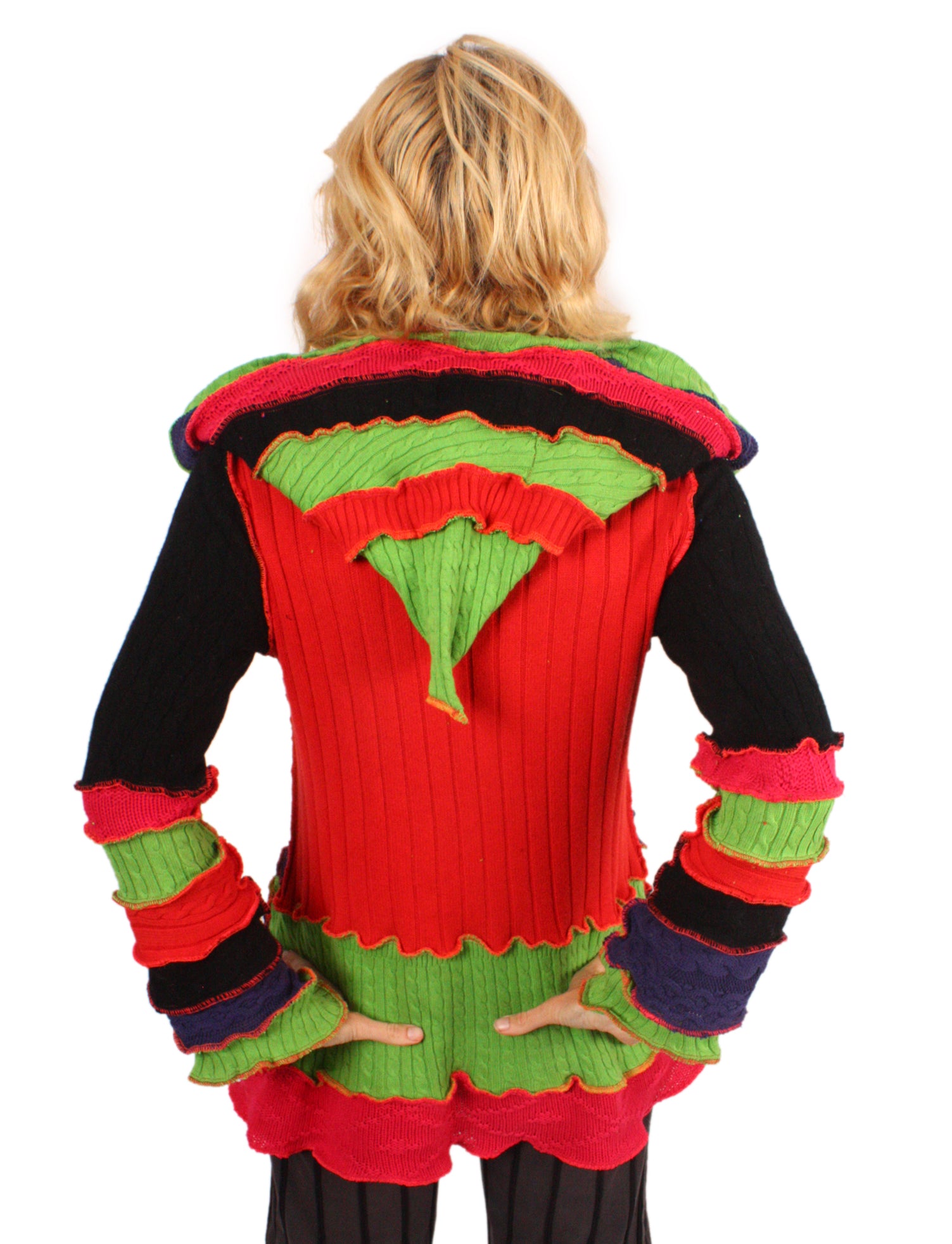 Each Katwise sweater is one-of-a-kind, sewn by me in my attic. They are perfectly imperfect, sometimes borderline wonky. They are all upcycled from sweaters I find in my vast thrift shopping expeditions. There is a huge variety in the texture and stretchiness of these knits, so no two are ever quite alike.