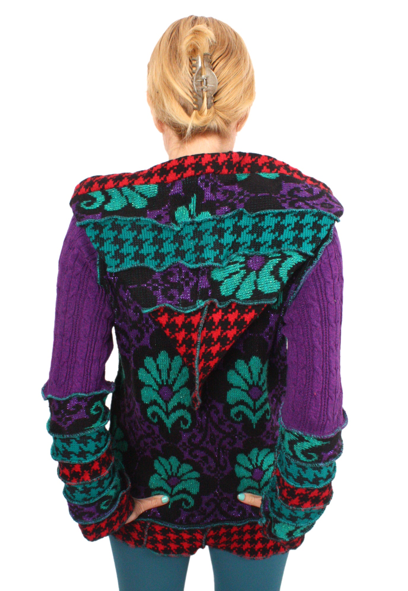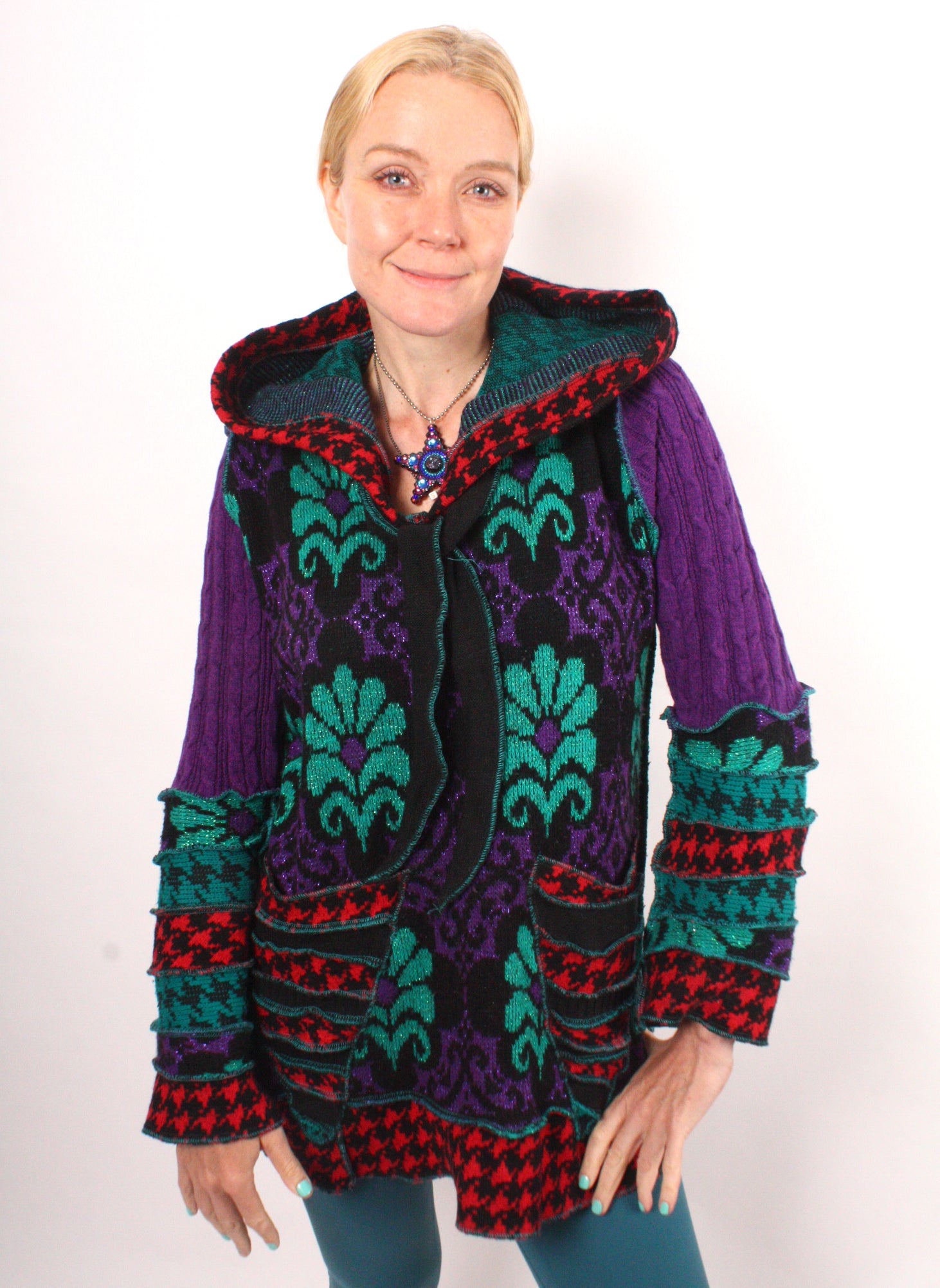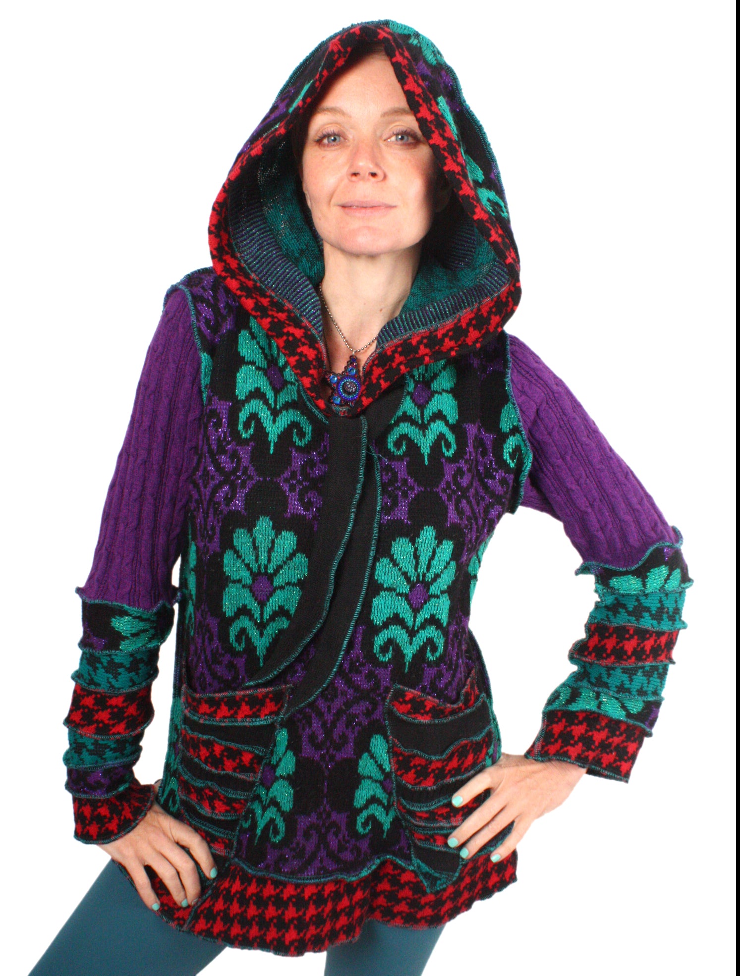 Each Katwise sweater is one-of-a-kind, sewn by me in my attic. They are perfectly imperfect, sometimes borderline wonky. They are all upcycled from sweaters I find in my vast thrift shopping expeditions. There is a huge variety in the texture and stretchiness of these knits, so no two are ever quite alike.