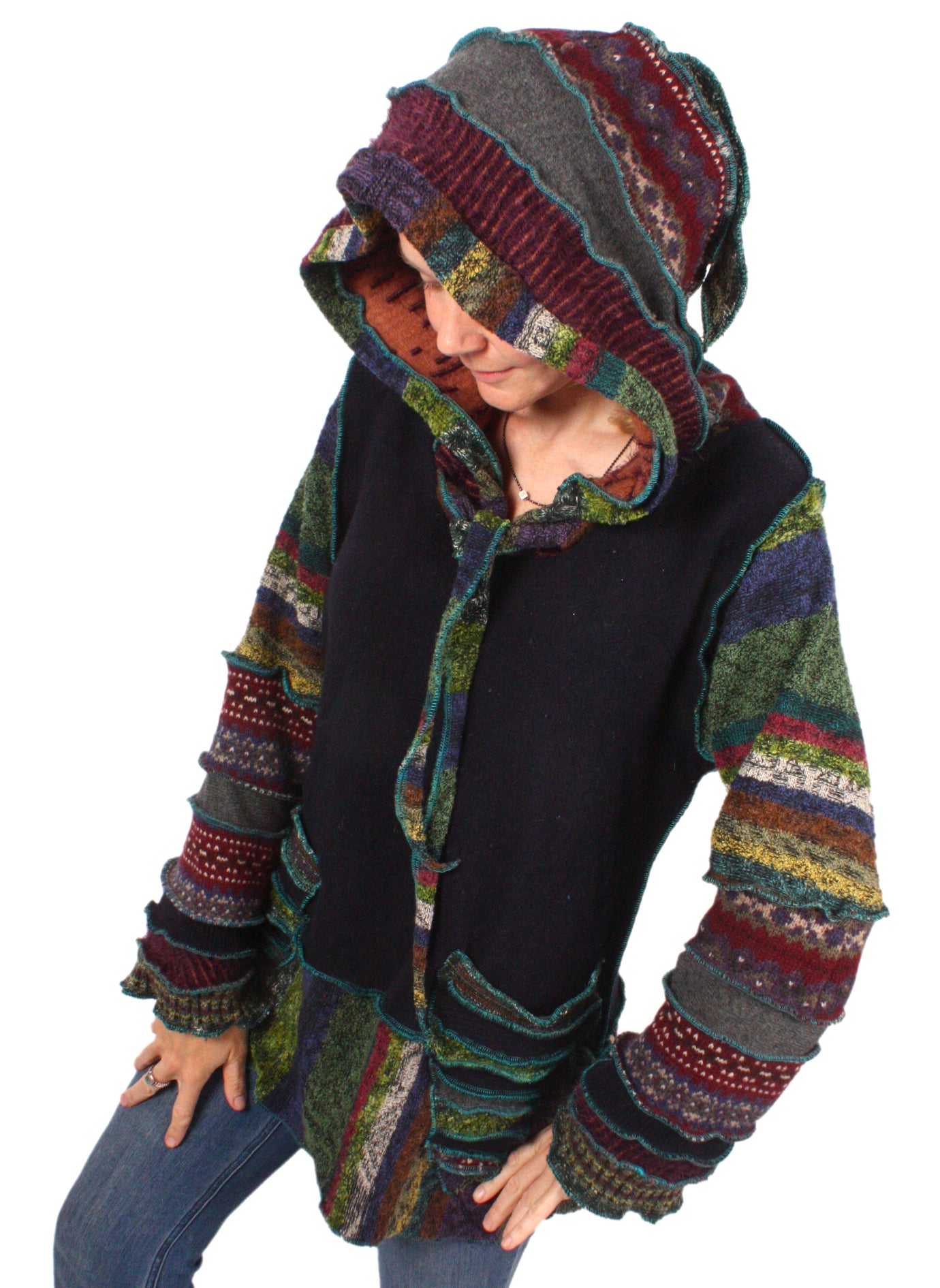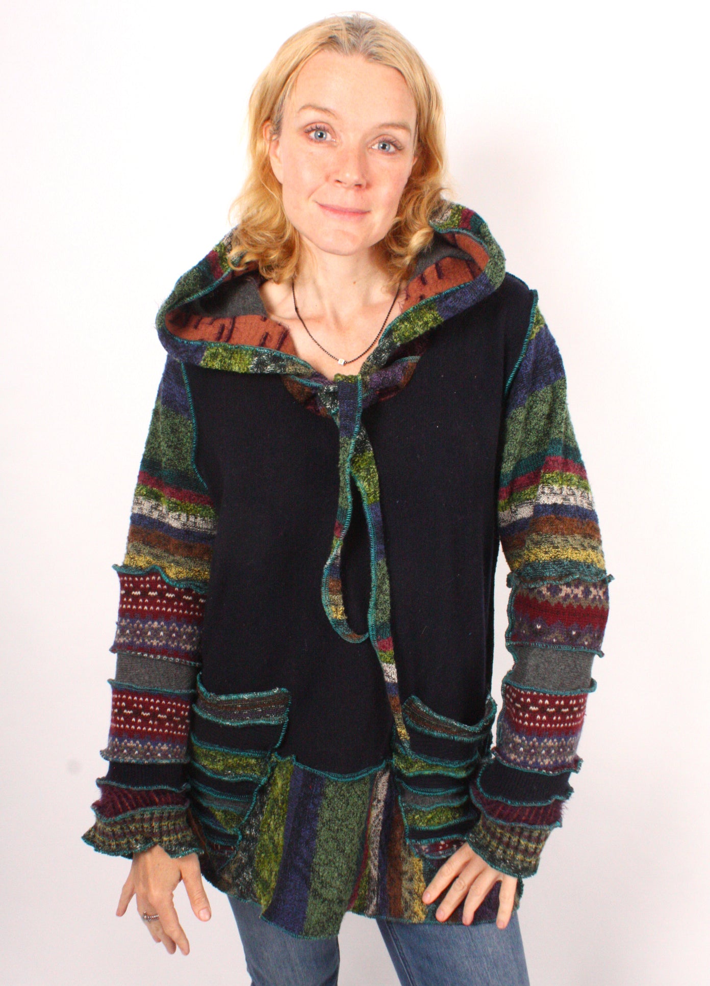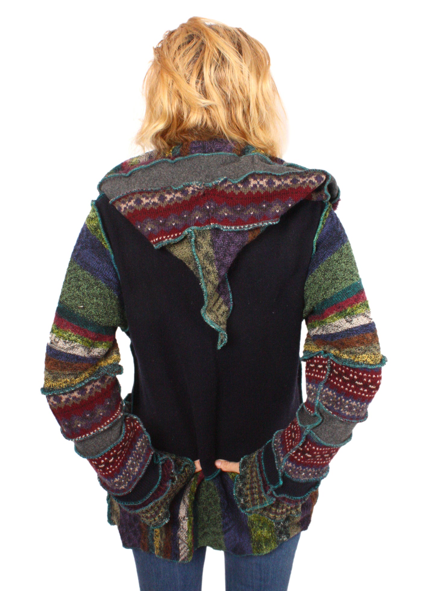 Each Katwise sweater is one-of-a-kind, sewn by me in my attic. They are perfectly imperfect, sometimes borderline wonky. They are all upcycled from sweaters I find in my vast thrift shopping expeditions. There is a huge variety in the texture and stretchiness of these knits, so no two are ever quite alike.