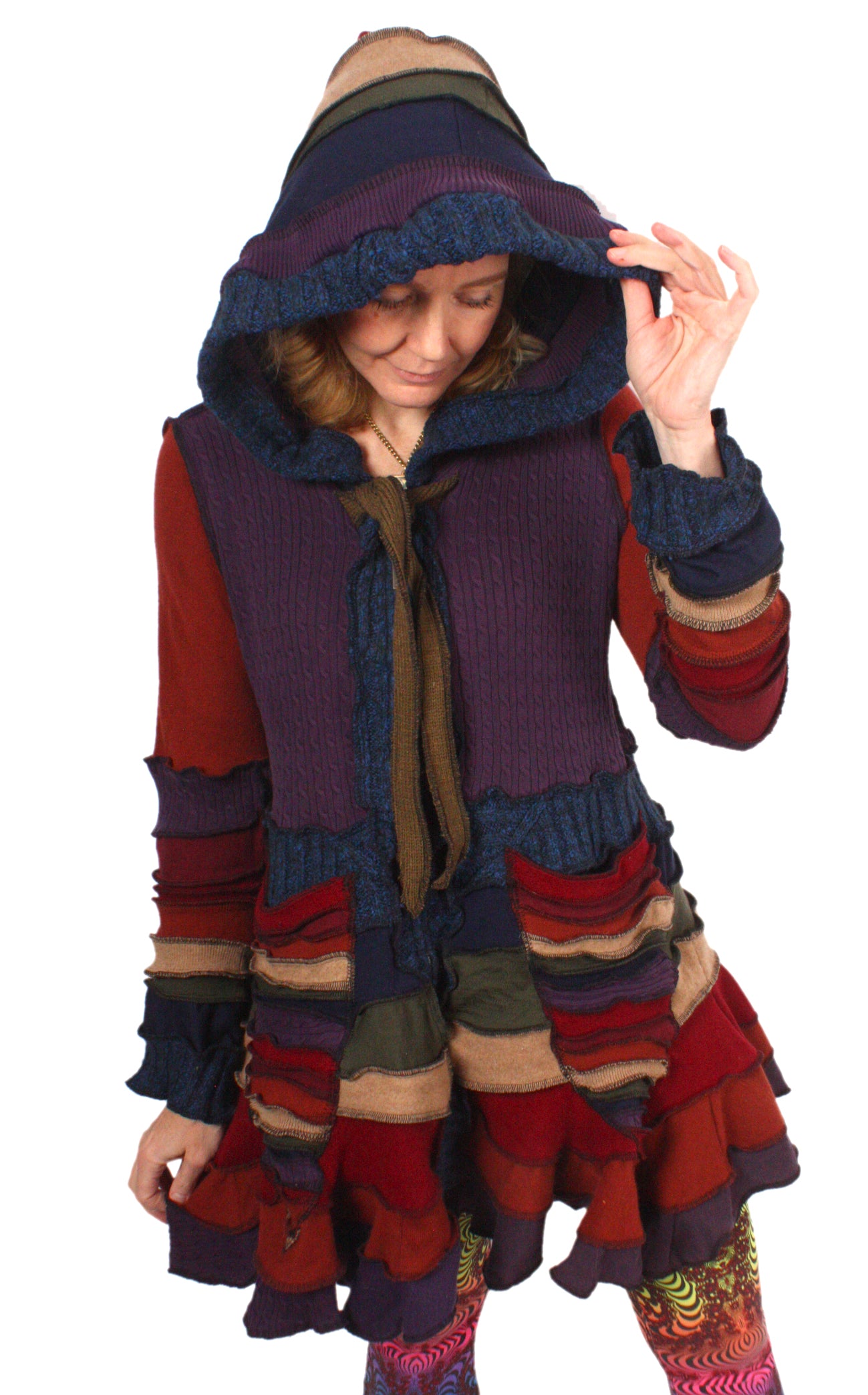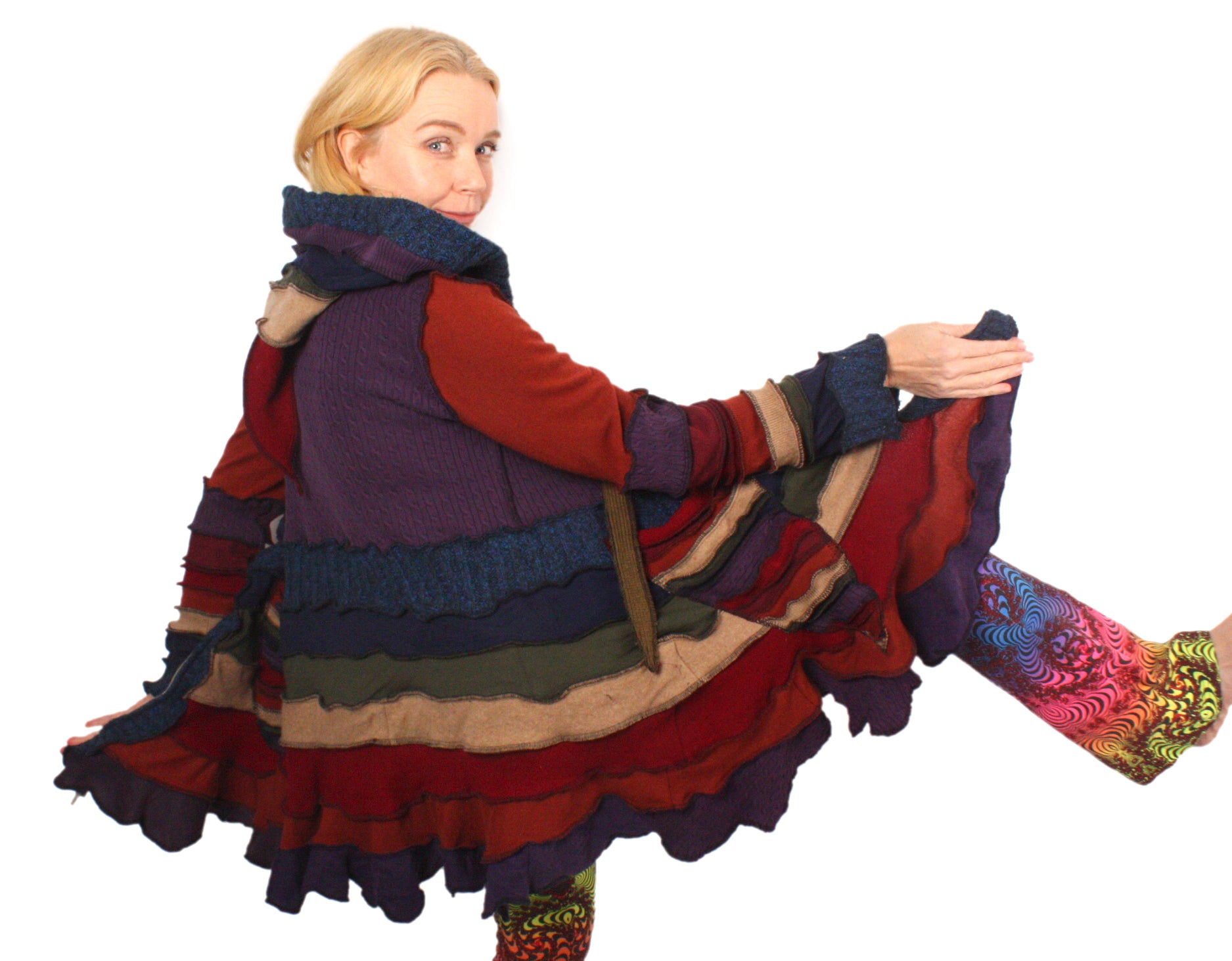 Flouncy Coats are fun and twirly with lots of bouncy ruffles. I use lots of lightweight soft stretchy knits that make these very comfy and easy to wear, while still being extravagantly cheerful.