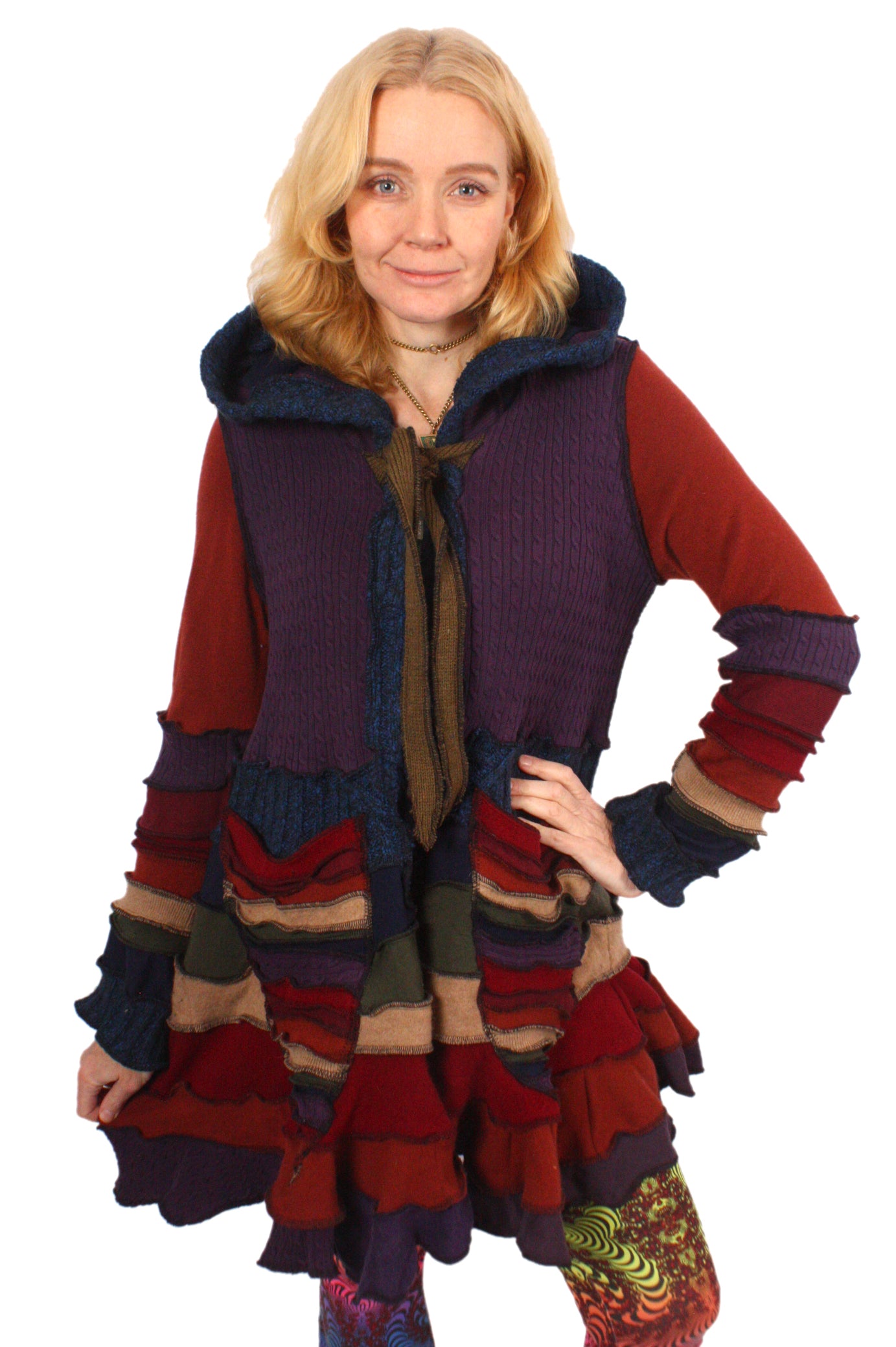 Thelxinoe is a deep forest rainbow flouncy with a purple cotton bodice and merino/cashmere accents. It features a double-zipper front.